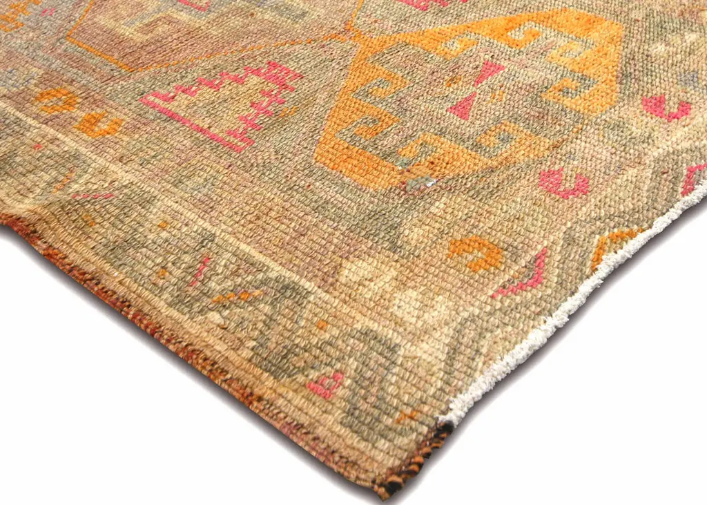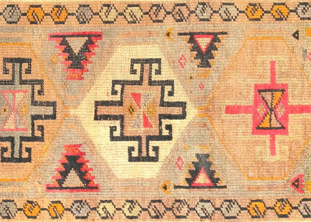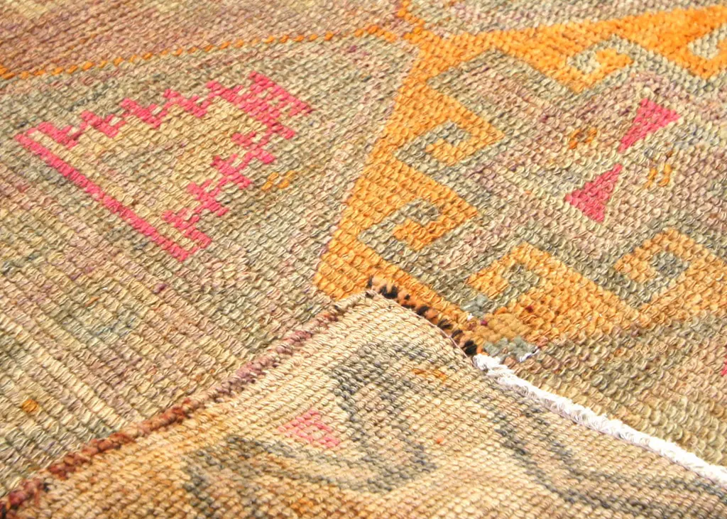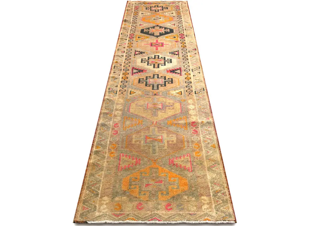 1960s Turkish Oushak Runner. Handwoven with wool on wool foundation in the Oushak region of Western Turkey. The Anatolian plateau is where the weaving of oriental carpets originated. Rich in tradition and pride, each of the villages of the area produced a certain design and colors that the neighbors rarely copied. These Antiques were largely illustrated in historical European painting. Their bold geometrical designs and soft colors made them favorites of interior designers.