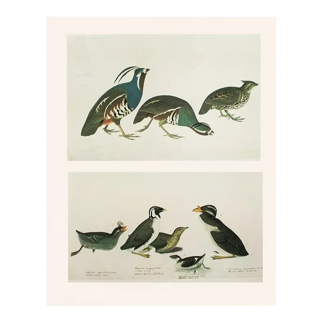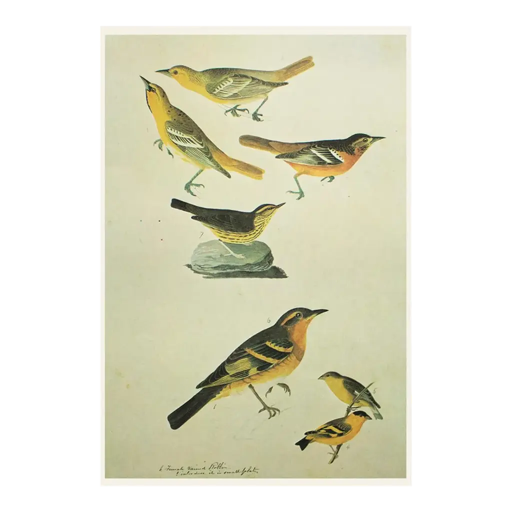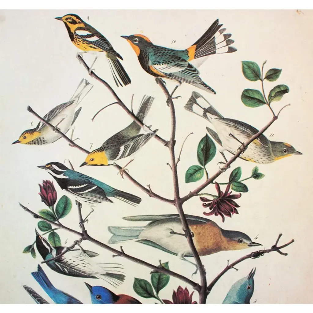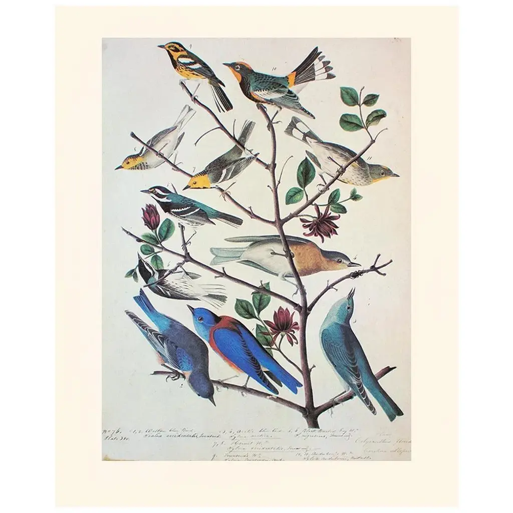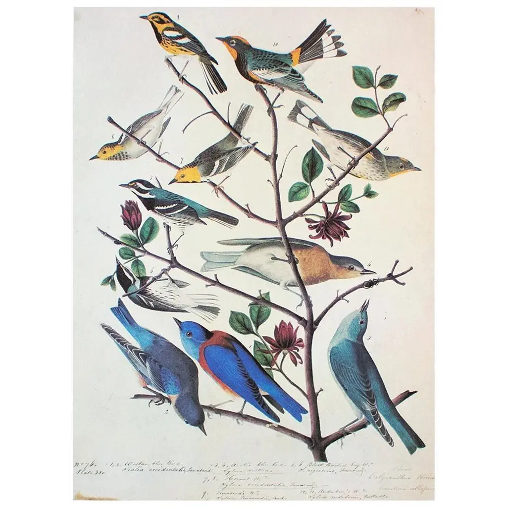 A stunning vintage Cottage or Farmhouse Style reproduction of the original lithographic print of Townsend's Warbler, Arctic Bluebird, Mountain Bluebird, and Western Bluebird After John James Audubon. Comes from The Birds of America book by Audubon, published in the U.S. in 1966. Signed in the print. Very detailed. Colors are beautiful. Excellent condition - minor edge wear, never framed.