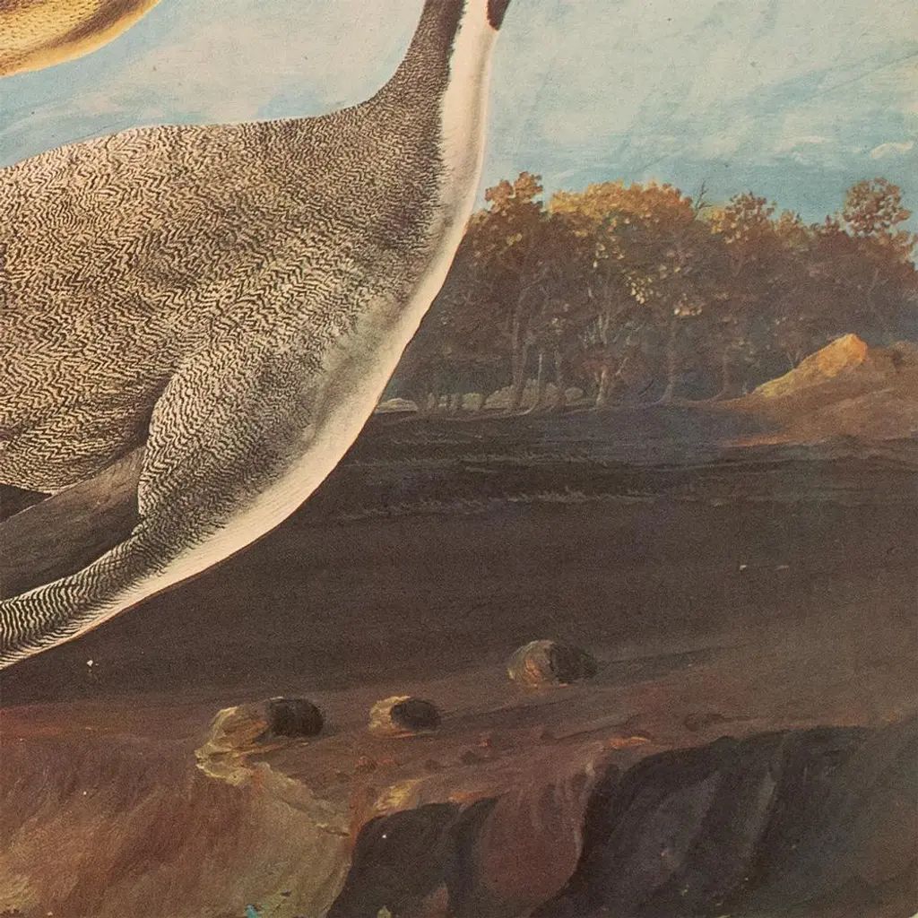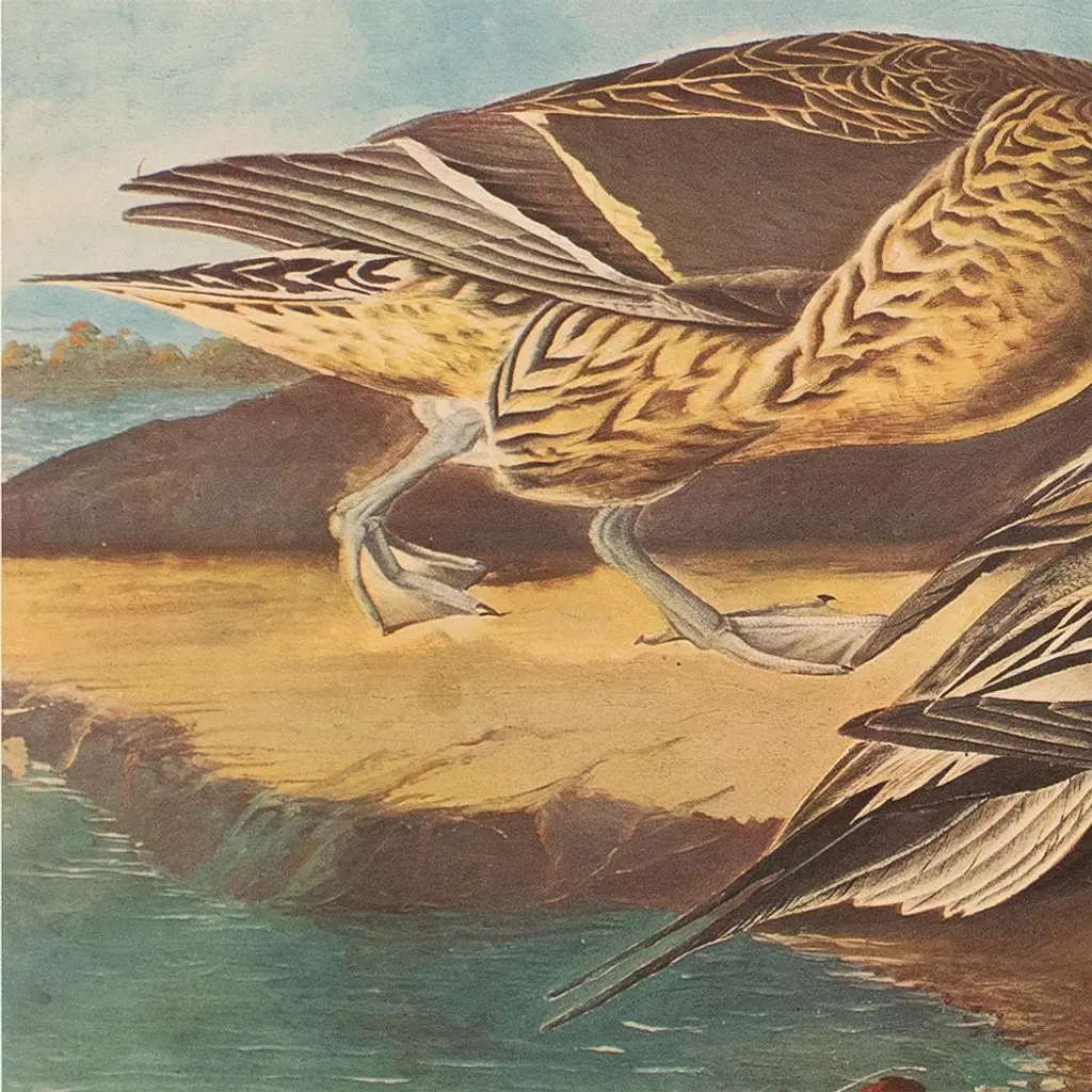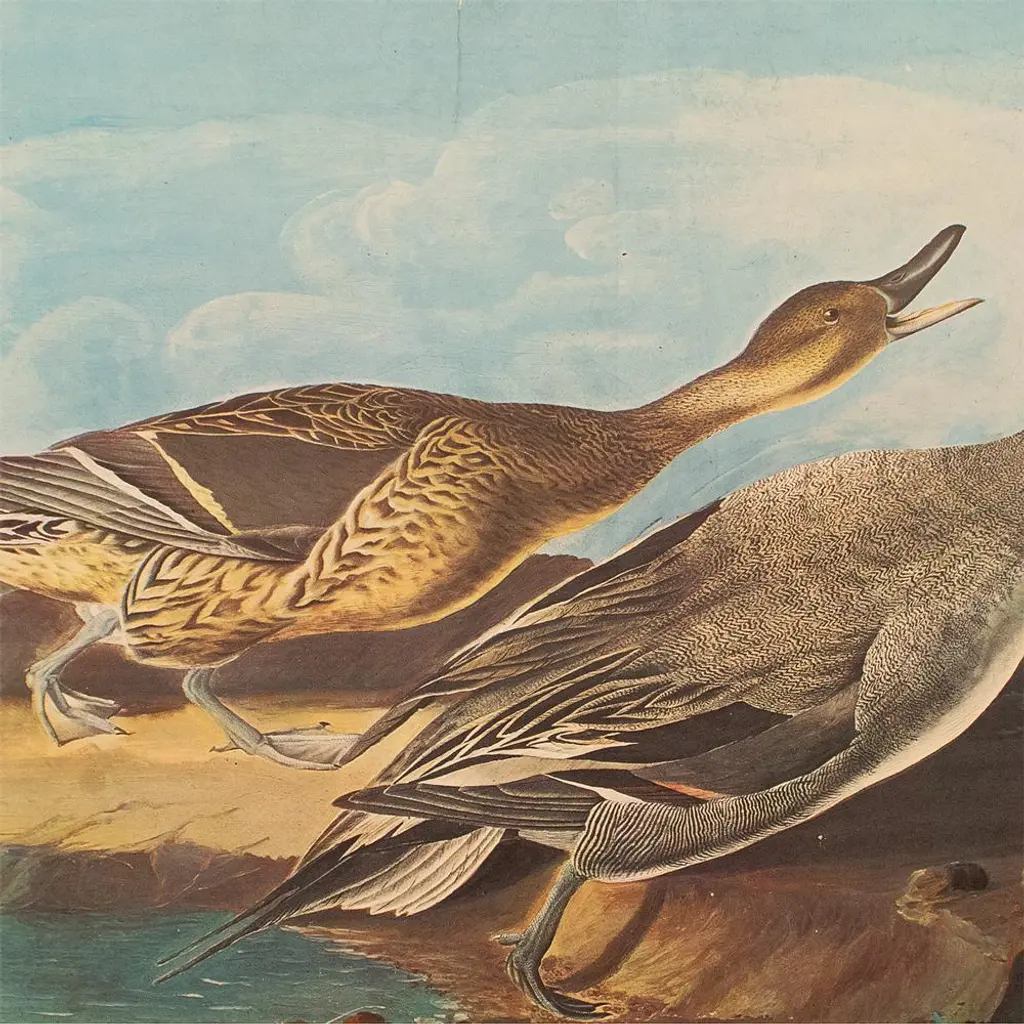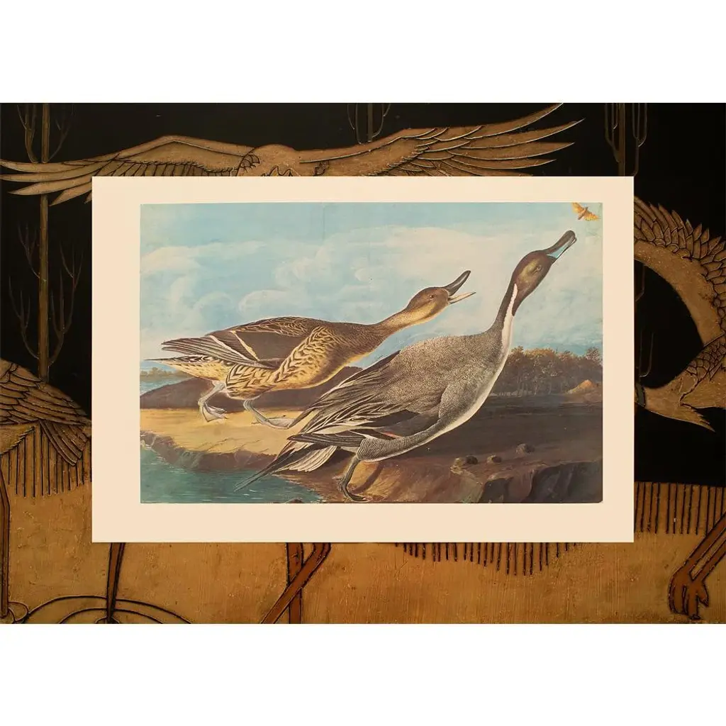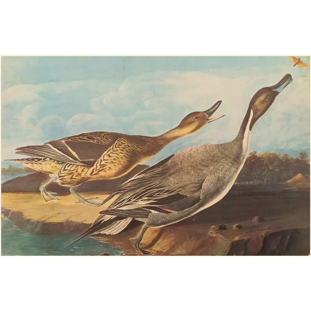 A stunning extra large vintage Cottage Style reproduction of the original lithographic print of Pin-Tail Ducks chasing a Butterfly After John James Audubon. This fold-out piece comes from The Birds of America book by Audubon, published in 1966. Very detailed. Beautiful deep colors. Excellent condition - a light fold through the center, minor edge wear, never framed. We will ship it to you in a tube for safe delivery. Overall 20"W x 13.25"H