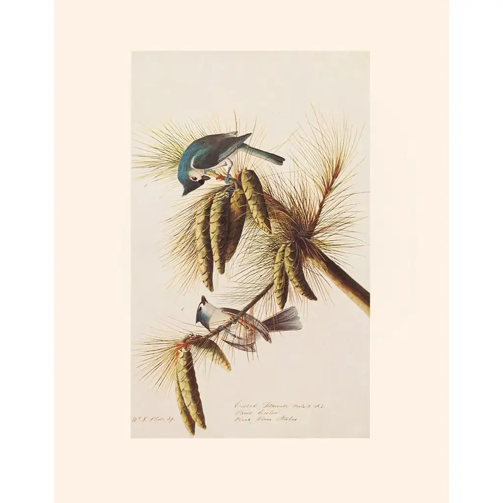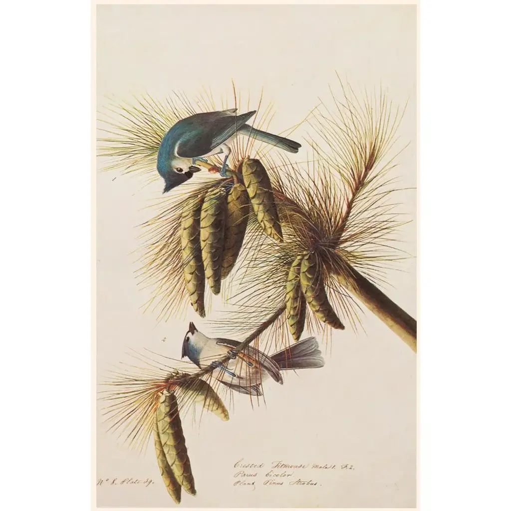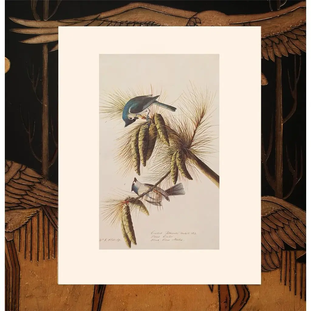 A stunning vintage American Classical, Traditional, Rustic, Farmhouse, Cottage or Chinoiserie Style reproduction of the original lithographic print of Tufted or Crested Titmouse After John James Audubon. Comes from The Birds of America book by Audubon, published in the U.S. in 1966. Signed in the print. Very detailed. Excellent condition - minor edge wear, never framed. Overall 10.25"W x 13.25"H Image 6.25"W x 10"10"H