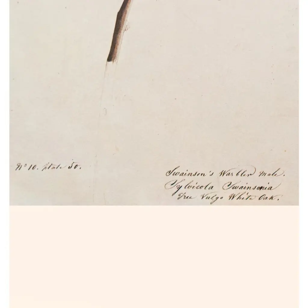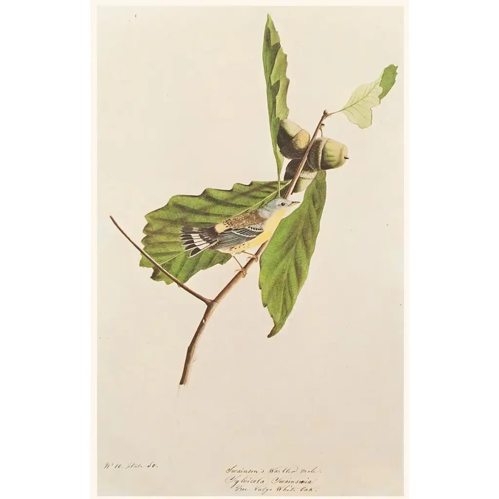 A stunning vintage American Classical, Traditional, Farmhouse or Cottage Style reproduction of the original lithographic print of Swainson's Warbler on White Oak Tree branch After John James Audubon. Comes from The Birds of America book by Audubon, published in 1966. Signed in the print. Very detailed. Excellent condition - never framed. Overall: 10.25"W x 13.25"H