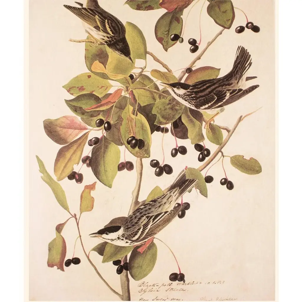 A stunning vintage American Classical, Traditional, Cottage or Farmhouse Style reproduction of the original lithographic print of Black-Poll Warbler After John James Audubon. Comes from The Birds of America book by Audubon, published in 1966. Signed in the print. Very detailed. Beautiful soft colors. Excellent condition - never framed. Overall: 10.25"W x 13.25"H