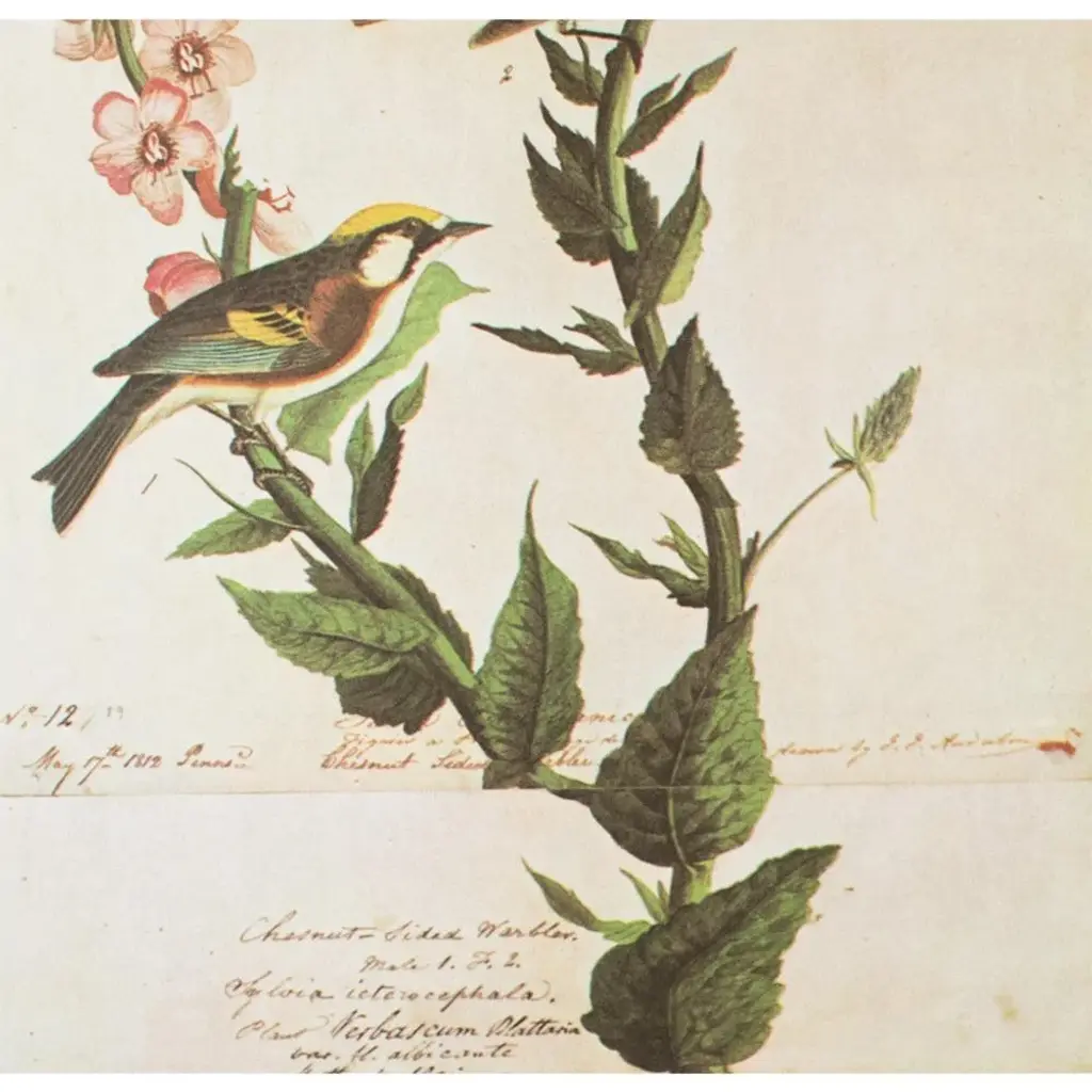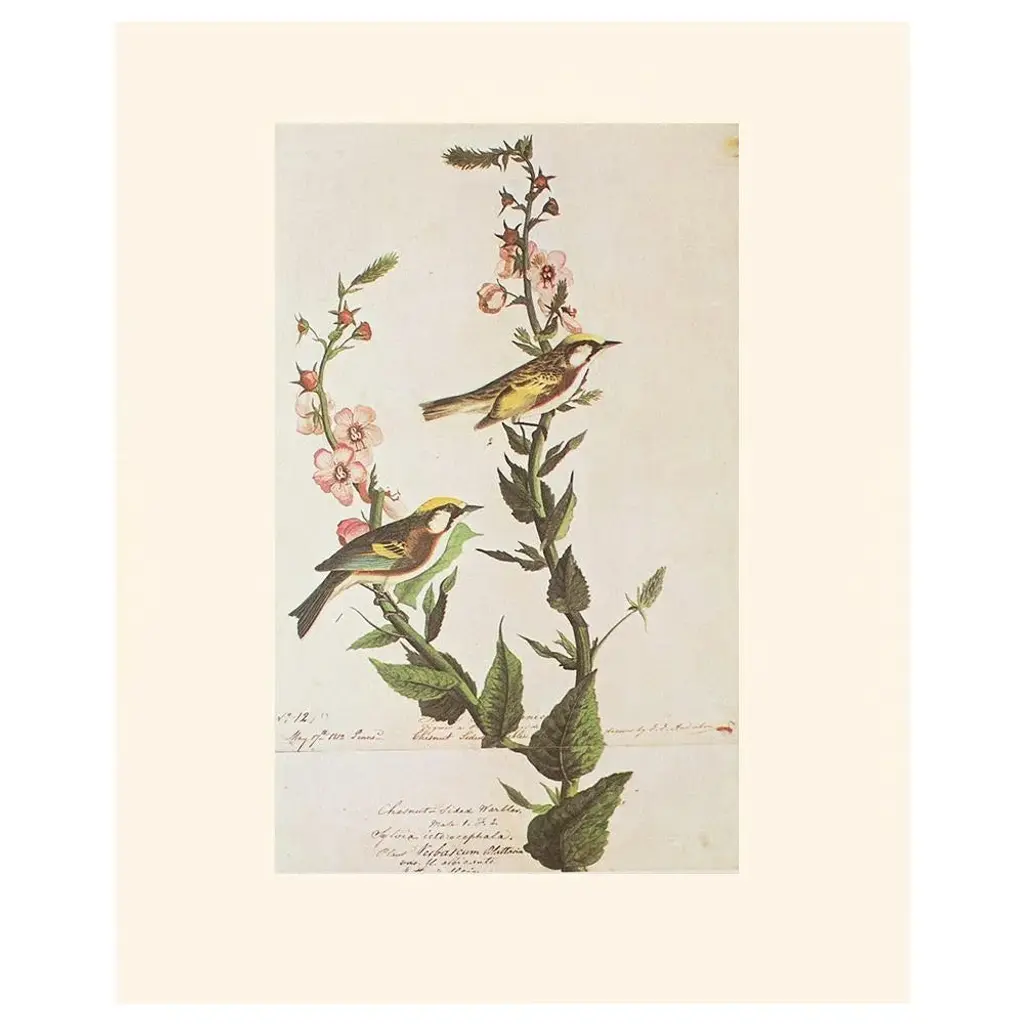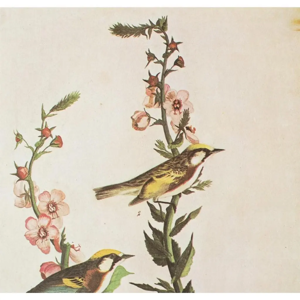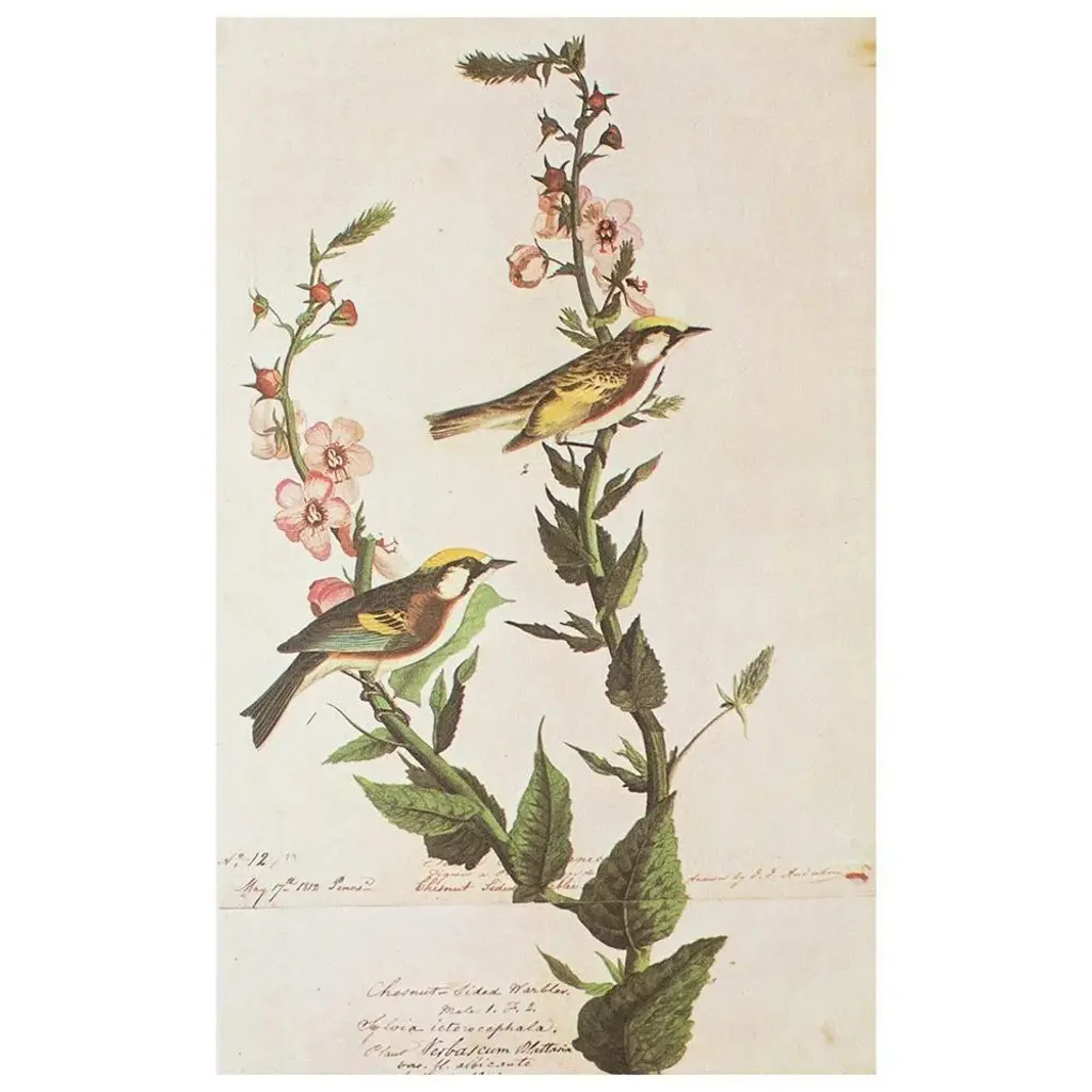 A lovely vintage Cottage, Farmhouse, Rustic, English Traditional or American Classical Style reproduction of the original lithographic print of Chestnut-Sided Warbler After John James Audubon. Comes from The Birds of America book by Audubon, published in the U.S., in 1966. Signed in the print. Very detailed. Soft neutral colors. Dark spots which you see on the images are not foxing, they are in the print as on the original artwork. Excellent condition - minor edge wear, never framed. Overall: 10.25"W x 13.25"H