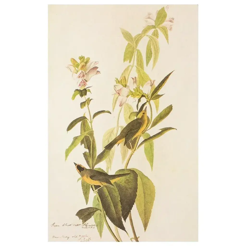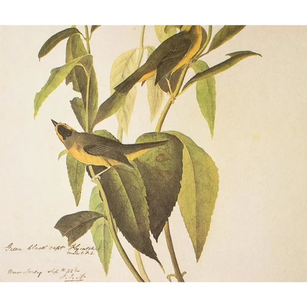 A stunning vintage Cottage, Farmhouse, Rustic, Traditional or American Classical Style reproduction of the original lithographic print of Green Black-capped Flycatcher and Wilson's Warbler After John James Audubon. Comes from the Birds of America book by Audubon, published in the U.S., in 1966. Signed in the print. Very detailed. Warm colors. Excellent condition - minor edge wear, never framed.