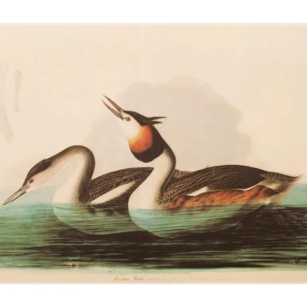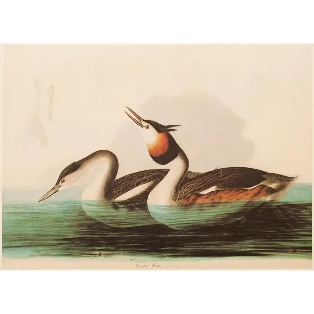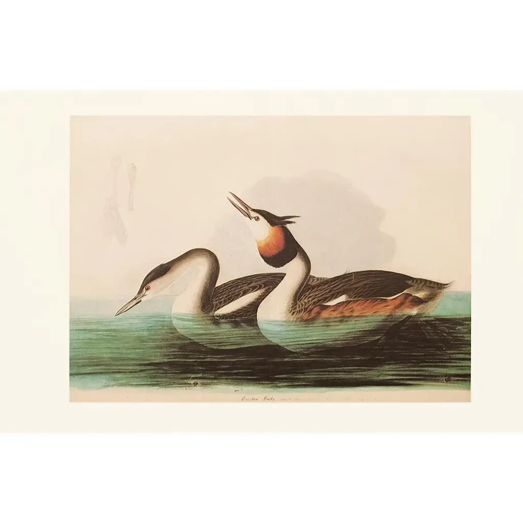 A beautiful extra large vintage reproduction of the original lithographic print of Crested Grebe After John James Audubon from his Birds of America book published in 1966. This vintage print has size of the original watercolor unlike many other prints of Audubon art. Excellent condition - minor edge wear, a fold through the center, never framed. The mark on the left top corner is not a stain, it's a mark of brush on original watercolor. U.S., 1966. We will ship it to you in a tube for safe delivery. Overall 20"W x 13.25"H