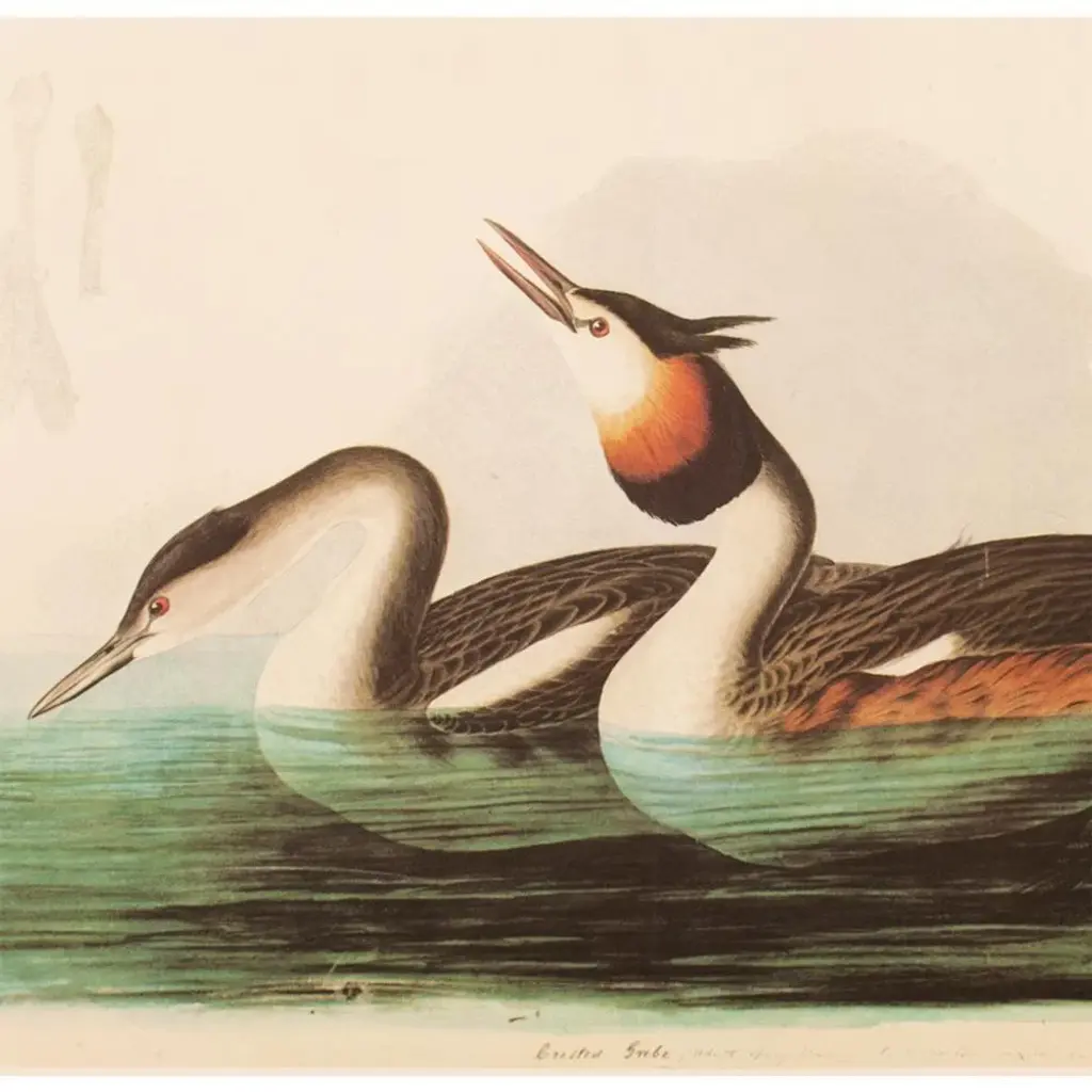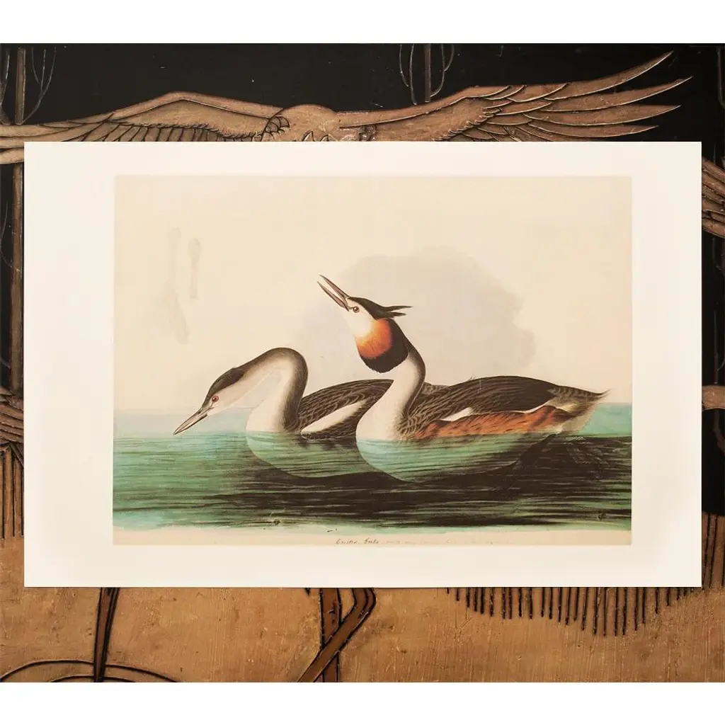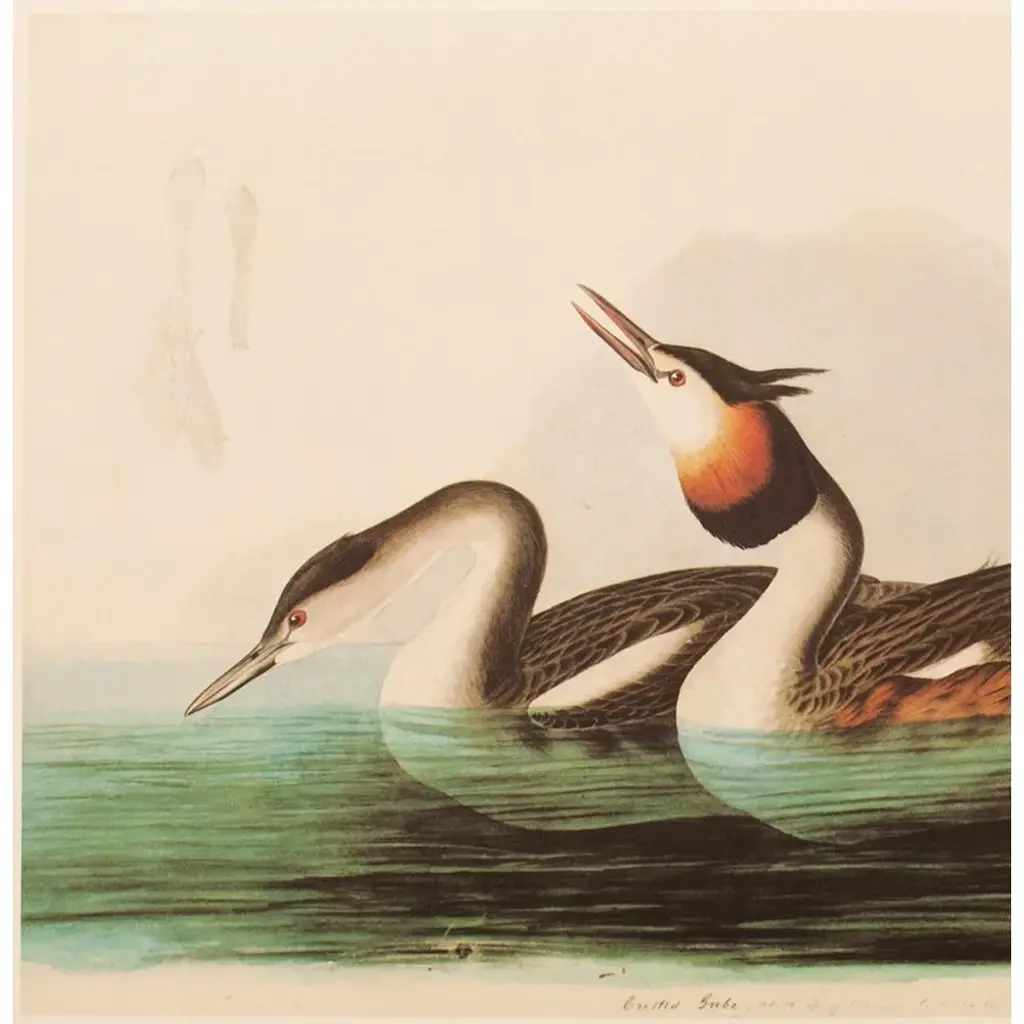 A beautiful extra large vintage reproduction of the original lithographic print of Crested Grebe After John James Audubon from his Birds of America book published in 1966. This vintage print has size of the original watercolor unlike many other prints of Audubon art. Excellent condition - minor edge wear, a fold through the center, never framed. The mark on the left top corner is not a stain, it's a mark of brush on original watercolor. U.S., 1966. We will ship it to you in a tube for safe delivery. Overall 20"W x 13.25"H