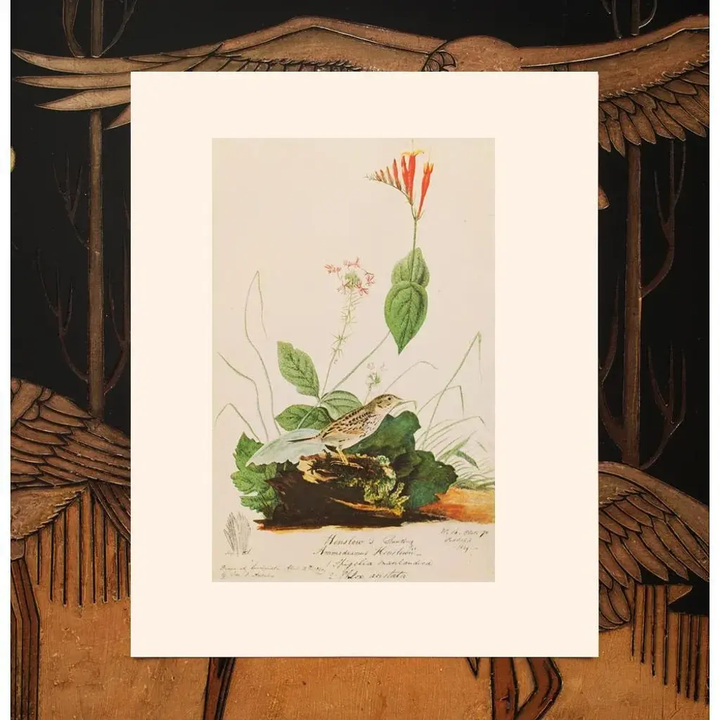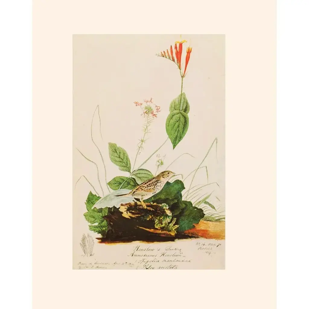 A stunning vintage American Classical, English Traditional, Farmhouse, Cottage or Chinoiserie Style reproduction of the original lithographic print of Henslow's Sparrow After John James Audubon. Comes from The Birds of America book by Audubon, published in 1966. Signed in the print. Very detailed. Neutral colors. Excellent condition - never framed. Overall: 10.25"W x 13.25"H
