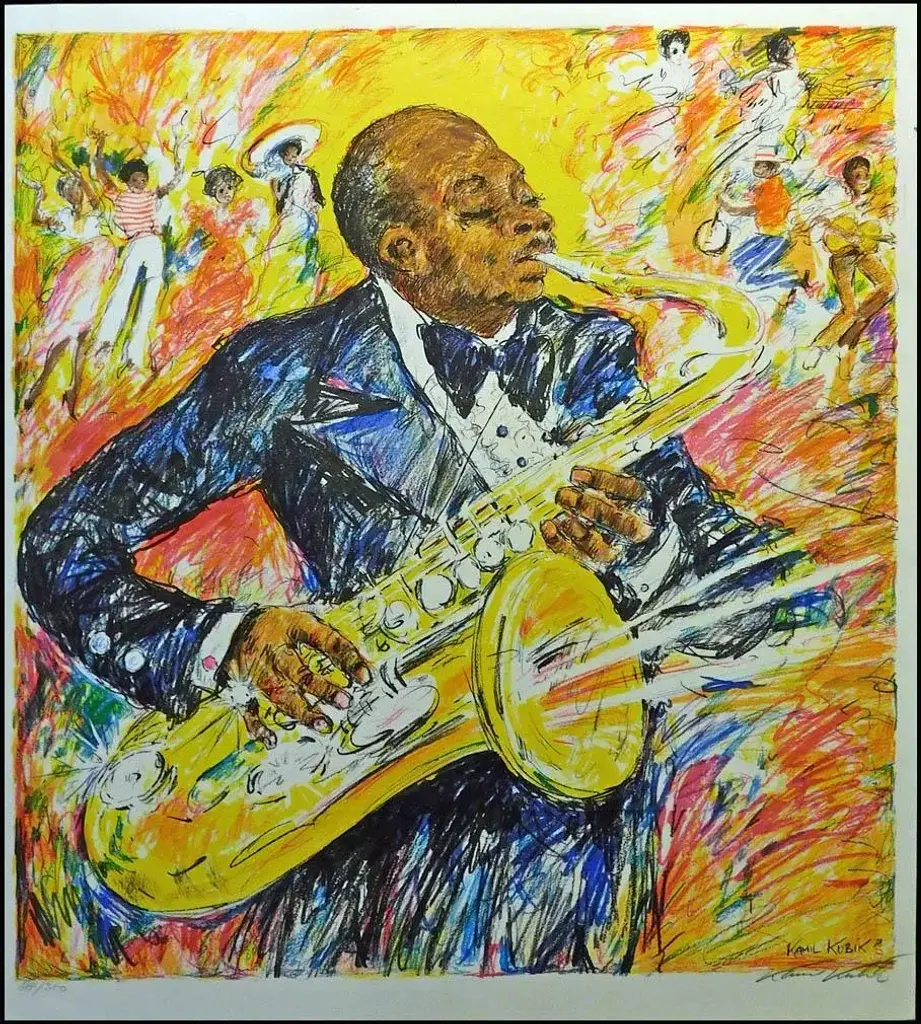 "Jazz Musician" by Kamil Kubik Limited Edition Lithograph Art Print on Arches Paper Hand signed by the artist Size: 29" x 25" Edition Size: 350 (email us for exact edition#) Circa 1980s Condition is Mint 100 percent guarantee of authenticity Certificate of Authenticity is included KAMIL KUBIK Contemporary Czechoslovakian Painter The street scenes of Kamil Kubik are executed in the true impressionist tradition. Painting outdoors, Kubik is inspired by ever-changing nature, and the interactions with passers-by as he works. Some of Kubik's best-known works include shimmering scenes of parks in London, New York City and Paris. He has also painted unusual interpretations of such architectural giants as the U.S. Capitol, Notre Dame Cathedral, the Louvre Museum and London?s Big Ben. Kubik has said of his art: "I try to speak to the man who must sweat when he works, who wants to come home to something beautiful after a day of honest labor." Kubik achieves this beauty by approaching each street scene with a fresh eye, using pastels to create a complex surface, rich with the texture of quick light strokes. His colors are as lively as his line, perhaps a reflection of the inspiration he draws from the spontaneity and excitement of the children who invariably gather around him when he is working outside. Kubik was born in Czechoslovakia in 1930 to an artistic family. He began his formal art training in Prague, but when the Communists seized power in 1949, he escaped, starting along journey of study and work around the world. Kubik did set design in Australia, and painted portraits in London and San Francisco. His works are owned by collectors on five continents including the collections of Mrs. Lyndon B. Johnson, Mr. And Mrs. John V. Lindsay, Paul Mellon, Count de La Lanne-Mirrlees and Robert Sarnoff.