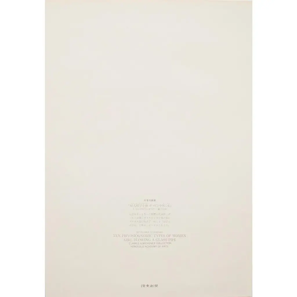 An excellent reproduction of Kitagawa Utamaro woodblock print Girl Blowing a Glass Pipe from series Ten Physiognomic Types of Women. One of the original woodblocks by the famous Japanese artist of the Edo period is located at James A. Michener Collection, Honolulu Academy of Art. Published in Japan in 1980s. Heavy paper, copy in Japanese and English on the back. Excellent condition, never framed, like new, but feels almost like original woodblock print. Superb quality. Comes from 50 year old collection of Asian Art in Japan. Japan, 1980s.