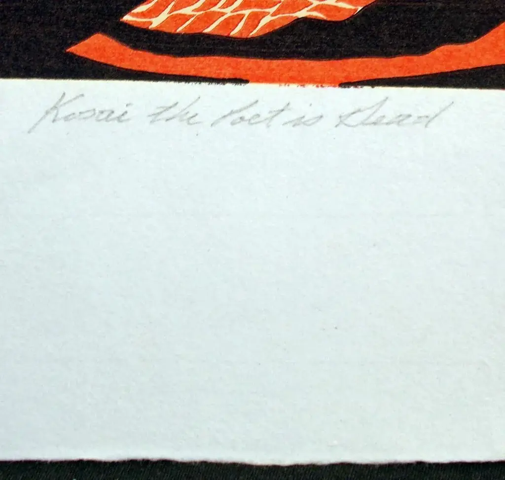 1980s "Kosai The Poet Is Dead" Hand Signed Woodcut Art Print By Philip Smith