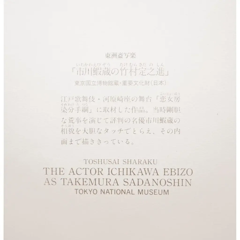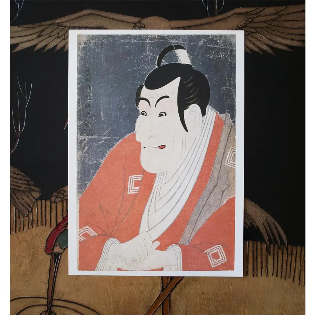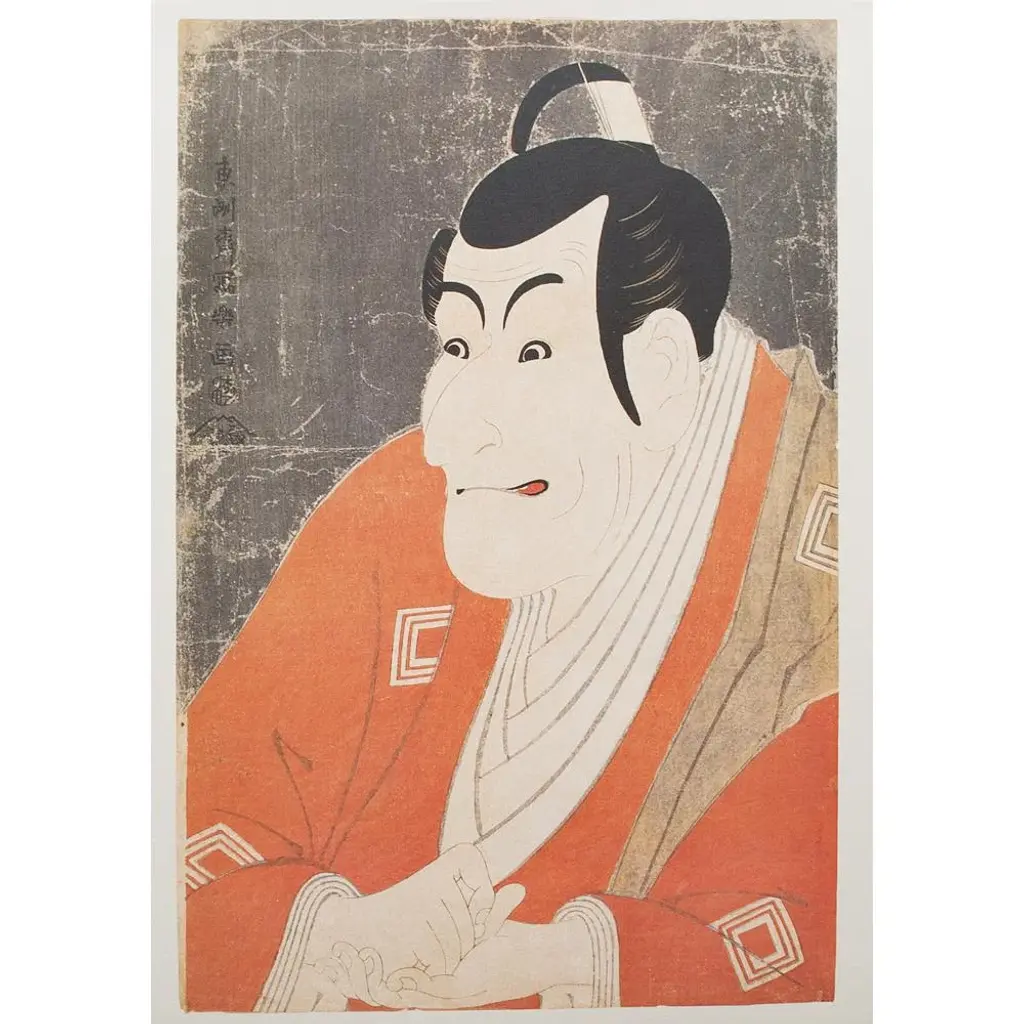 An excellent reproduction of Tōshūsai Sharaku woodblock print depicting Kabuki Actor Ichikawa Ebizo as Takemura Sadanoshin. One of the original woodblocks by the great Japanese artist is located at Tokio National Museum. Published in Japan in 1980s. Heavy paper, copy in Japanese and English on the back. Comes from 50 years old collection of Asian Art in Japan. Excellent condition, never framed, like new, but feels almost like original woodblock print. Japan, 1980s.
