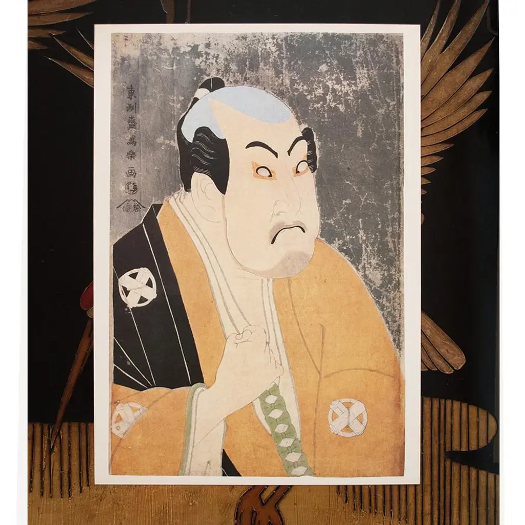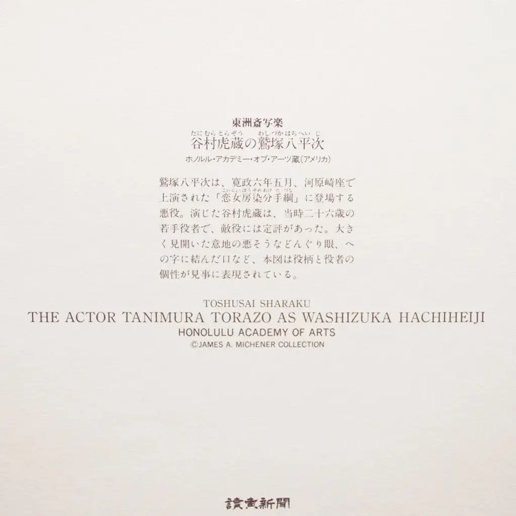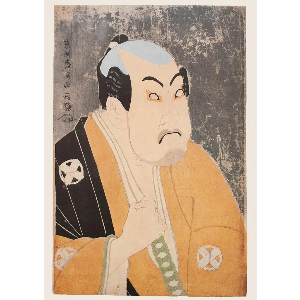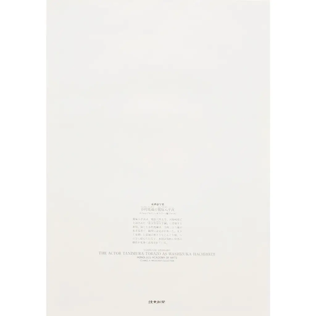An excellent reproduction of Tōshūsai Sharaku woodblock print depicting The Kabuki Actor Tanimura Torazo as Washizuka Hachiheiji. One of the original woodblocks by the great Japanese artist of the Edo period is located at Honolulu Academy of Arts, James A. Michener Collection. Published in Japan in 1980s. Heavy paper, copy in Japanese and English on the back. Comes from 50 years old collection of Asian Art in Japan. Excellent condition, never framed, like new, but feels almost like original woodblock print. Japan, 1980s.
