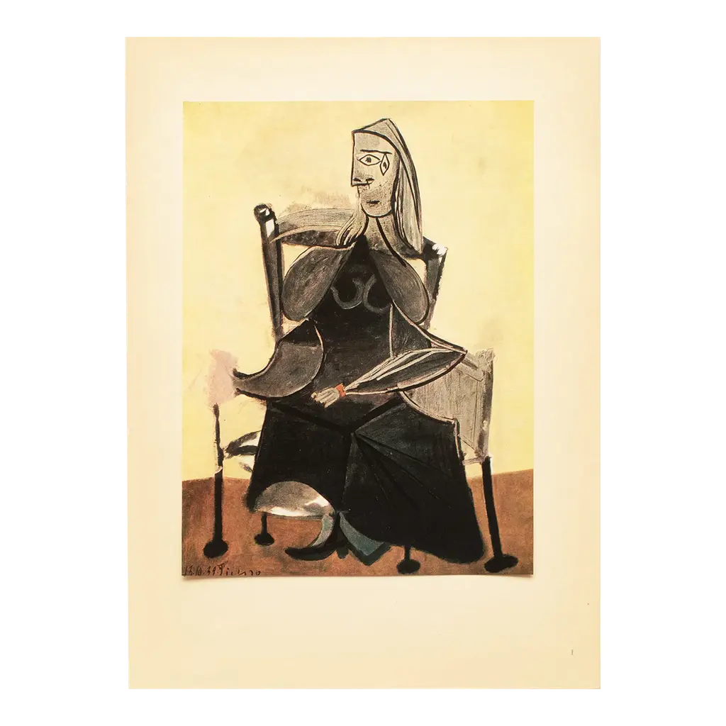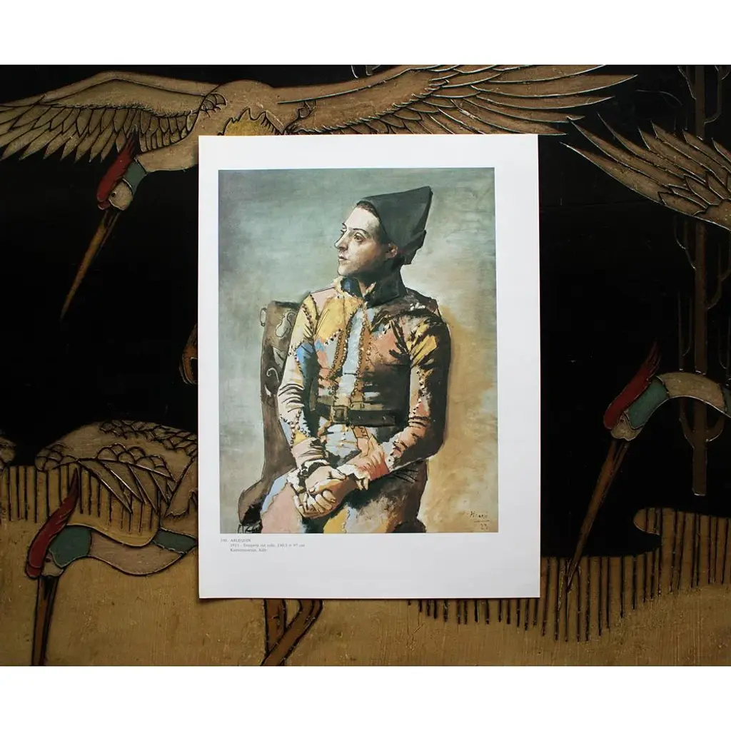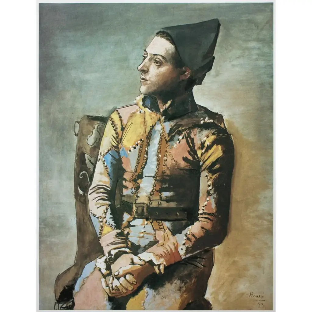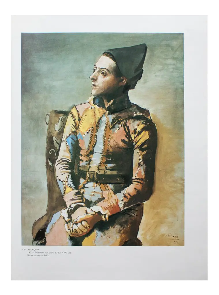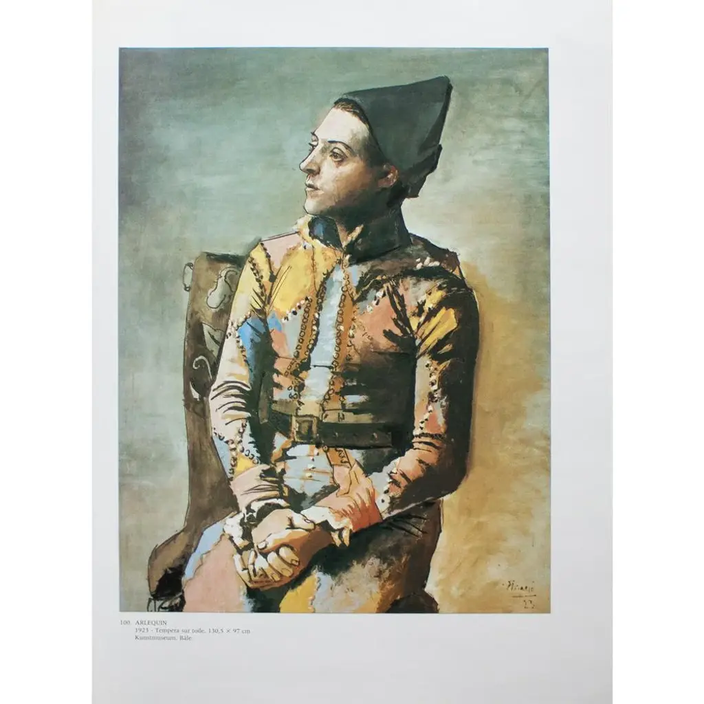 An excellent First Edition full-color print of painting Arlequin (Harlequin, or Seated Harlequin, 1923), a portrait of painter Jacinto Salvado, by Pablo Picasso. Comes from a rare First Limited Edition folio of the artist published by New French Editions in Paris, France, in 1985. Signed in the print (printed) at the lower right corner: "Picasso 23". Printed on one side. Hand tipped-in on a board of heavy paper. Numbered. Information regarding the original artwork, in French, is below the image. Copy by Georges Boudaille on the back of the board. Detailed. Stunning true to the original artwork colors. Excellent condition - never framed. Image 7.70"W x 10.15"H