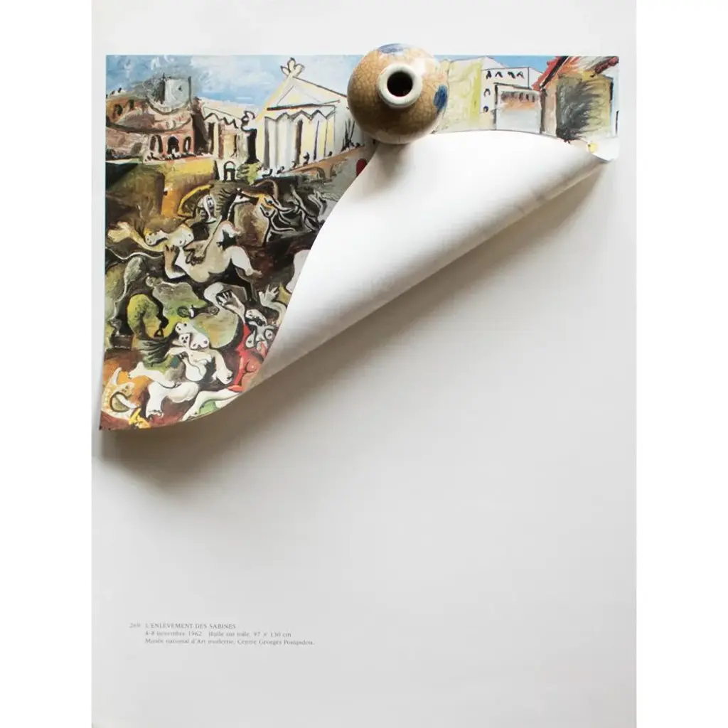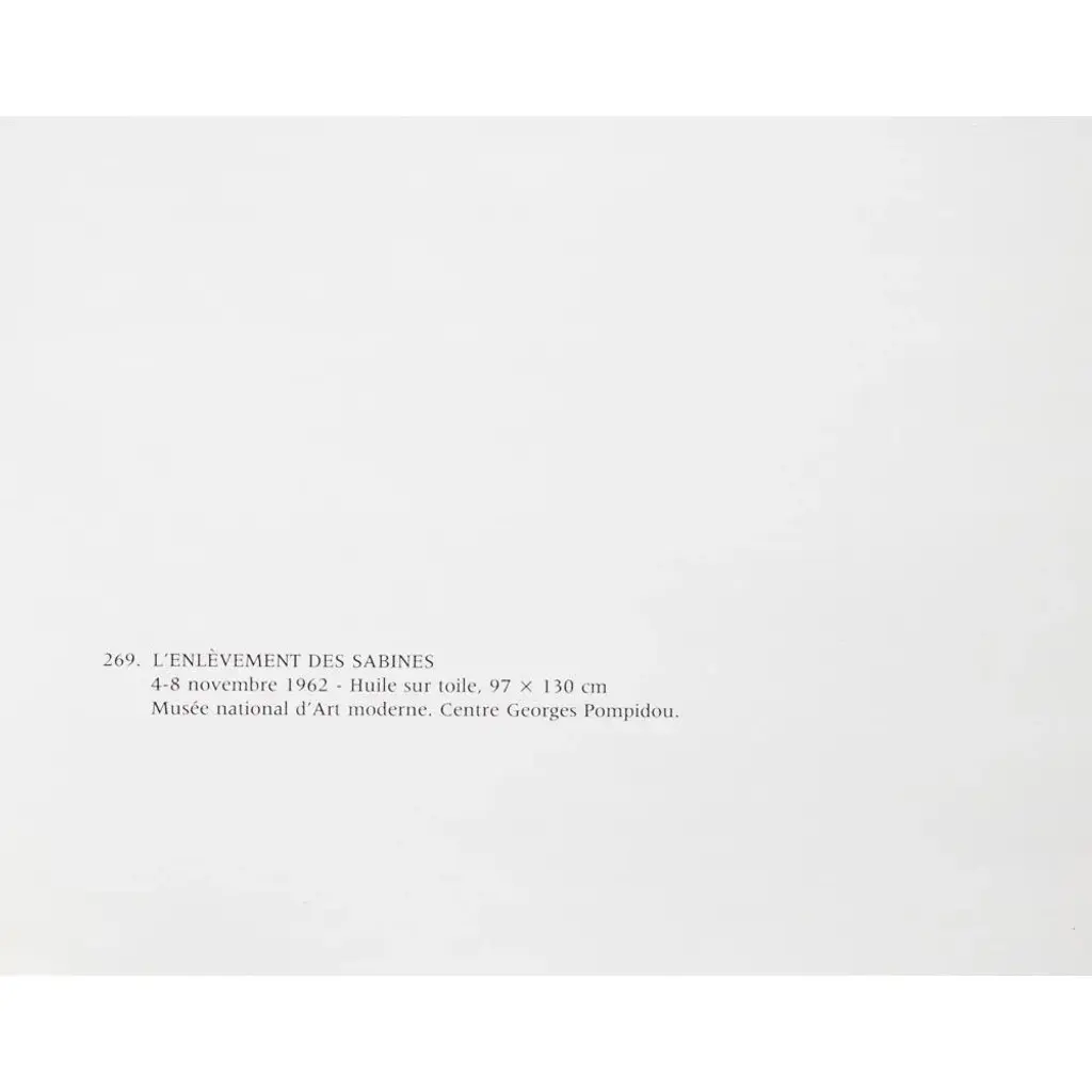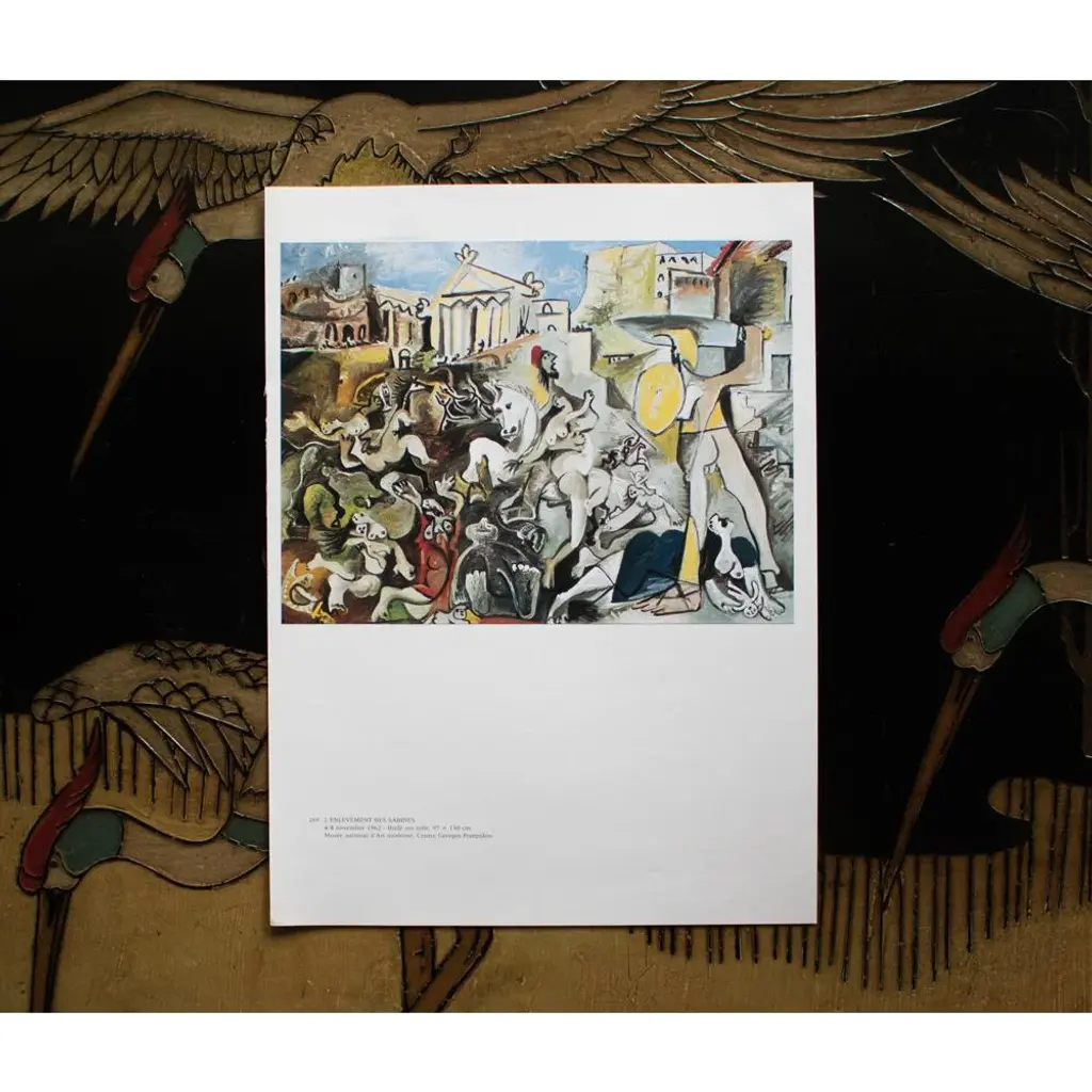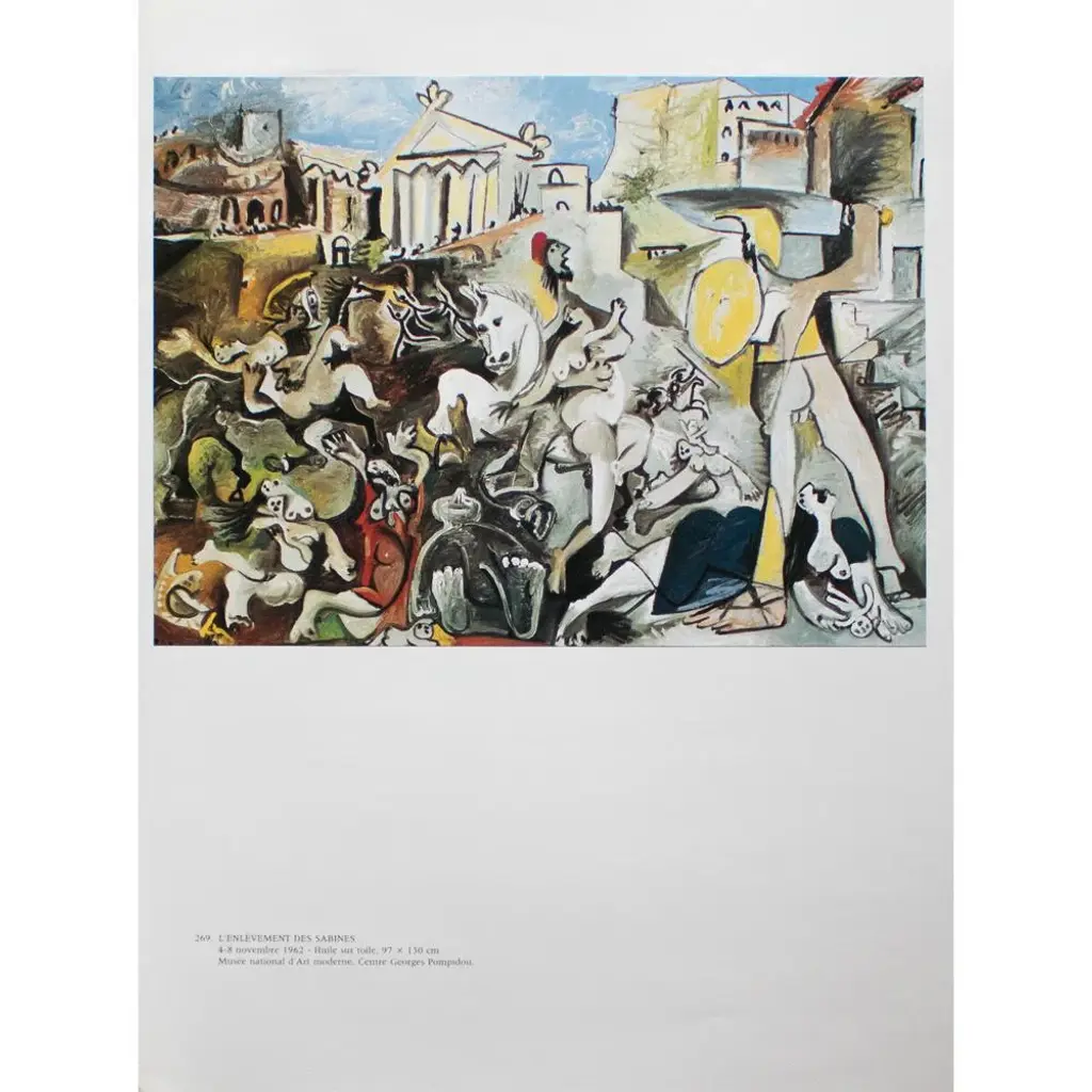 An excellent full-color print after oil on canvas painting "The Abduction of Sabines" (1962) by Pablo Picasso. Comes from an art folio published by New French Editions in Paris, France, in 1985. Printed on one side. Hand tipped-in on a board of heavy paper. Information regarding the original artwork is printed in French below the image. Copy by Georges Boudaille on the back of the board. Excellent condition - never framed. Overall 9.5"W x 12.75"H Image 8.80"W x 6.6"H