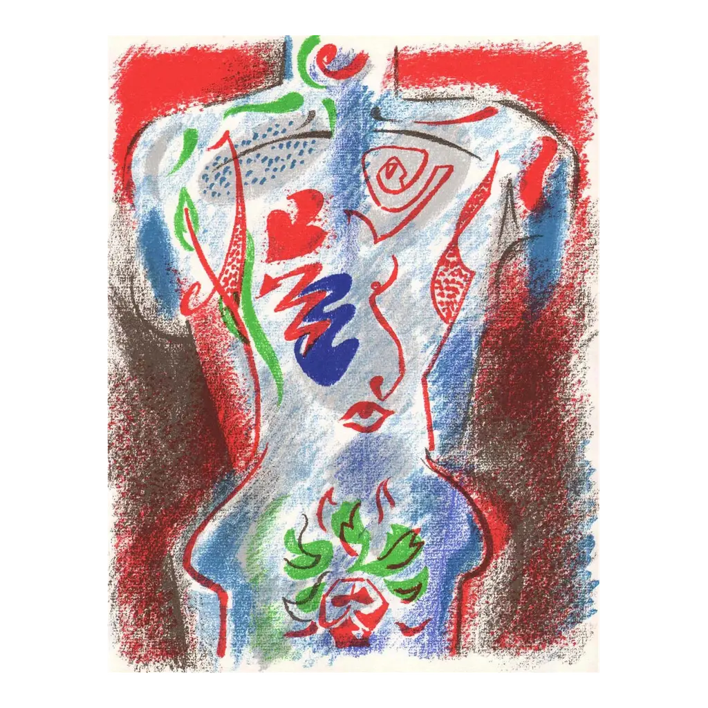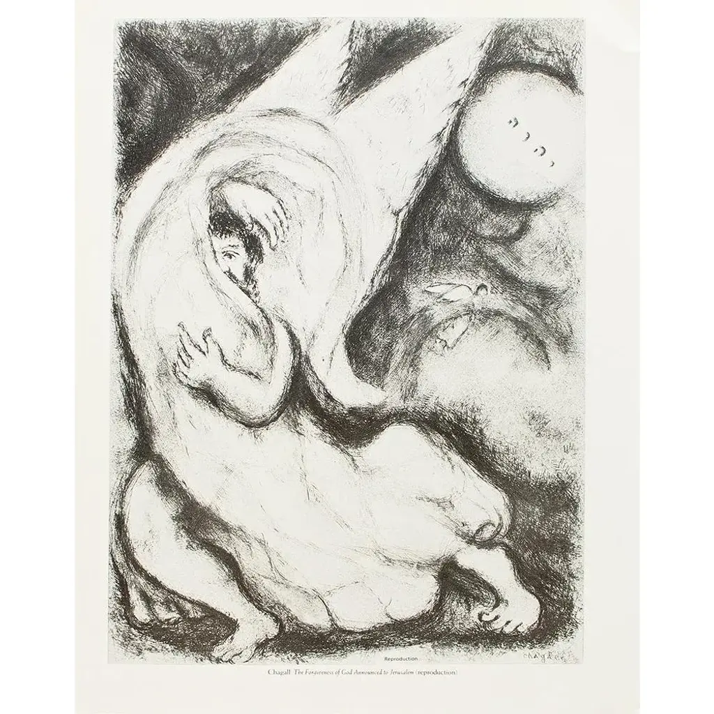 A stunning large full-color print of color lithograph "David and Bathsheba" by Marc Chagall, first published in 1958-1959 in Verve magazine. This is second edition printed in Switzerland in 1987, in a rare art book dedicated to Verve. Superb quality. Publisher even had to put word "reproduction" below the image and at the lower left corner of the piece. Detailed. Rich colors. Reproduction of black and white drawing "The Forgiveness of God Announced to Jerusalem" is printed on back. Excellent condition - minor edge wear, never framed. Overall 10.35"W x 13.90"H Image 9.75"W x 13.25"H