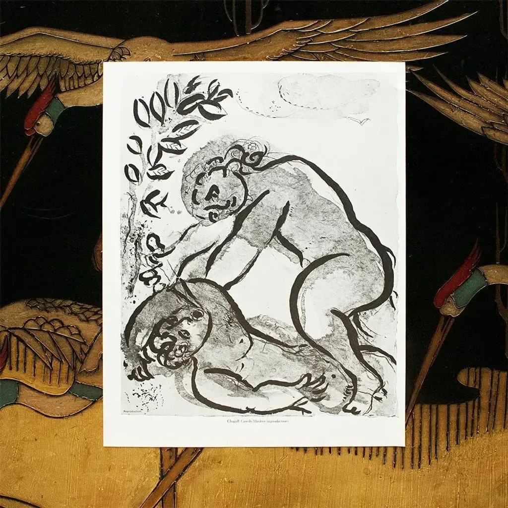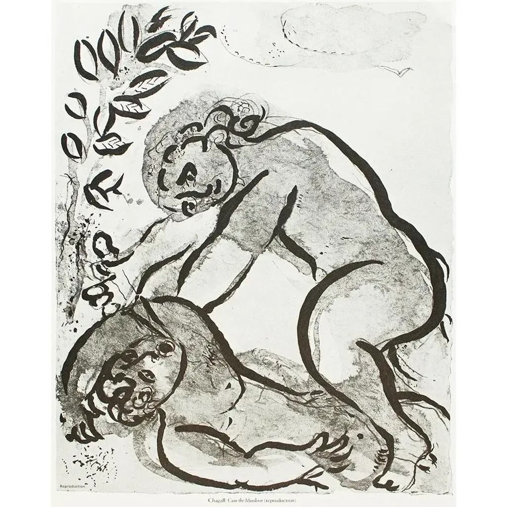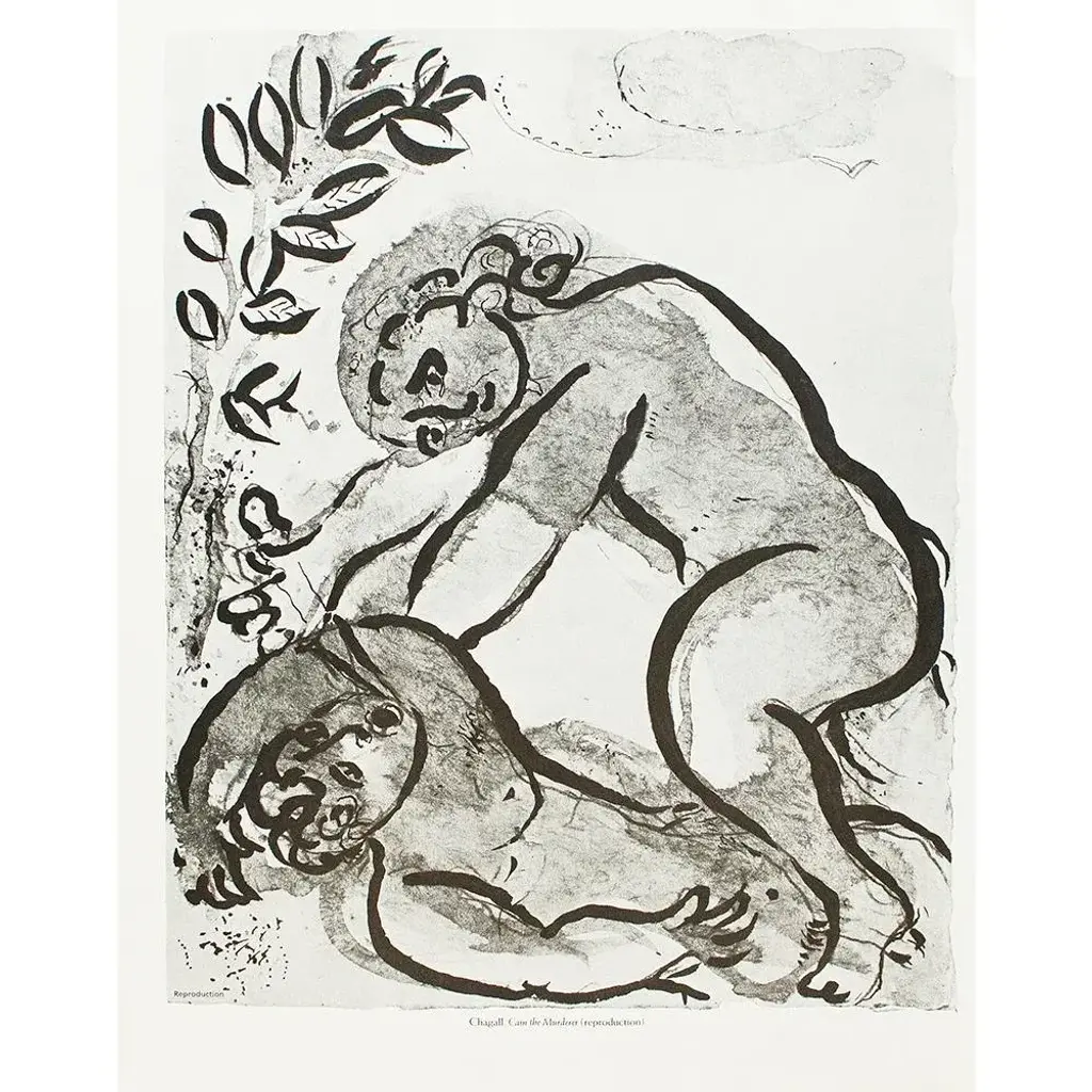 An excellent large full-color print of color lithograph "Paradise" by Marc Chagall, first published in 1958-1959 in Verve magazine. This is second edition printed in Switzerland in 1987, in a rare art book dedicated to Verve. Superb quality. Publisher even had to put word "reproduction" below the image and at the lower right corner of the piece. Detailed. Rich colors. Reproduction of black and white lithograph "Cain the Murderer" is printed on back. Excellent condition - minor edge wear, never framed. Overall 10.35"W x 13.90"H Image 9.75"W x 13.25"H