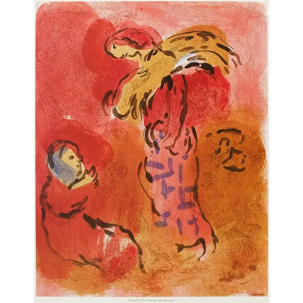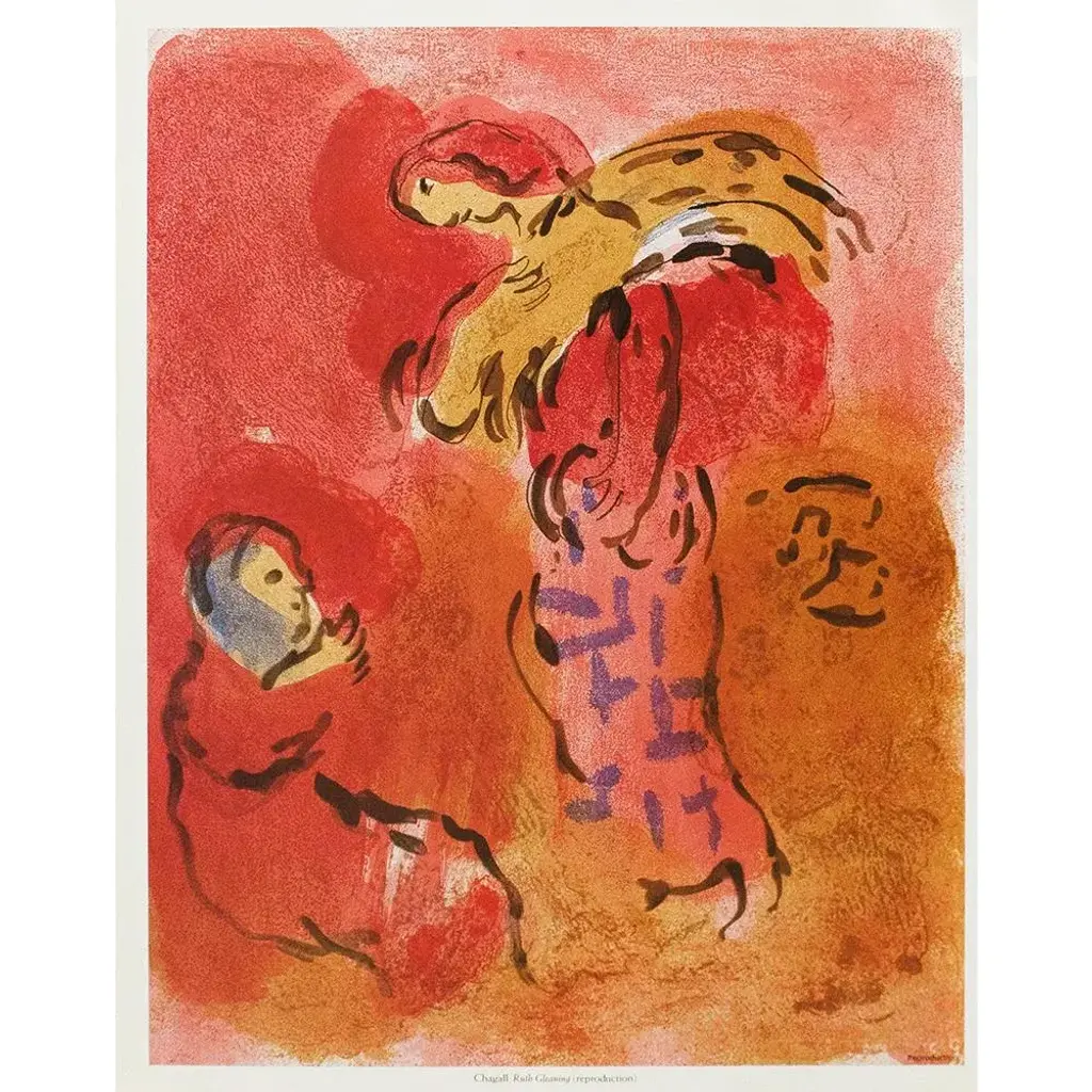 An excellent large full-color print of color lithograph "Sarah and the Angels" by Marc Chagall, first published in 1958-1959 in Verve magazine. This is second edition printed in Switzerland in 1987, in a rare art book dedicated to Verve. Superb quality. Publisher even had to put word "reproduction" below the image and at the lower right corner of the piece. Detailed. Rich colors. Reproduction of color lithograph "Ruth Gleaning" is printed on back. Excellent condition - minor edge wear, never framed. Overall 10.35"W x 13.90"H Image 9.75"W x 13.25"H