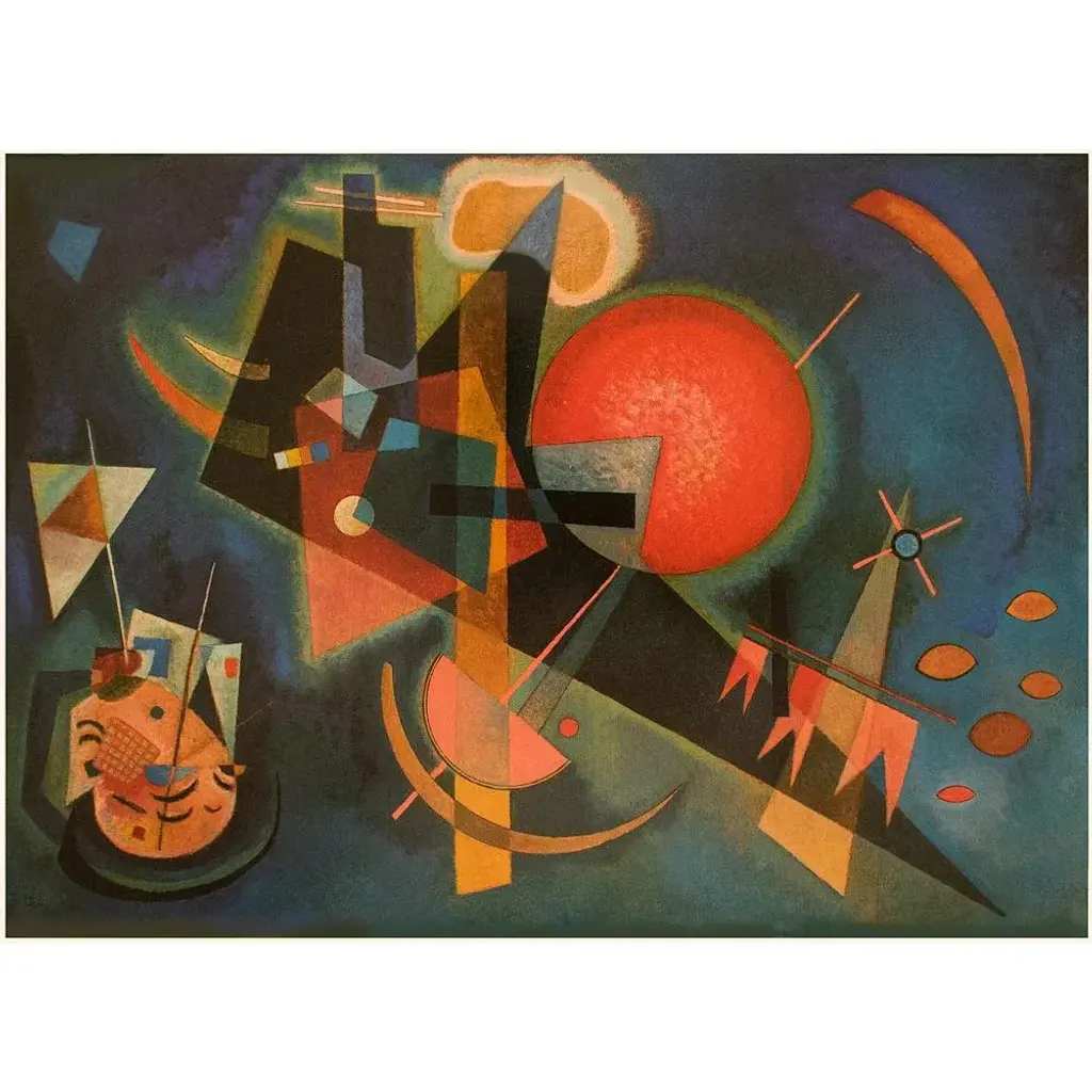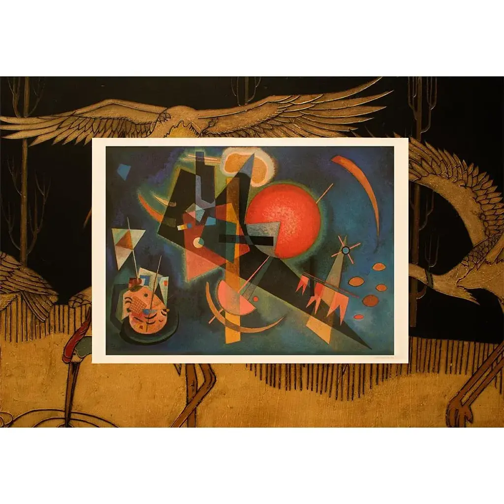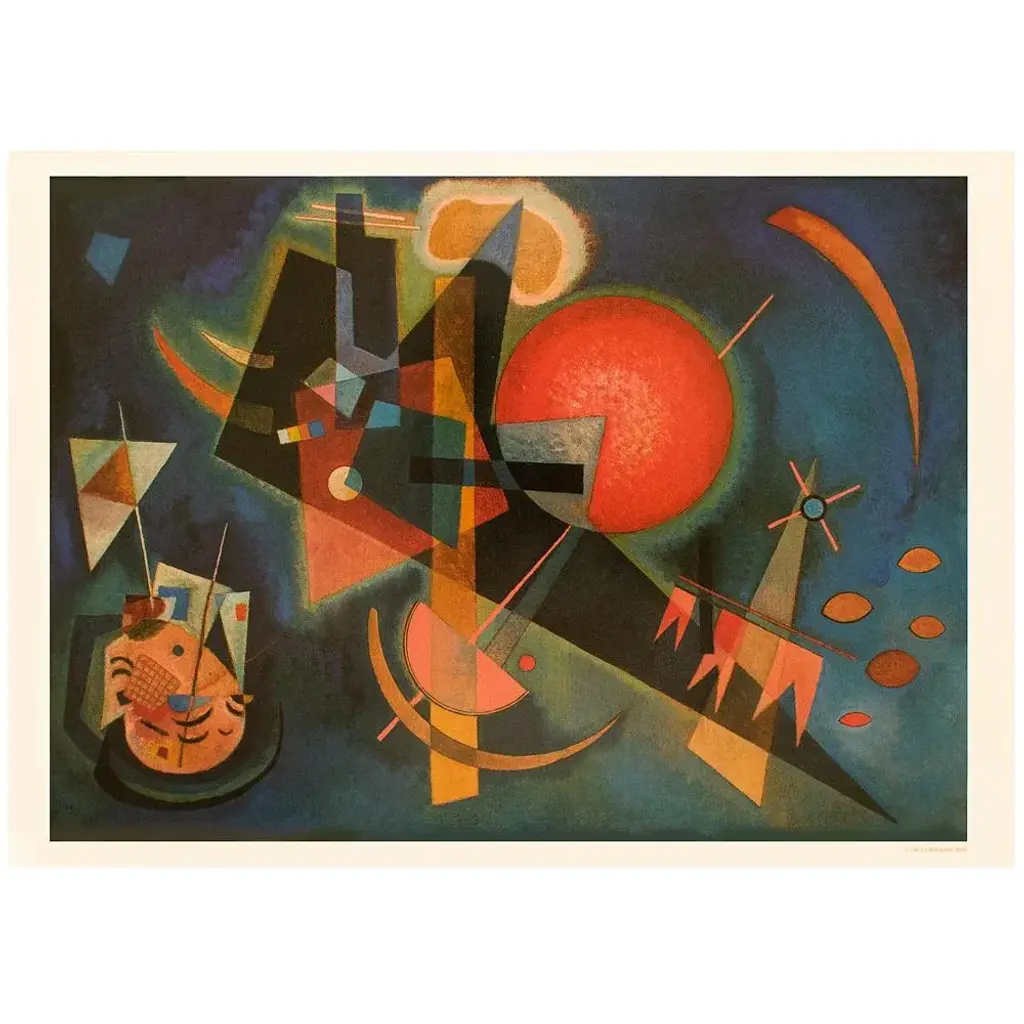 A stunning poster after oil on canvas Abstract painting "In the Blue" (1925) by Russian painter and art theorist Wassily Kandinsky (1866-1944). Printed on one side of high quality heavy paper. Copyright information is printed under the image and dated: 1990. Very detailed. Colors are brilliant. Superb quality of printing and materials. First Limited Edition as a poster. Germany, 1990. Excellent condition - never framed, like new. This poster was stored flat and will be shipped flat. Overall 17"W x 12"H Image 15.50"W x 11.20"H