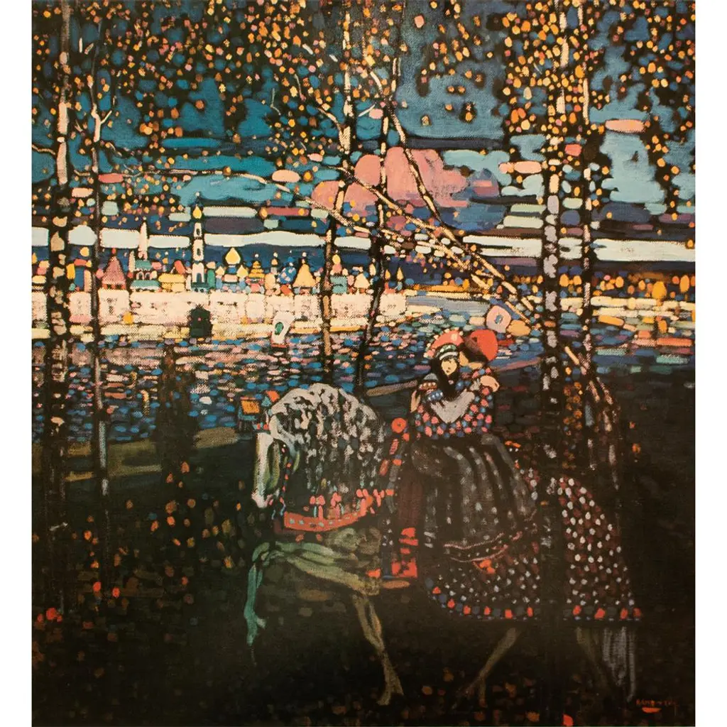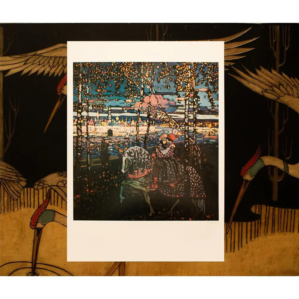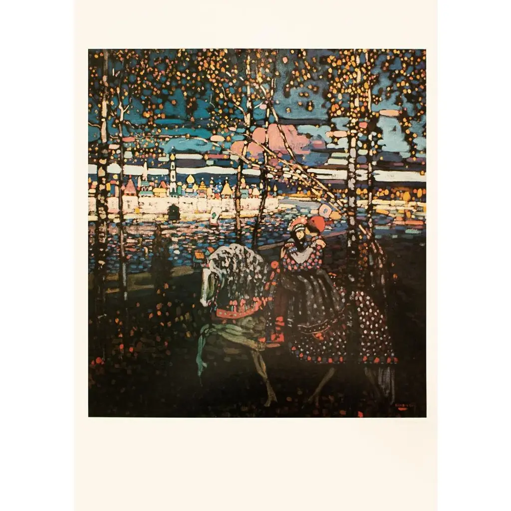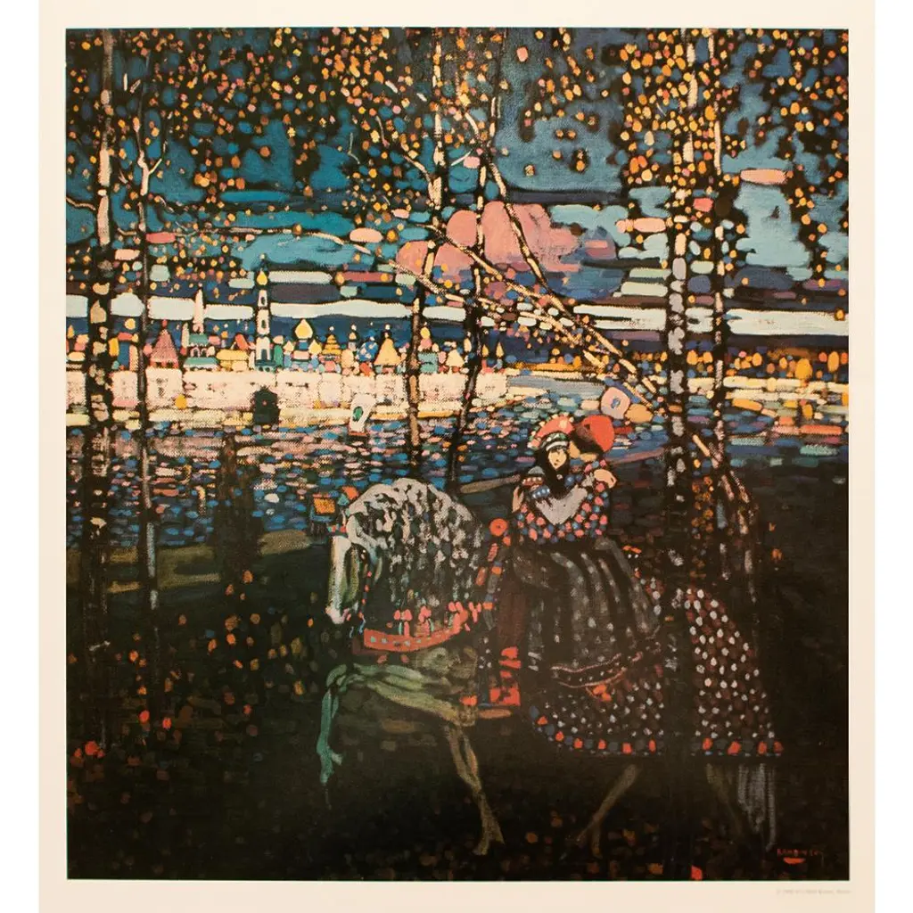 A stunning poster after oil on canvas Post-Impressionist painting "Riding Couple" (1906) by Russian painter and art theorist Wassily Kandinsky (1866-1944). The poster is depicting a beautiful landscape on the back with a river and Russian Orthodox Churches. Signed in the print. Printed on one side of high quality heavy paper. Copyright information is printed under the image and dated: 1990. Detailed. Colors are brilliant. Superb quality of printing and materials. First Limited Edition as a poster. Germany, 1990. Excellent condition - never framed, like new. This poster was stored flat and will be shipped flat. Overall 12"W x 17"H Image 11.20"W x 12.20"H