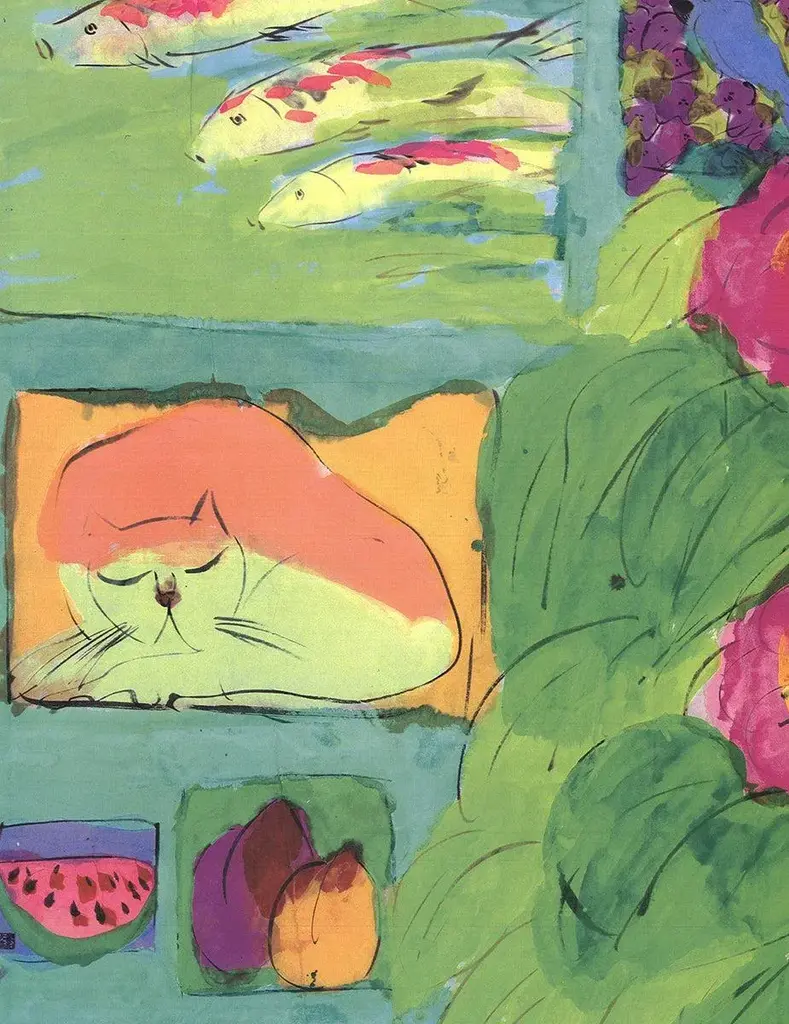 Artist: Walasse Ting Title: Still-Life with Pink Cat Year: 1993 Signed: No Medium: Offset Lithograph Paper Size: 54.5 x 37.75 inches ( 138.43 x 95.885 cm ) Image Size: 27.5 x 54.5 inches ( 69.85 x 138.43 cm ) Edition Size: Unknown Framed: No Condition: A-: Near Mint, very light signs of handling