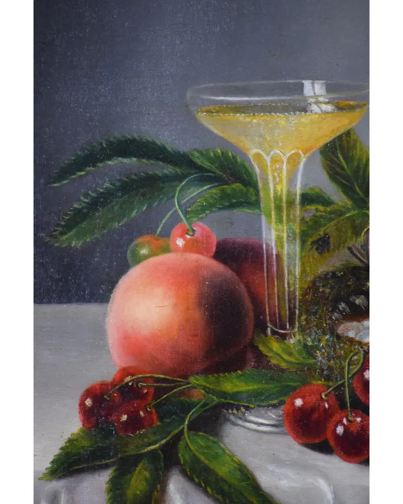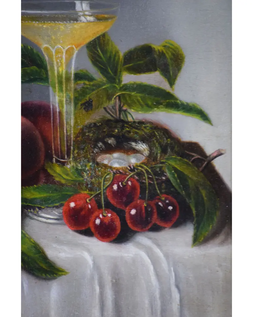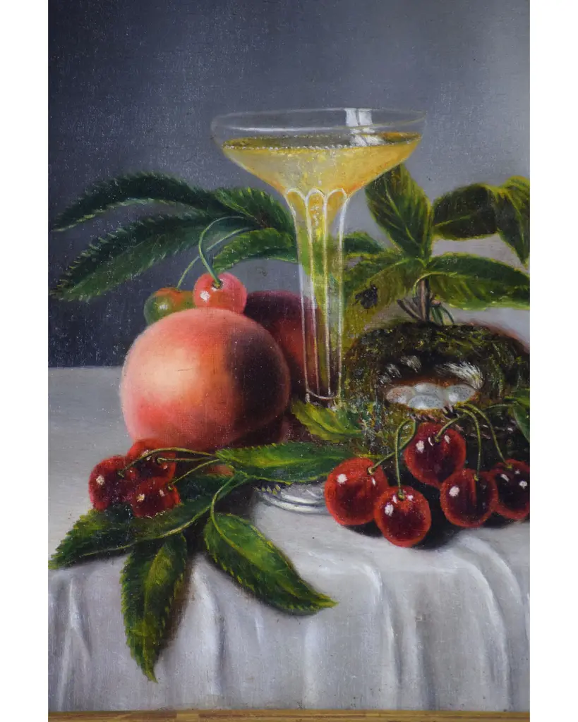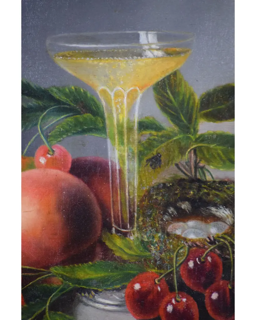 Mid to late 19th Century Antique still life painting of a champagne glass with fruit, including cherries, and a birds nest against a gray background. Likely New York School, from a Westchester County, New York estate. Oil on canvas presented in a gorgeous gilt wood frame. Image size: 13" H x 10.625" W, overall framed measurements: 18.25" H x 15.75" W x 2.75" D