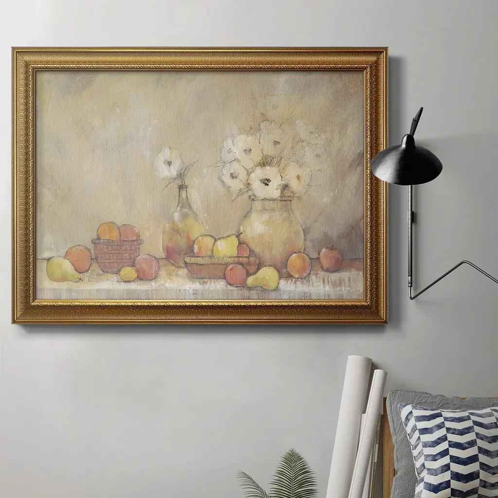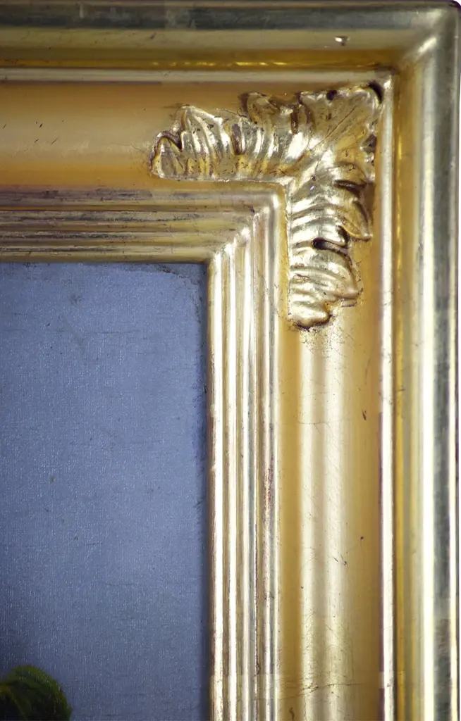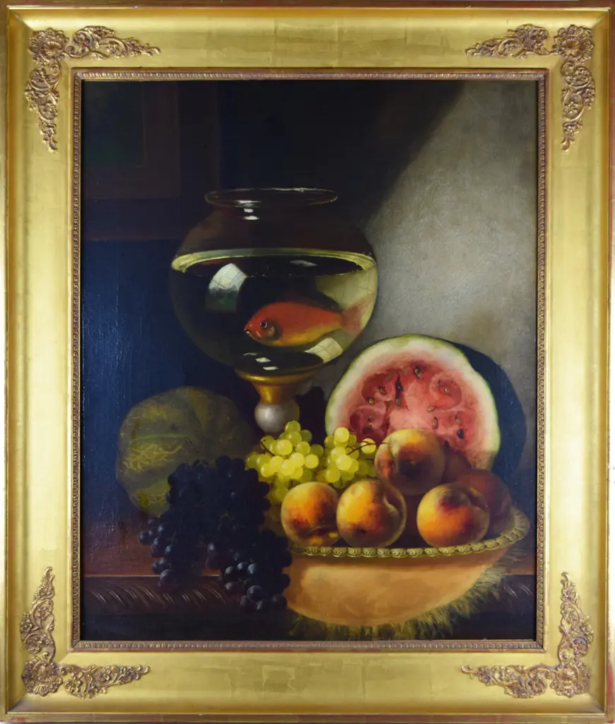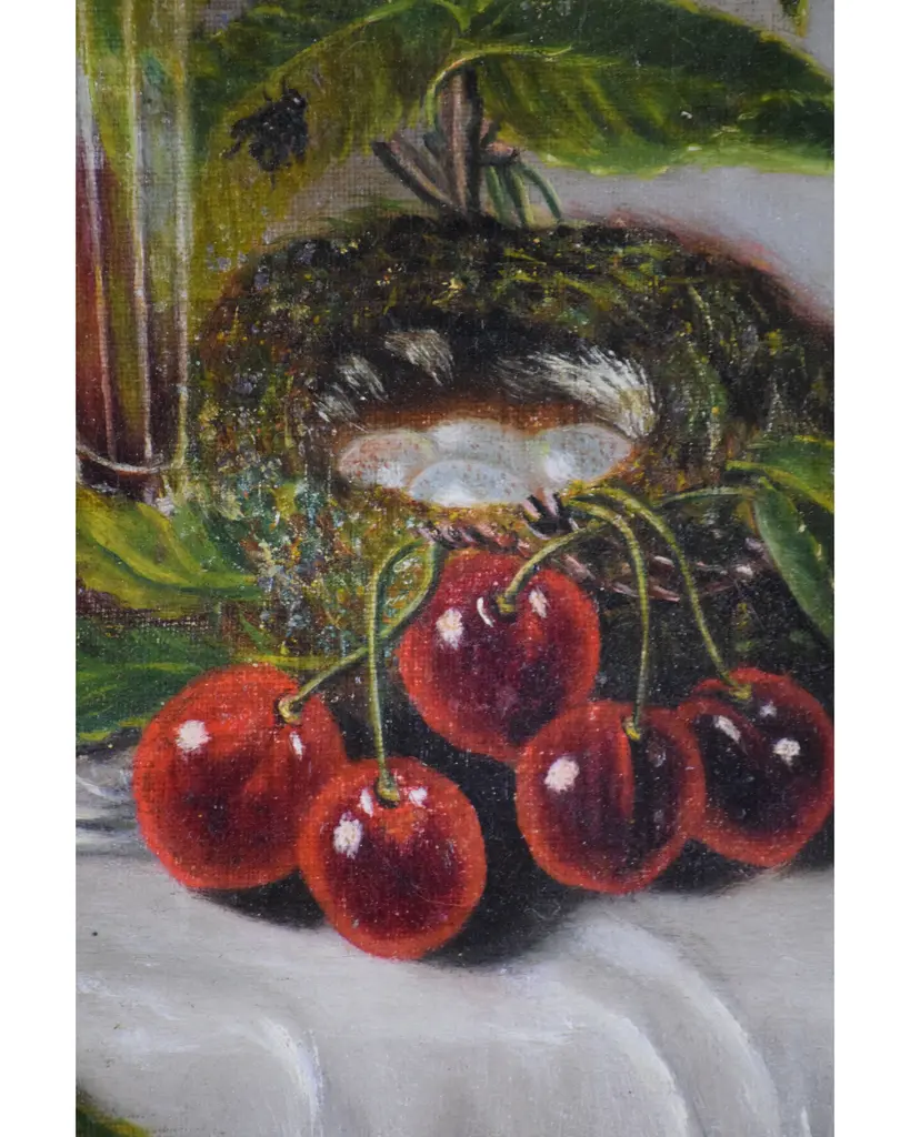 Mid to late 19th Century Antique still life painting of a champagne glass with fruit, including cherries, and a birds nest against a gray background. Likely New York School, from a Westchester County, New York estate. Oil on canvas presented in a gorgeous gilt wood frame. Image size: 13" H x 10.625" W, overall framed measurements: 18.25" H x 15.75" W x 2.75" D