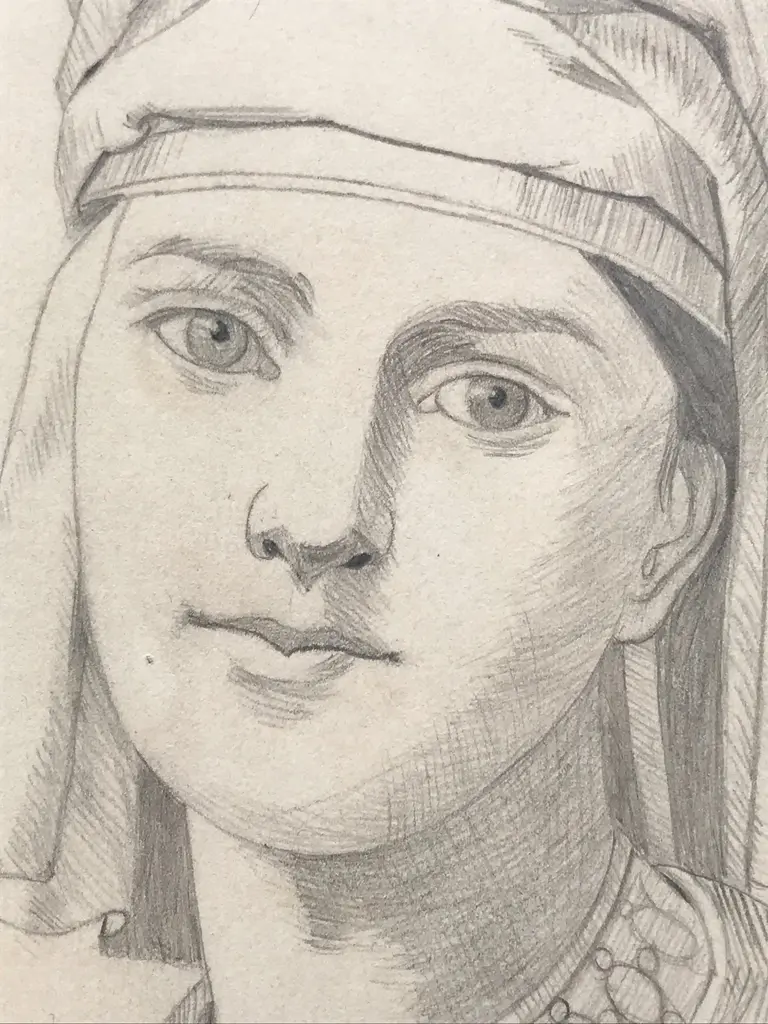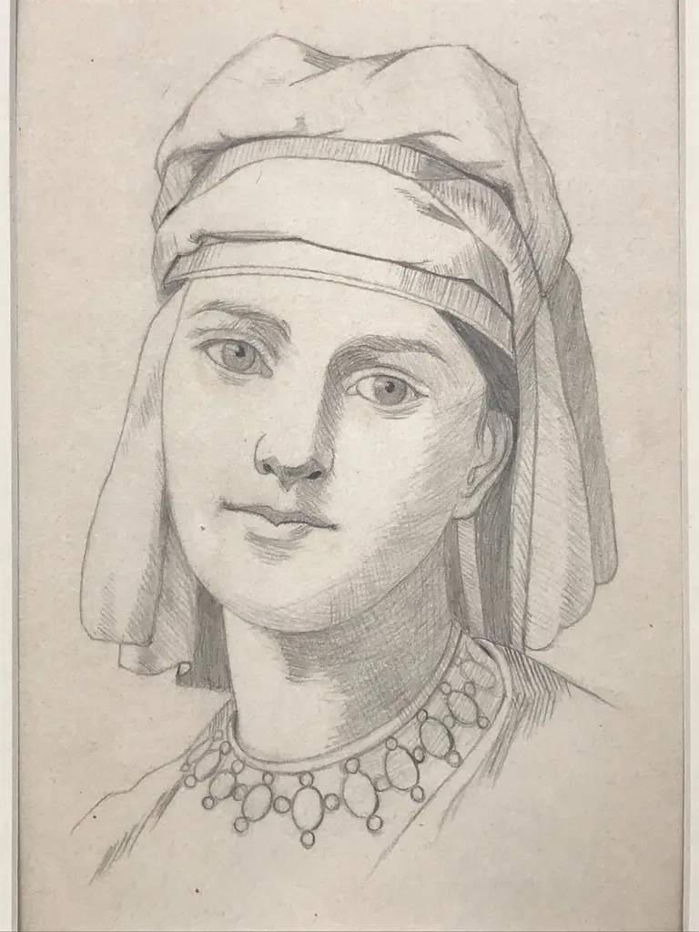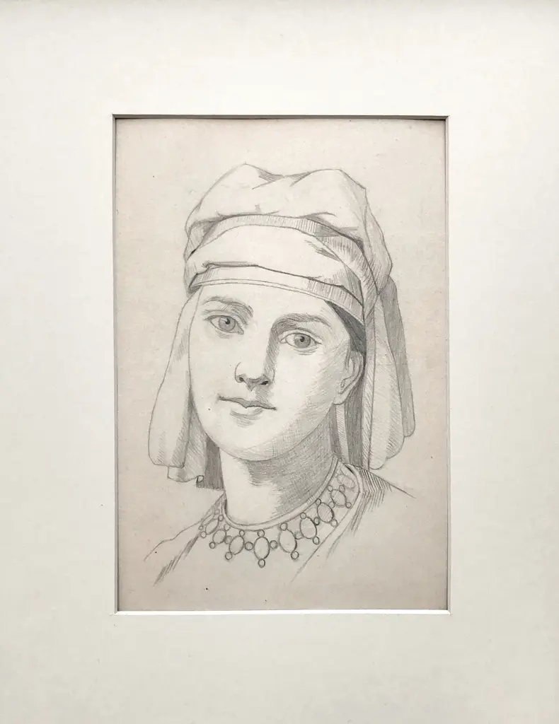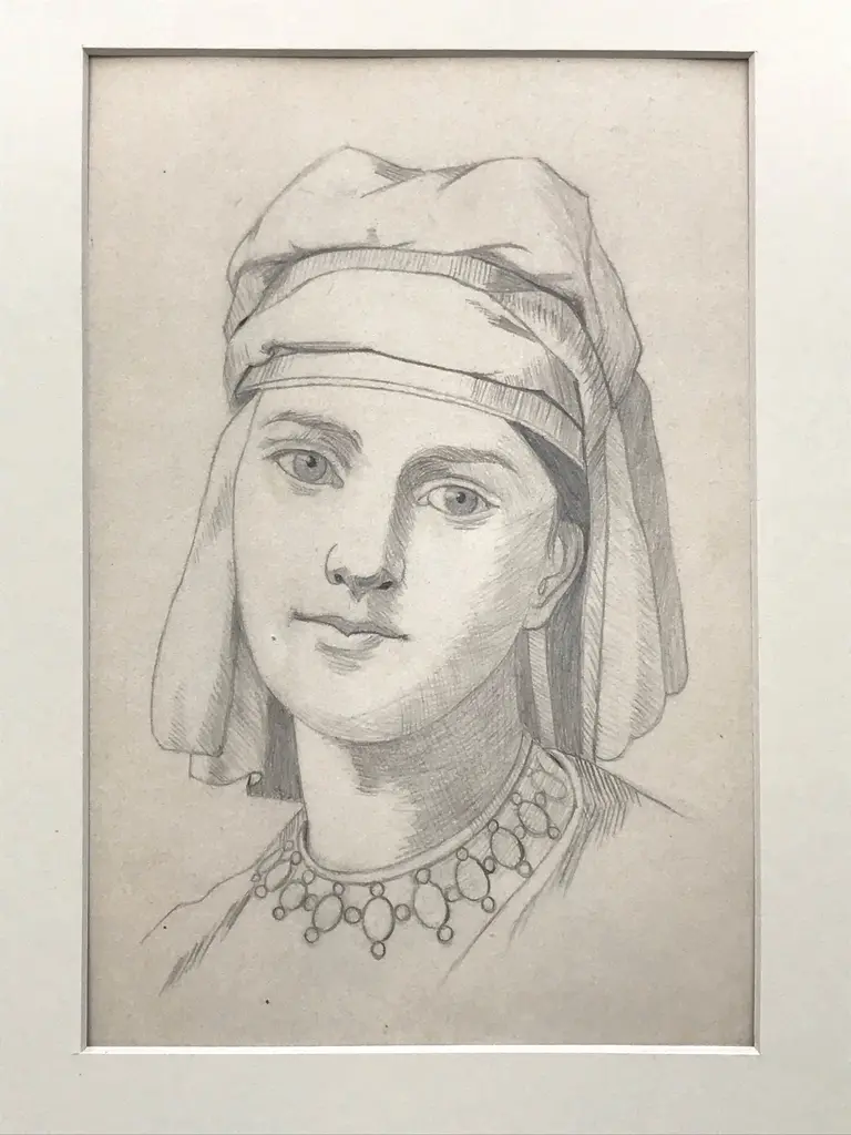 Graphite portrait drawing of a Renaissance-style woman, from a portfolio dated 1885. Presented in cream-colored matting and a silver wood frame with acanthus detail. Image: 5.5"L x 8"H; frame: 13"L x 15"H. Minor age toning.