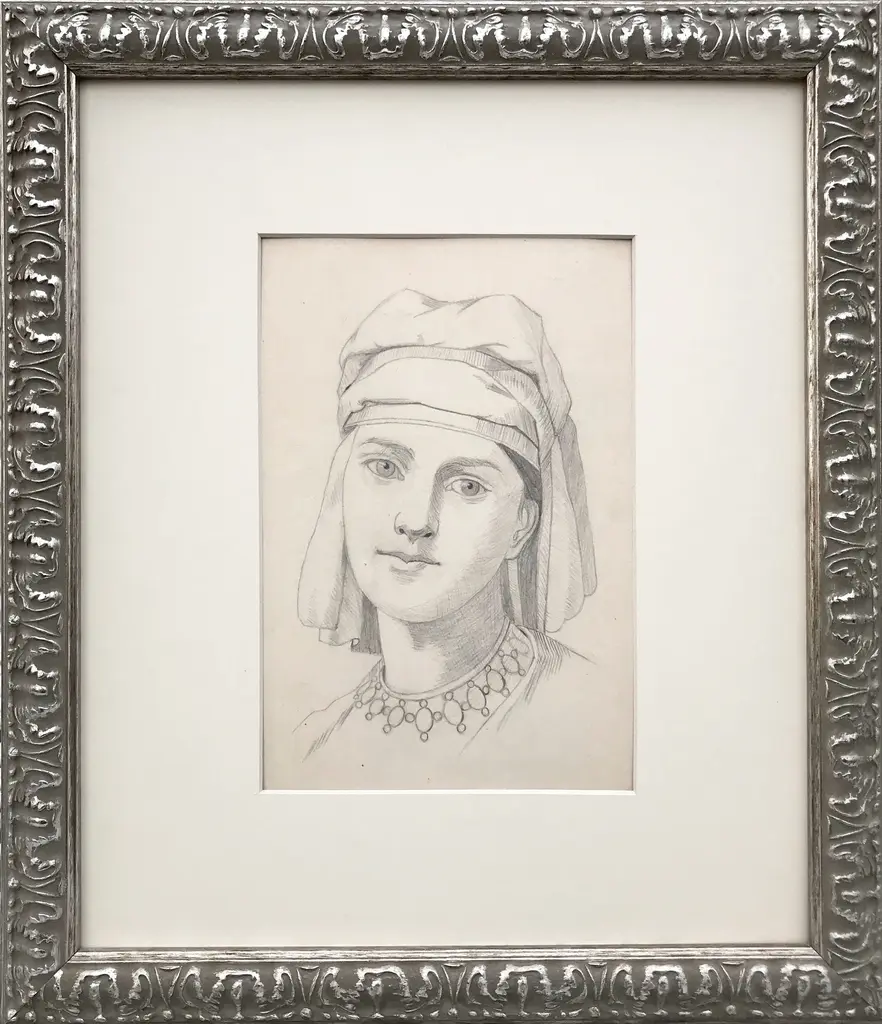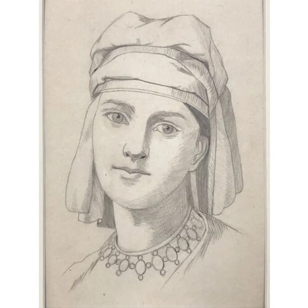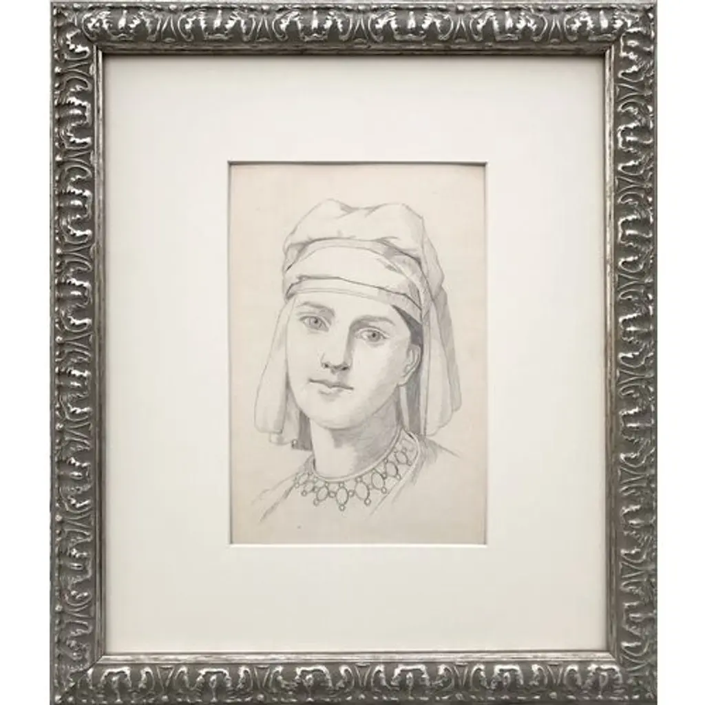 Graphite portrait drawing of a Renaissance-style woman, from a portfolio dated 1885. Presented in cream-colored matting and a silver wood frame with acanthus detail. Image: 5.5"L x 8"H; frame: 13"L x 15"H. Minor age toning.