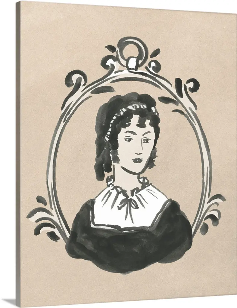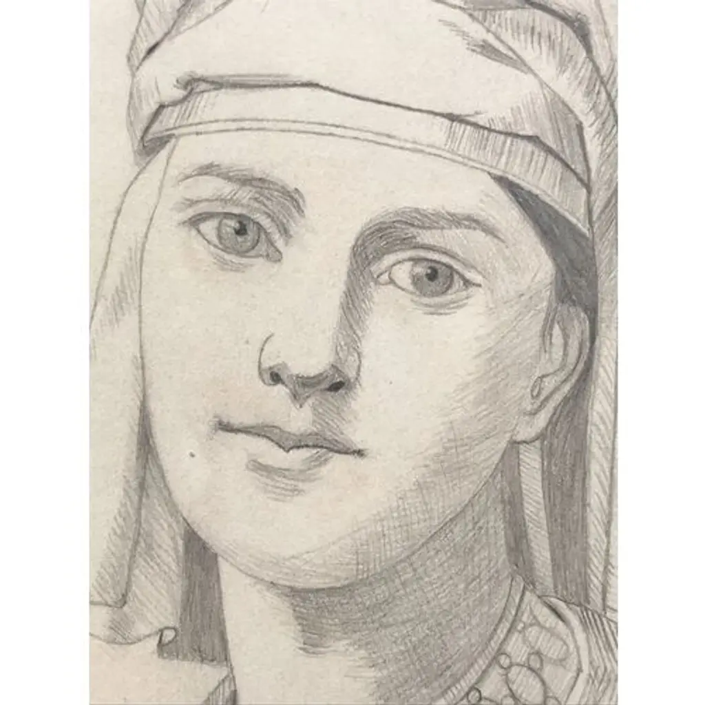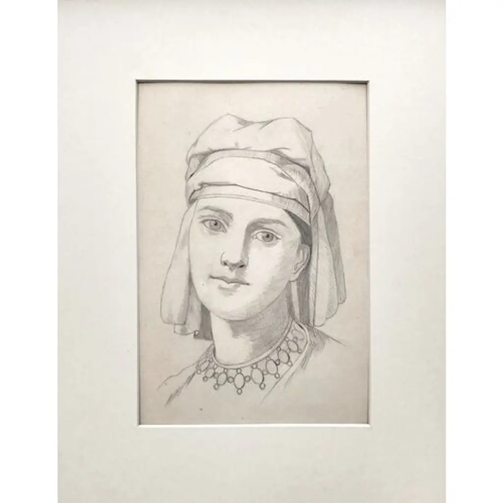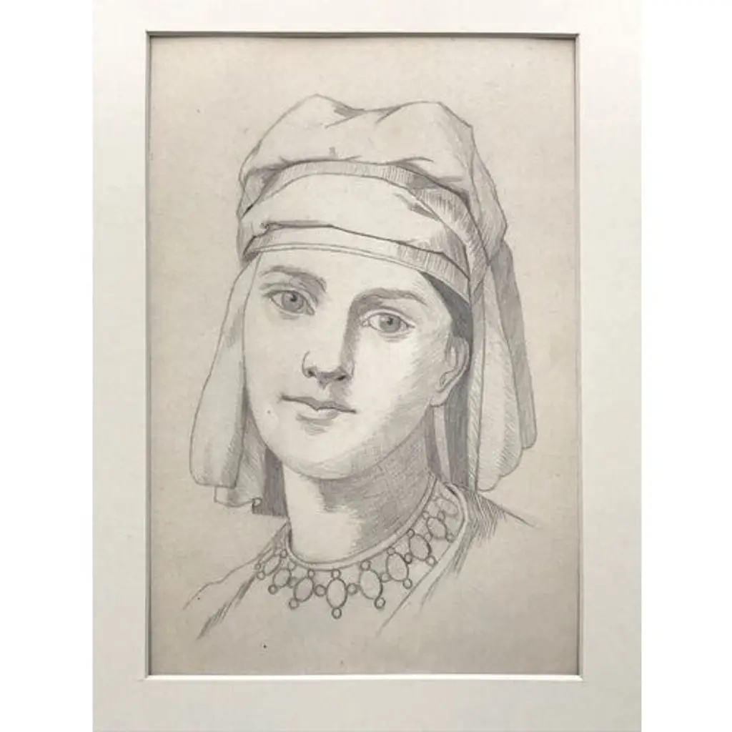 Graphite portrait drawing of a Renaissance-style woman, from a portfolio dated 1885. Presented in cream-colored matting and a silver wood frame with acanthus detail. Image: 5.5"L x 8"H; frame: 13"L x 15"H. Minor age toning.