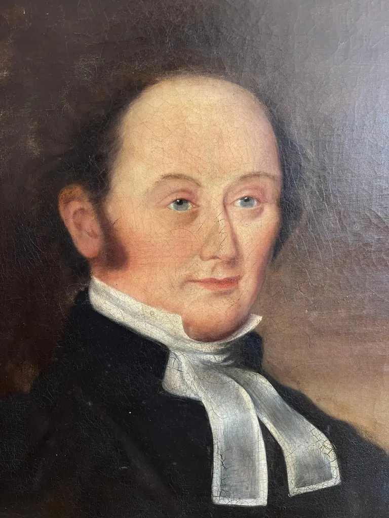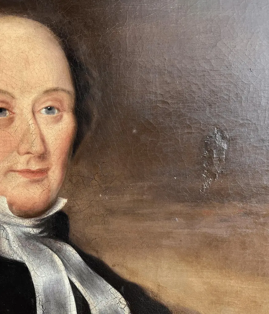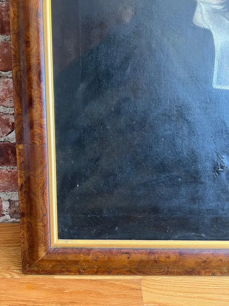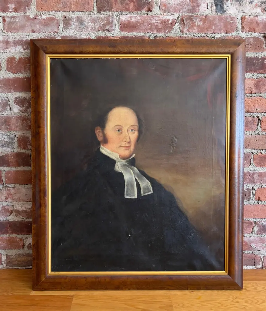 A striking 19th-century American School oil on canvas portrait of a clergyman, painted in rich, moody tones. The sitter, dressed in formal black robes with white preaching tabs, is depicted with a calm and thoughtful expression—a hallmark of early American ecclesiastical portraiture.This piece features beautiful craquelure throughout and one area of surface wear (visible in close-up), which adds to its authentic antique character. The canvas is mounted on its original stretcher, while the burlwood-style frame appears to be a later addition.A compelling piece for collectors, designers, or anyone drawn to early American portraiture, this painting brings quiet drama and old-world soul to any interior—perfect for a study, hallway, or collected wall.