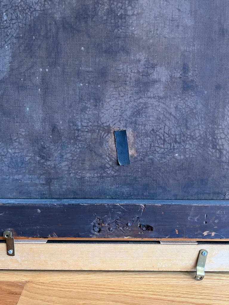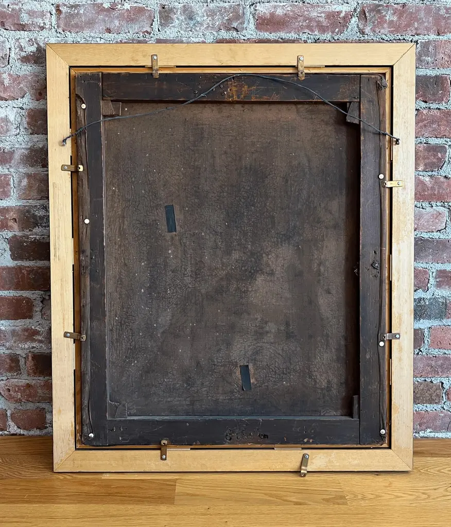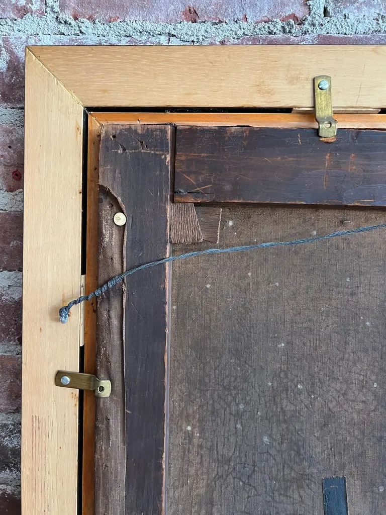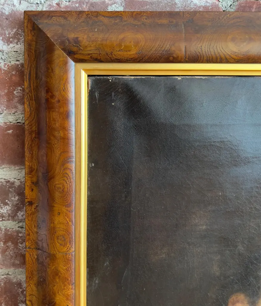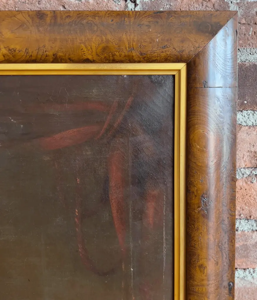 A striking 19th-century American School oil on canvas portrait of a clergyman, painted in rich, moody tones. The sitter, dressed in formal black robes with white preaching tabs, is depicted with a calm and thoughtful expression—a hallmark of early American ecclesiastical portraiture.This piece features beautiful craquelure throughout and one area of surface wear (visible in close-up), which adds to its authentic antique character. The canvas is mounted on its original stretcher, while the burlwood-style frame appears to be a later addition.A compelling piece for collectors, designers, or anyone drawn to early American portraiture, this painting brings quiet drama and old-world soul to any interior—perfect for a study, hallway, or collected wall.