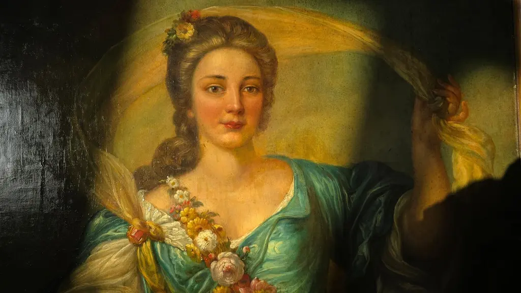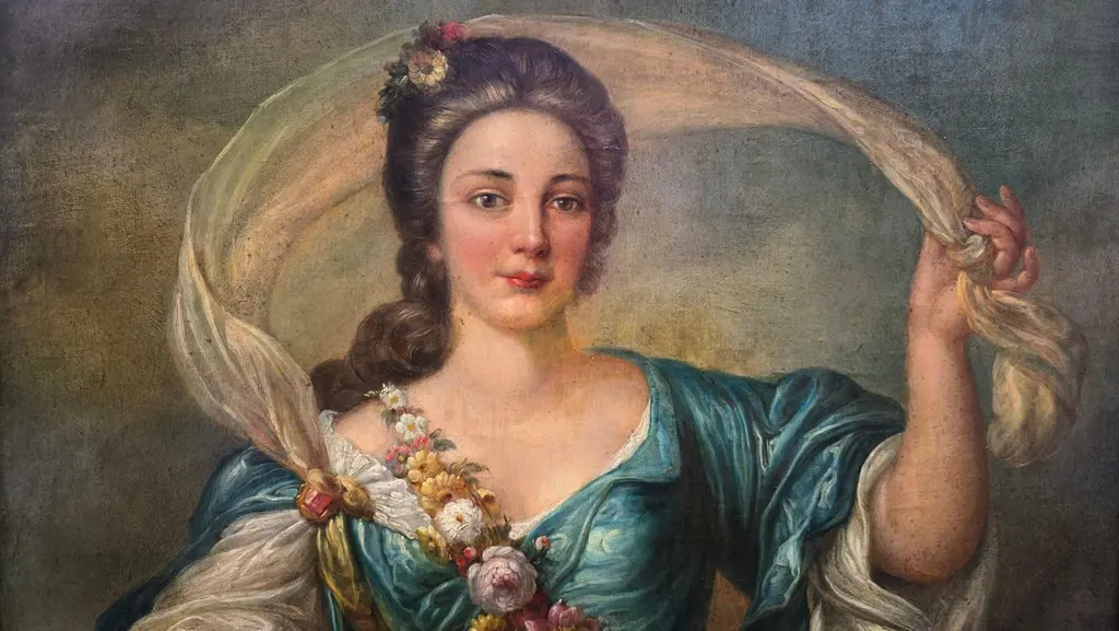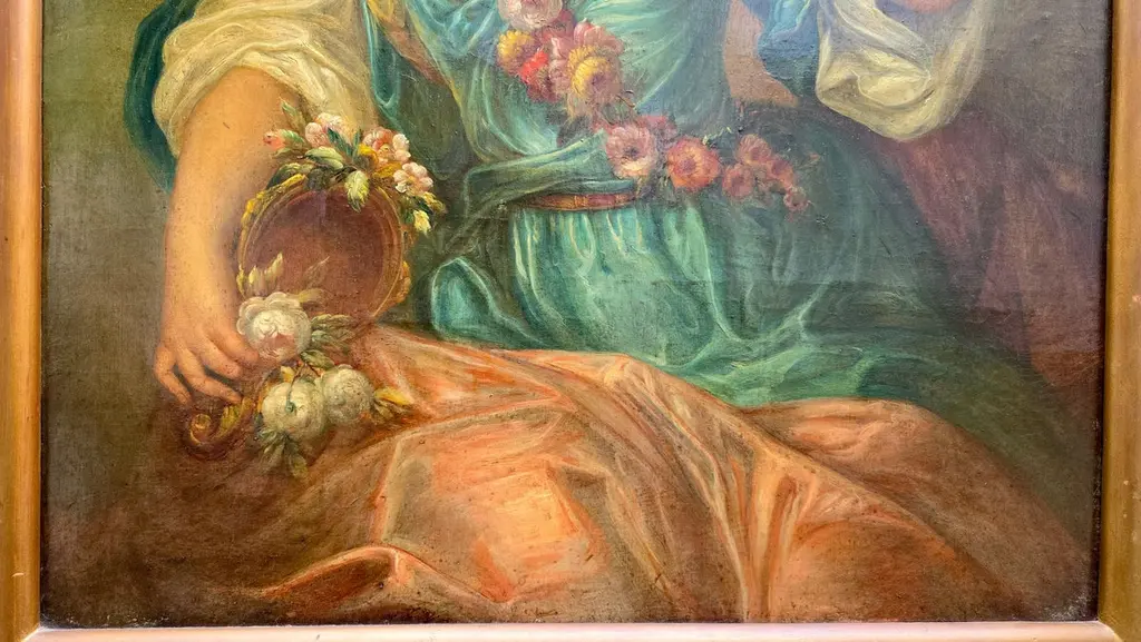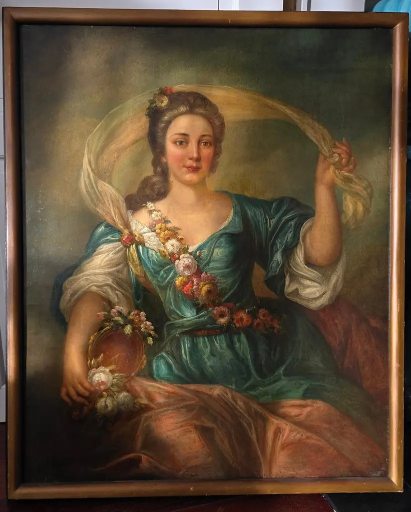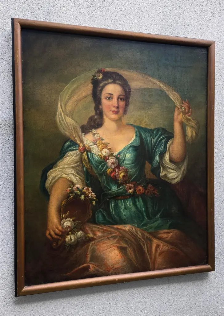 19th Century Portrait in the Style of Jean-Marc Nattier – Allegorical Female Figure as FloraThis elegant 19th-century oil painting masterfully captures the spirit of 18th-century Rococo portraiture. In the manner of Jean-Marc Nattier, the work depicts a graceful young woman adorned with a garland of flowers and flowing fabrics, holding a translucent ribbon above her head – a classical allegory, perhaps Flora, goddess of spring.The subject's soft gaze and the vivid turquoise of her dress draw the viewer in, complemented by the richness of the drapery and the finely rendered florals. The artist demonstrates superb control of light and texture, echoing the finesse of the French court portraitists.The painting is executed in oil on panel (rather than canvas), typical of high-quality decorative works from the late 19th century intended for refined interiors. The surface shows attractive craquelure consistent with age, enhancing its antique character.Dimensions:Height: 109 cm (42.9 in)Width: 90 cm (35.4 in)Depth (frame): 4 cm (1.6 in)Condition:Very good antique condition. Minor age-related wear and craquelure present. No visible repairs. Frame shows light wear consistent with age.Framed and ready to hang.A striking and romantic piece that brings grandeur, charm, and history into any classic or eclectic interior.