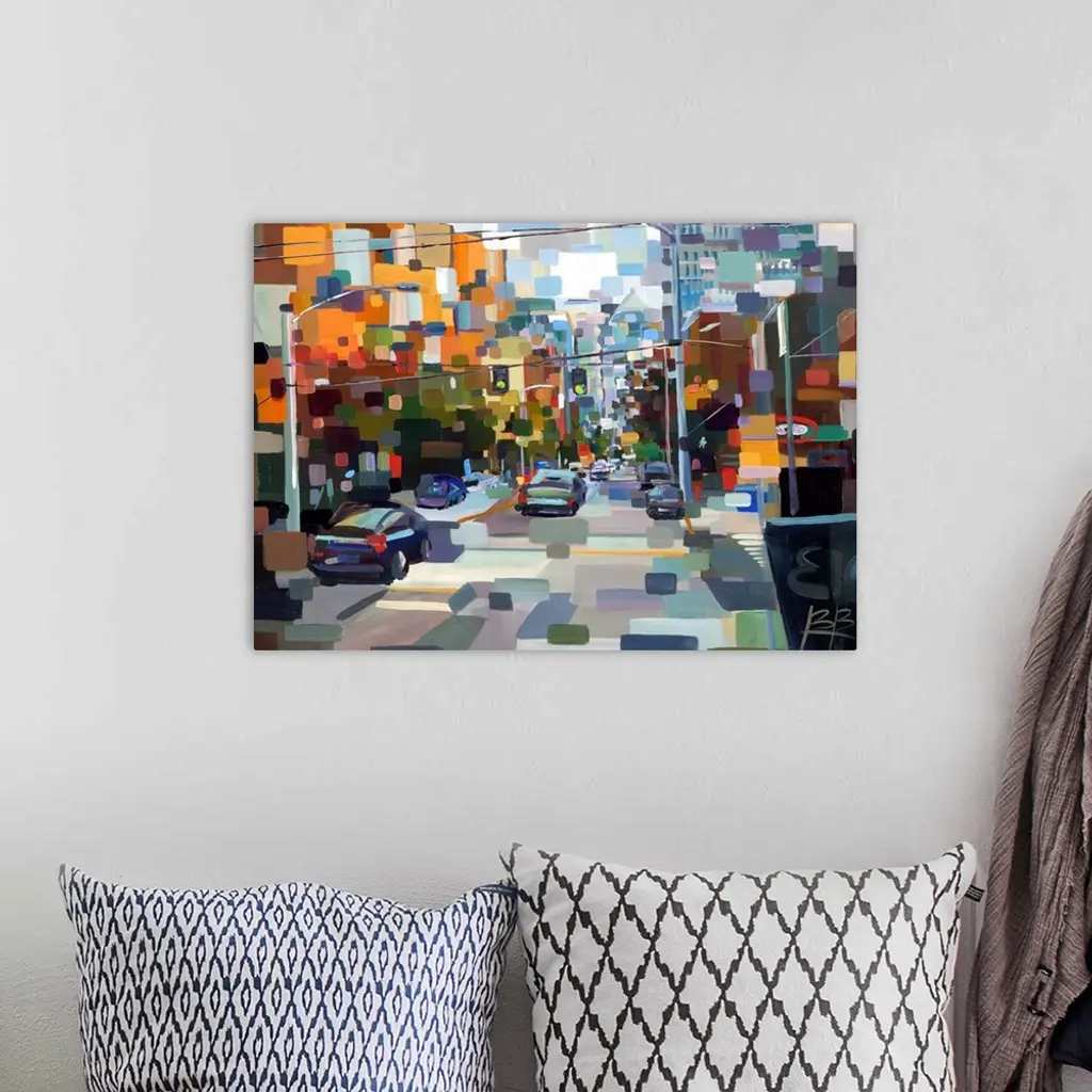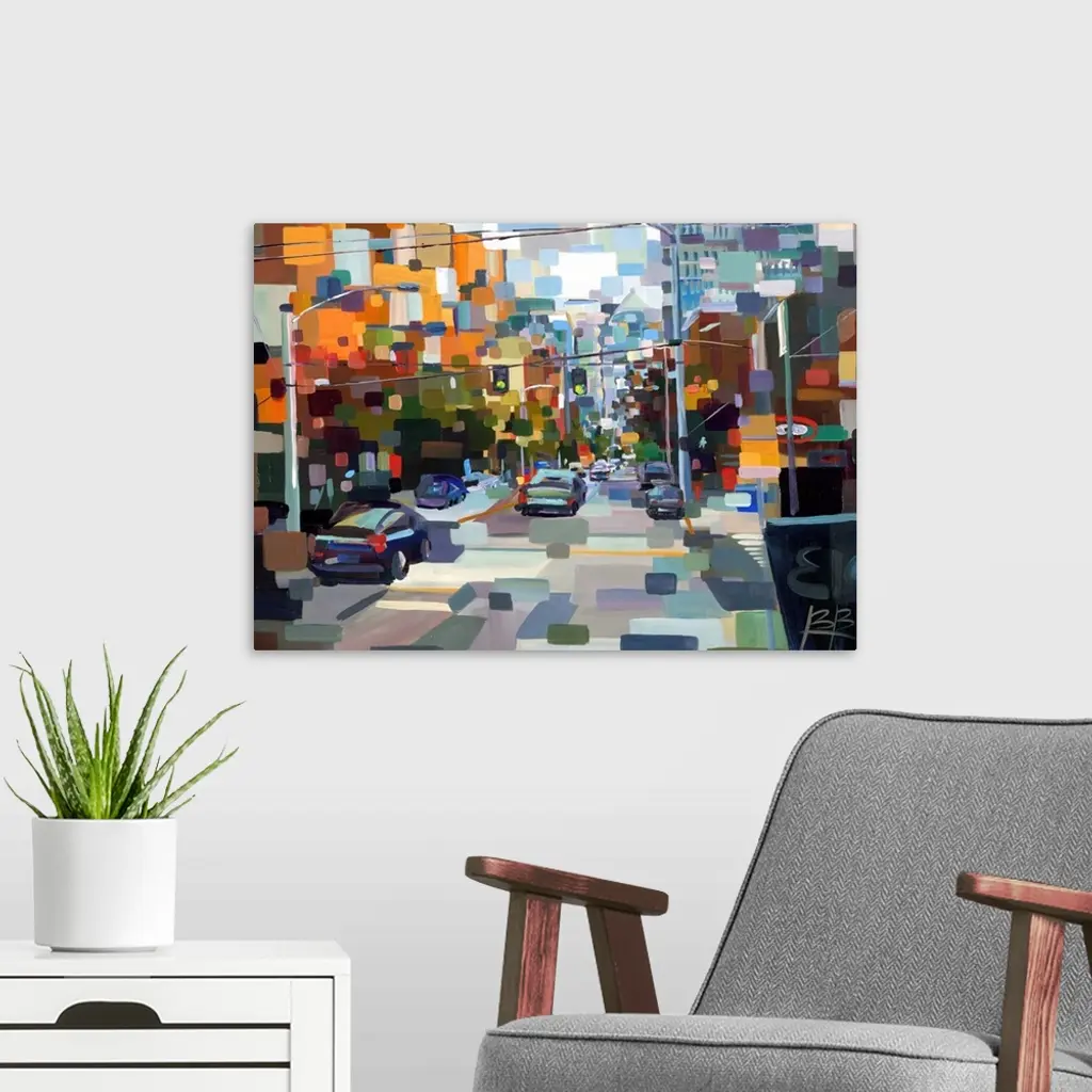 Contemporary abstract painting of an urban environment deconstructed into geometric shapes.