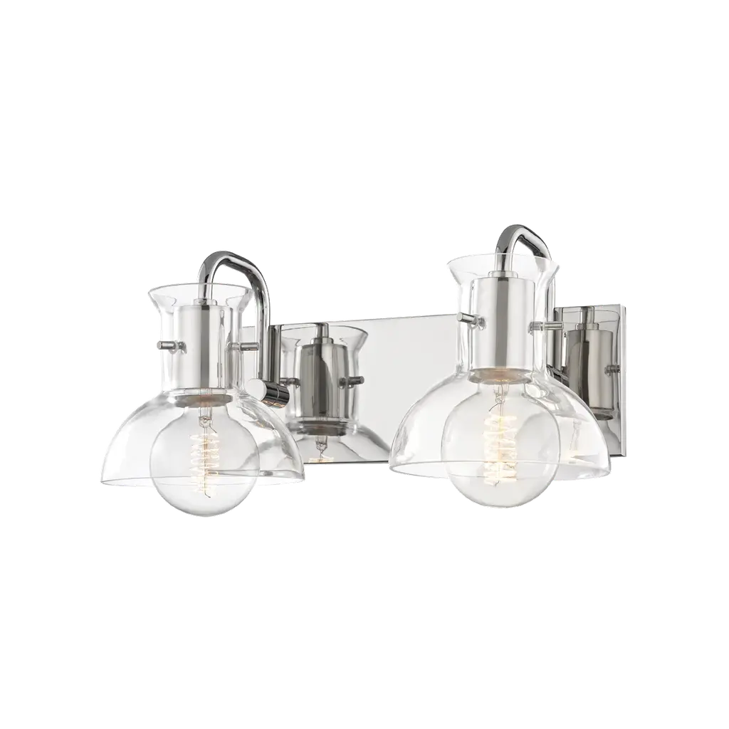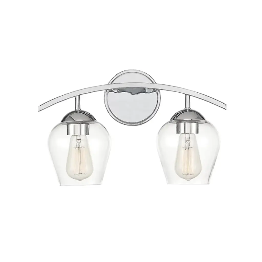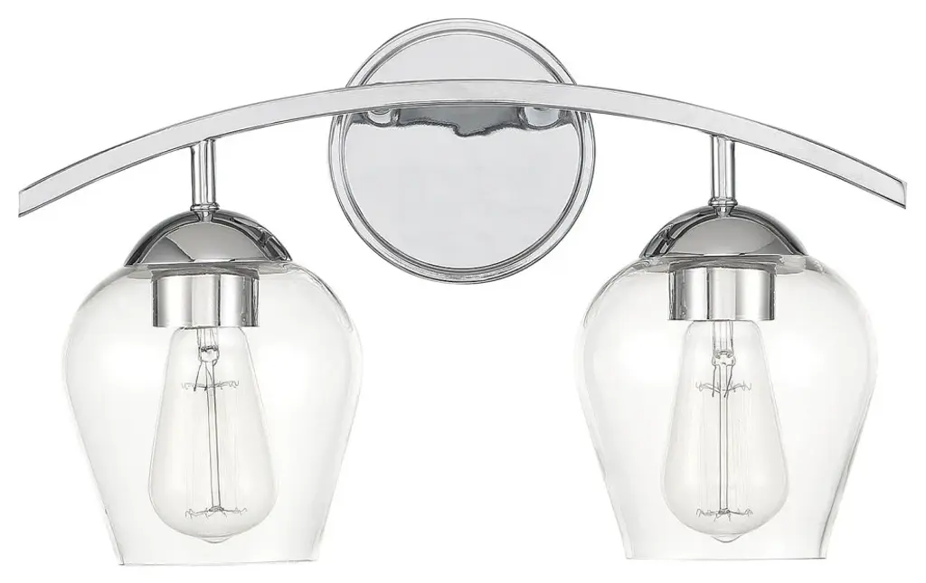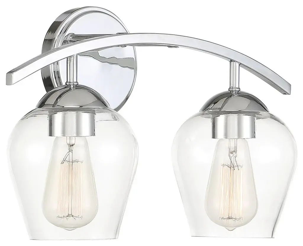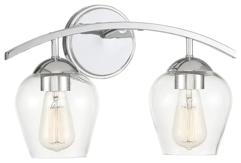 Shape up your bath lighting style with this 2-light bathroom vanity light from Meridian! Between the curving arm, the wineglass-style clear glass shades and the circular backplate, it''s the perfect way to brighten your bath. Chrome finish. Can be mounted with shades facing up or down.