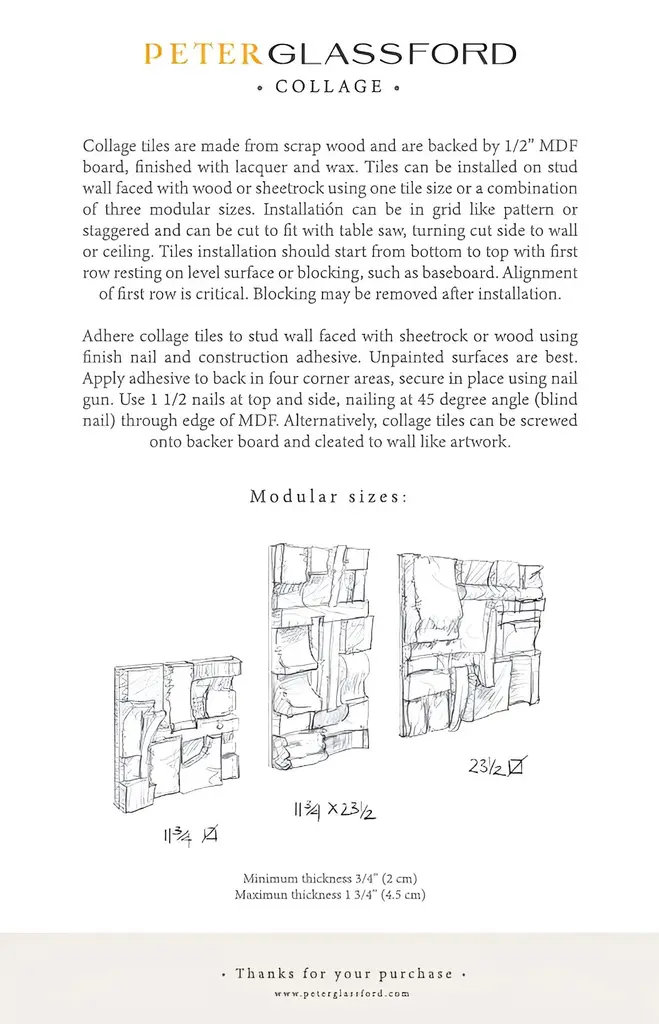The samples measure 10" x 4.5". It includes two samples. No two samples are alike, each is a random collage. The samples are made from recycled wood cuttings from furniture factories and mounted on a 1/2" MDF board, trimmed square, and given a furniture finish with matte lacquer and wax. Please confirm the finish when placing the order. All finishes are available as samples. You can pick two different finishes. - Natural Parota- Satin Black- Matte Black- White Wash- Matte White- Soft Grey- Antique Gold- Charcoal