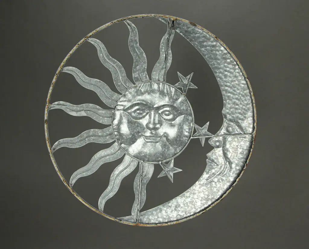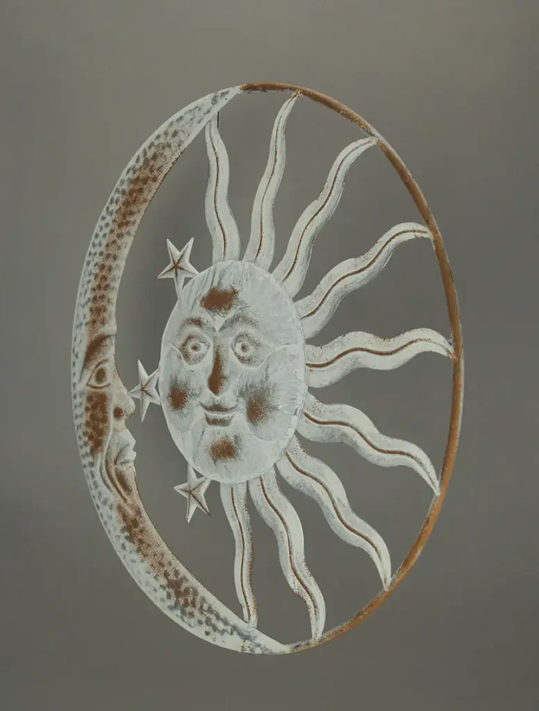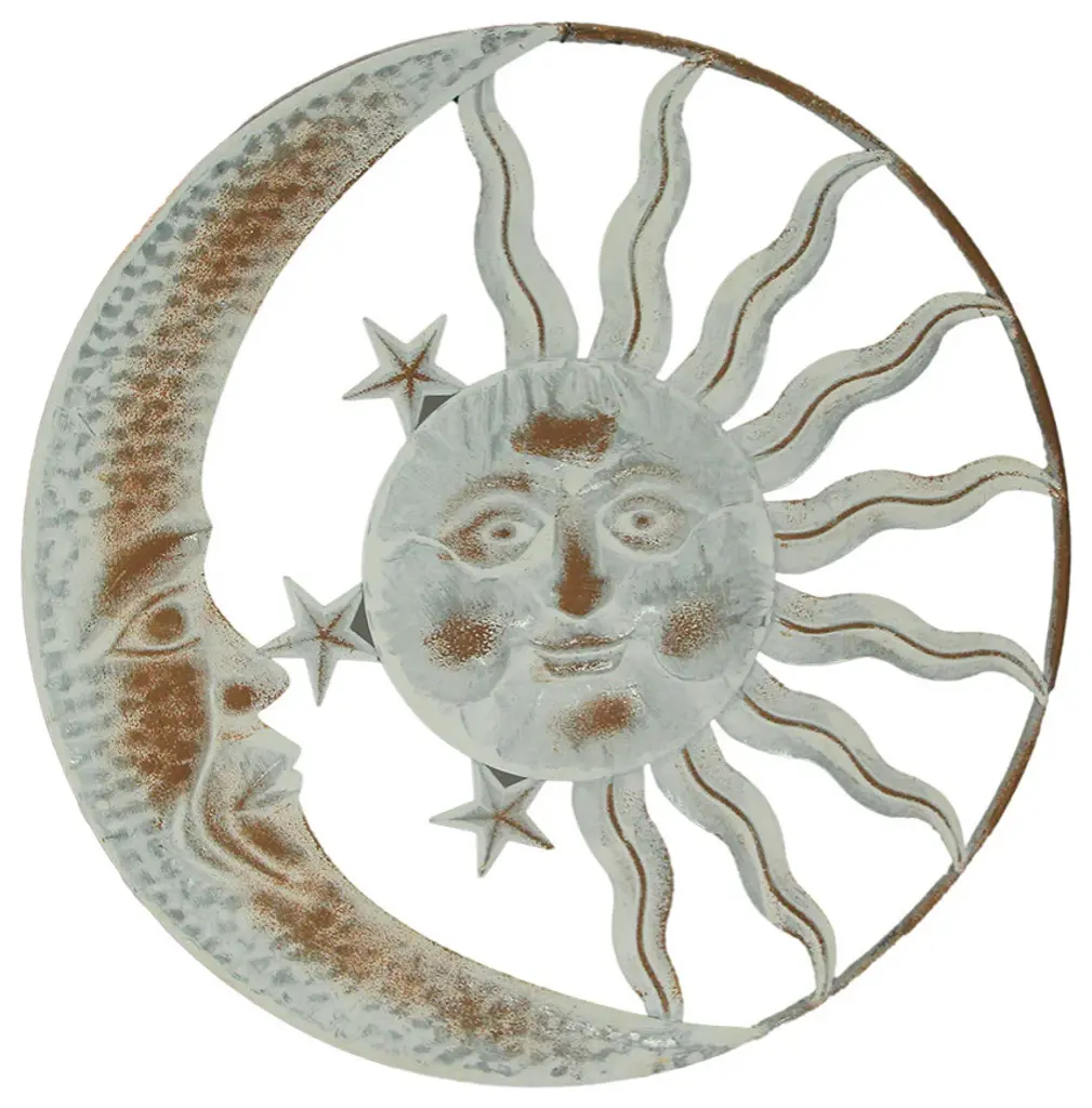 Overall Size - 20 Inches in Diameter, 1 Inch in Depth, showcasing a substantial yet subtle presence on your wall.Durable Craftsmanship - Expertly crafted from metal, this sculpture features intricate detailing, ensuring its longevity while remaining lightweight and easy to handle.Unique Distressed Finish - Each piece is hand-painted in a distressed white hue, complemented by rust accents, giving it a weathered charm that makes every artwork unique.Effortless Hanging - Equipped with a built-in hanger at the top of the rim, allowing for easy mounting using a single screw or hook (not included), simplifying your decor setup.Celestial Charm - The friendly faces of the sun and moon, radiating rustic solar smiles, infuse a warm and welcoming atmosphere into your living room, bedroom, kitchen, or office space.Enhance your living space with celestial charm using this sun and moon wall-hanging sculpture. Expertly crafted from durable metal, these cosmic companions radiate warmth with their friendly smiles. Each piece boasts unique hand-painted distressed white and rust accent finishes, making it a distinctive addition to your decor. The sculpture features a generous 20-inch diameter and comes with a built-in hanger, ensuring effortless mounting in your living room, bedroom, kitchen, or office. This decorative accent creates an inviting atmosphere, capturing the rustic allure of farmhouse aesthetics while adding a touch of celestial magic to any room. Whether you''re aiming to transform your indoor space or enhance your outdoor decor, this sun and moon sculpture brings a sense of harmony and elegance. Its artistic design and attention to detail make it a standout centerpiece, evoking a sense of wonder and tranquility. Let the sun and moon illuminate your home with their gentle presence, creating a cozy ambiance that complements your unique style.