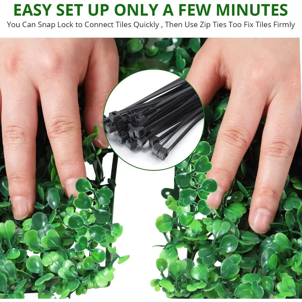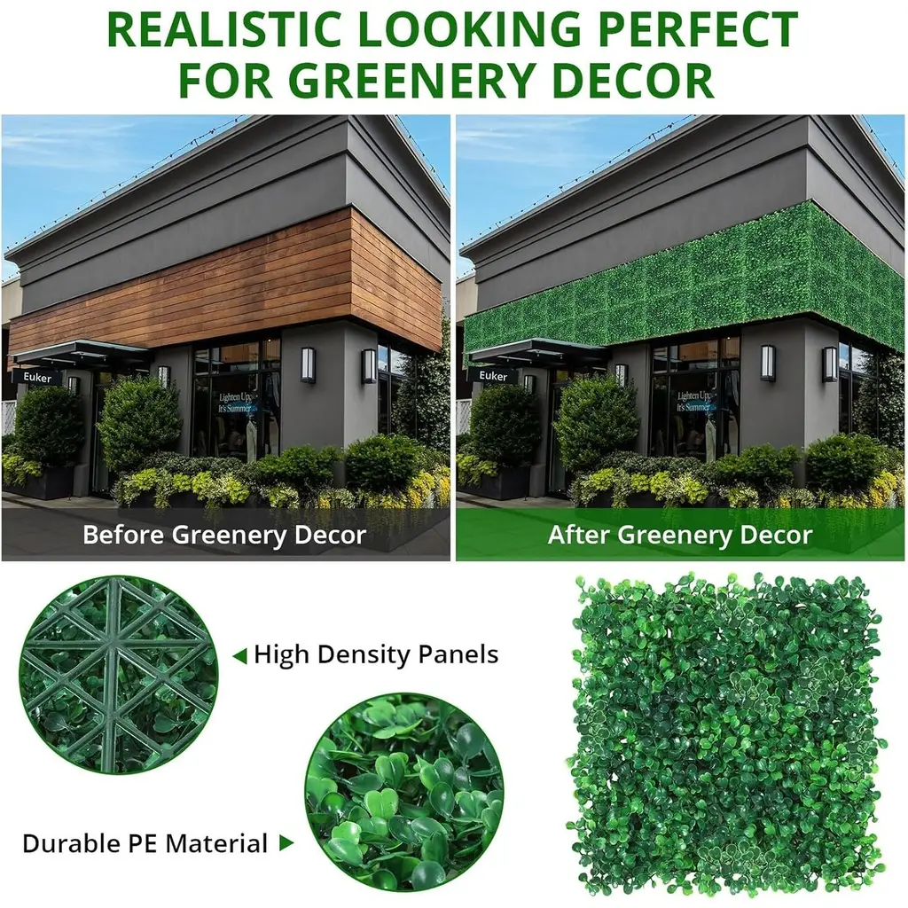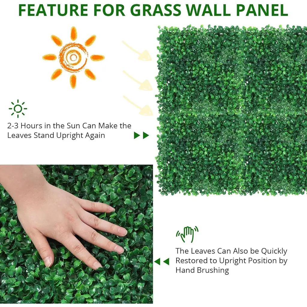 【Realistic Grass Wall】Our artificial grass wall panels include 12/24 panels, each measuring 20*20 inches, with 100 dense and realistic fake leaves. These leaves have been upgraded with 4 layers, 1.2 in high, resulting in a lusher appearance. Despite their small size, the grass wall panels offer great flexibility for decoration, creating a vibrant atmosphere to uplift your mood.【Long-Lasting Beauty Flower Wall 】 Made from new PE material, our artificial grass wall panels stay vibrant for up to 5-7 years outside, 8-10 years indoors without fading or withering. Flame-retardant and odor-free, they seamlessly blend with your surroundings. and safe for all the elderly, children and pets !【Easy DIY Installation】With interlocking connectors and a porous base, easy and flexible installation is allowed for our artificial boxwood panels on wood frames, chain link fences, or backdrop walls. Your space will be effortlessly enhanced, both indoors and outdoors, as the aesthetics of walls, roofs, fences, balconies, gardens and backyards are elevated.【Green Indoor & Outdoor】 Add beauty to balcony ,fence,garden ,patio,pool . backyards while creating privacy from neighbors. Brighten up an area in living room bedroom ,bathroom ,office and backdropwall , make the room pop. Creative a unique green design for birthday ,baby shower ,wedding ,party and seasonal decorations. 【Protect Your Privacy】 Struggling with the fact that people passing by outside can casually see the private activities of your family in the courtyard? Our dense grass wall backdrops are perfect for protecting your privacy on the perimeter of your patio fence while enhancing the aesthetics of your exterior walls.