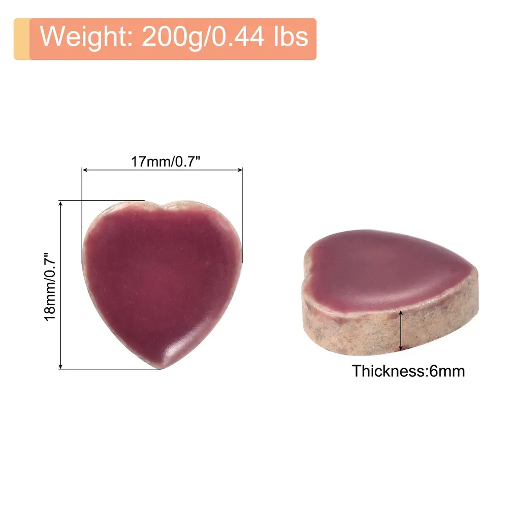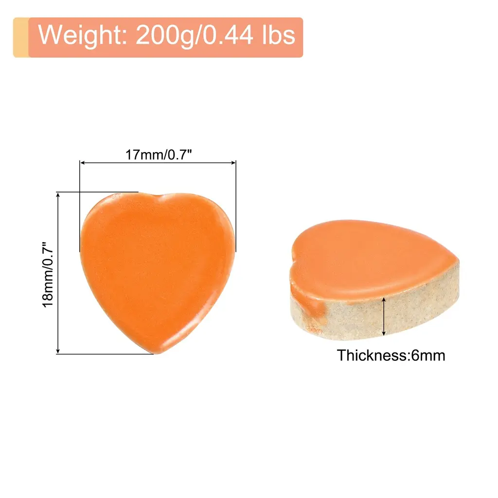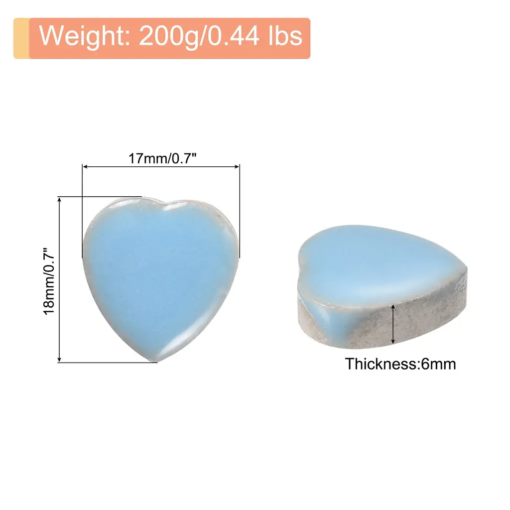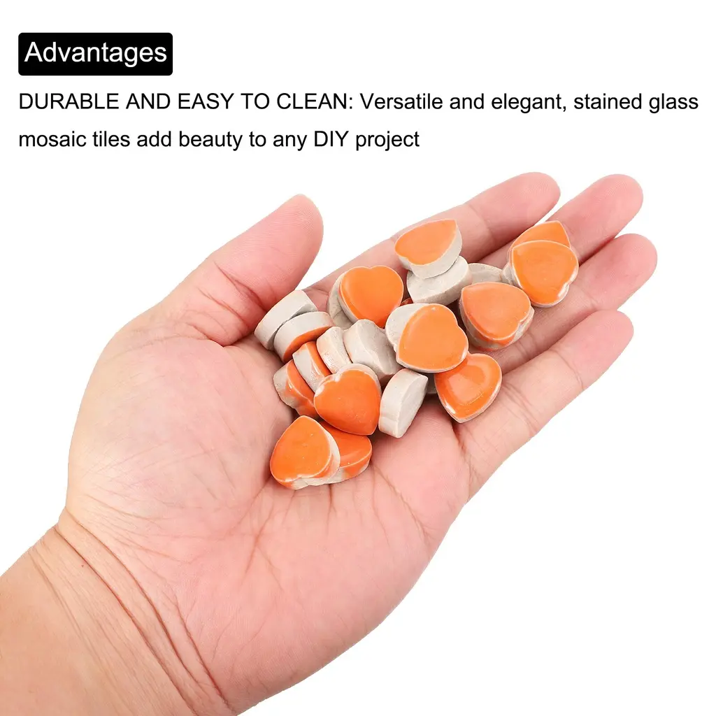 What is this?This product is a set of glazed mosaic tiles made of ceramic. These tiles have a smooth surface and come in vibrant colors, making them perfect for various craft projects. DIY mosaic Christmas arts and crafts, creating coasters, ceramic artwork, or outdoor decorations like mosaic stepping stones.What will I get?In the package of: 1 Set ceramic mosaic tiles,200g/Set, totally 200g( 0.44lbs)Material: Ceramic;Color: Orange;Shape: Heart;Size: 18 x 17mm / 0.7inch x 0.7inch (LxW)Thickness: 6mm;Finish Type: PolishedAre there any advantages of the product?The ceramic mosaic tile is made of premium-quality ceramic, ensuring durability and longevity. The smooth surface allows for easy application and provides a polished finish to your crafts and also makes them easy to clean and maintain, while their resistance to fading and moisture-proof makes them cost-effective and durable.How to use it?Prepare the surface by ensuring it's clean, dry, and flat. Apply suitable adhesive and press the mosaic tiles firmly in place. Leave the adhesive to dry for 24 hours before grouting the mosaic tiles. Finally, clean off any excess grout with a damp sponge.What should I notice?Handle the ceramic mosaic tiles with care to avoid any breakage from edges. Use adhesive suitable for ceramic materials to secure the tiles onto the desired surface. Consider grouting the gaps between tiles for a more finished and professional appearance.