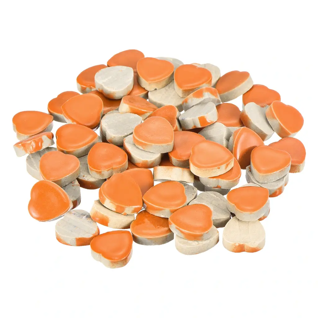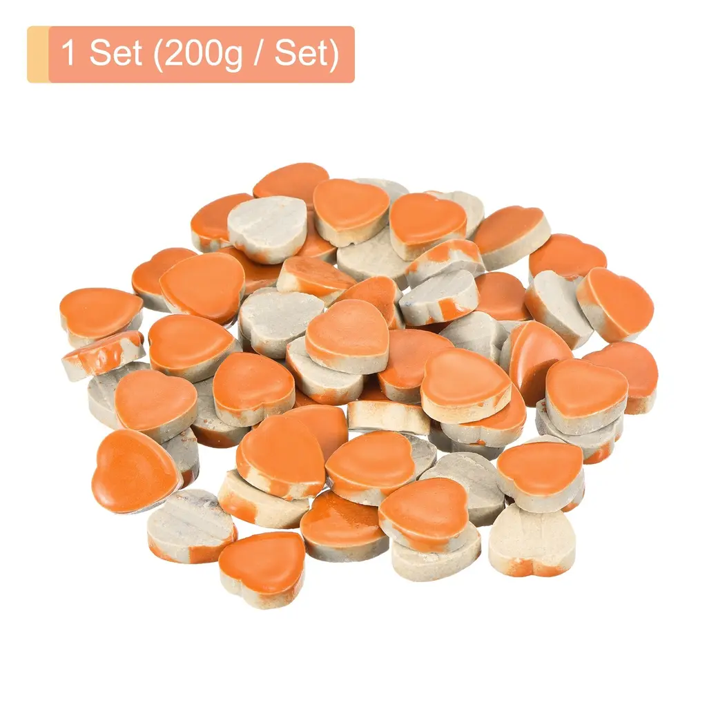 What is this?This product is a set of glazed mosaic tiles made of ceramic. These tiles have a smooth surface and come in vibrant colors, making them perfect for various craft projects. DIY mosaic Christmas arts and crafts, creating coasters, ceramic artwork, or outdoor decorations like mosaic stepping stones.What will I get?In the package of: 1 Set ceramic mosaic tiles,200g/Set, totally 200g( 0.44lbs)Material: Ceramic;Color: Orange;Shape: Heart;Size: 18 x 17mm / 0.7inch x 0.7inch (LxW)Thickness: 6mm;Finish Type: PolishedAre there any advantages of the product?The ceramic mosaic tile is made of premium-quality ceramic, ensuring durability and longevity. The smooth surface allows for easy application and provides a polished finish to your crafts and also makes them easy to clean and maintain, while their resistance to fading and moisture-proof makes them cost-effective and durable.How to use it?Prepare the surface by ensuring it's clean, dry, and flat. Apply suitable adhesive and press the mosaic tiles firmly in place. Leave the adhesive to dry for 24 hours before grouting the mosaic tiles. Finally, clean off any excess grout with a damp sponge.What should I notice?Handle the ceramic mosaic tiles with care to avoid any breakage from edges. Use adhesive suitable for ceramic materials to secure the tiles onto the desired surface. Consider grouting the gaps between tiles for a more finished and professional appearance.