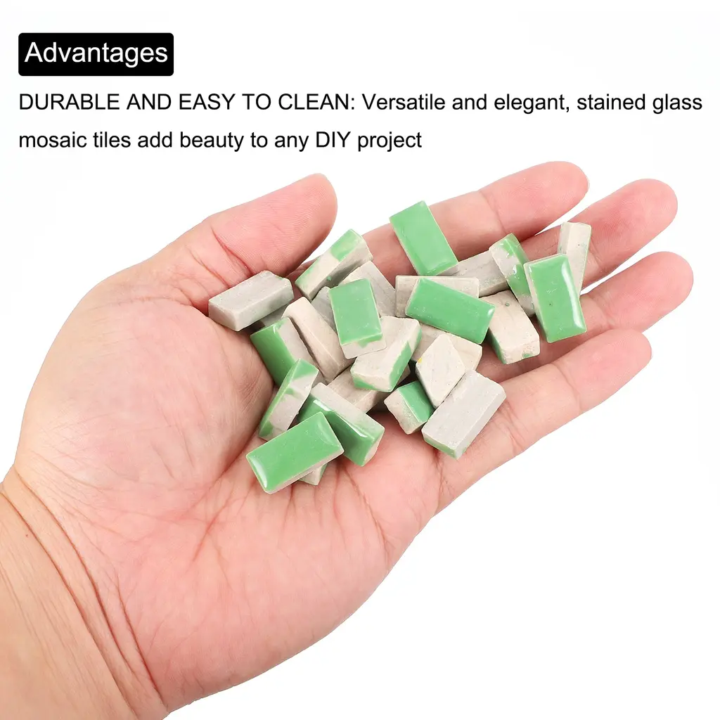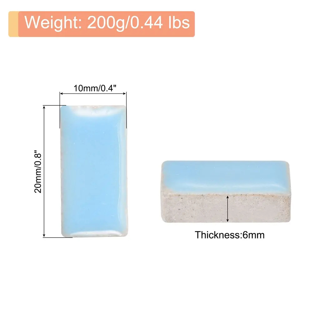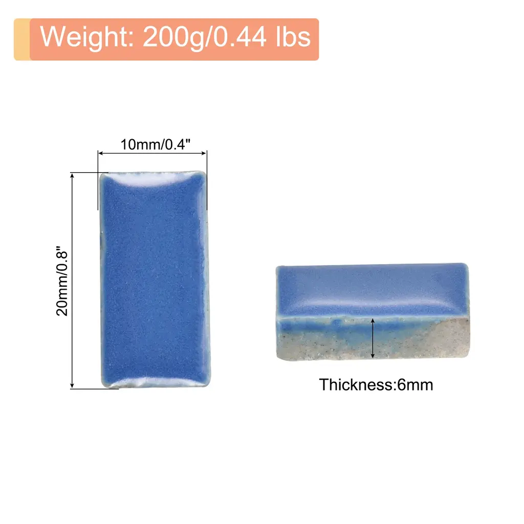 What is this?This product is a set of glazed mosaic tiles made of ceramic. These tiles have a smooth surface and come in vibrant colors, making them perfect for various craft projects. DIY mosaic Christmas arts and crafts, creating coasters, ceramic artwork, or outdoor decorations like mosaic stepping stones.What will I get?In the package of: 1 Set ceramic mosaic tiles,200g/Set, totally 200g( 0.44lbs)Material: Ceramic;Color: White;Shape: Rectangle;Size: 20 x 10mm / 0.8inch x 0.4inch(LxW)Thickness: 6mm;Finish Type: PolishedAre there any advantages of the product?The ceramic mosaic tile is made of premium-quality ceramic, ensuring durability and longevity. The smooth surface allows for easy application and provides a polished finish to your crafts and also makes them easy to clean and maintain, while their resistance to fading and moisture-proof makes them cost-effective and durable.How to use it?Prepare the surface by ensuring it's clean, dry, and flat. Apply suitable adhesive and press the mosaic tiles firmly in place. Leave the adhesive to dry for 24 hours before grouting the mosaic tiles. Finally, clean off any excess grout with a damp sponge.What should I notice?Handle the ceramic mosaic tiles with care to avoid any breakage from edges. Use adhesive suitable for ceramic materials to secure the tiles onto the desired surface. Consider grouting the gaps between tiles for a more finished and professional appearance.