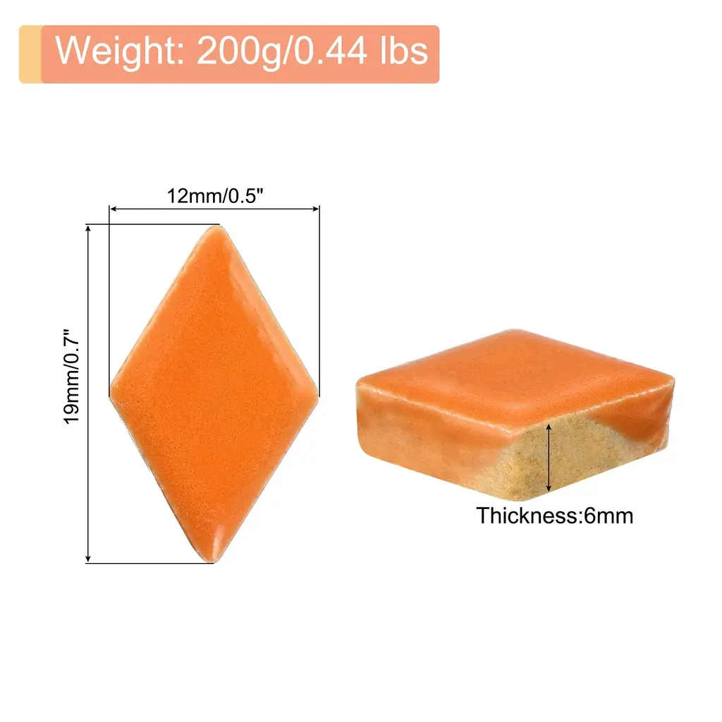 What is this?This product is a set of glazed mosaic tiles made of ceramic. These tiles have a smooth surface and come in vibrant colors, making them perfect for various craft projects. DIY mosaic Christmas arts and crafts, creating coasters, ceramic artwork, or outdoor decorations like mosaic stepping stones.What will I get?In the package of: 1 Set ceramic mosaic tiles,200g/Set, totally 200g( 0.44lbs)Material: Ceramic;Color: White;Shape: Rhombic;Size: 19 x 12mm / 0.7inch x 0.5inch(LxW)Thickness: 6mm;Finish Type: PolishedAre there any advantages of the product?The ceramic mosaic tile is made of premium-quality ceramic, ensuring durability and longevity. The smooth surface allows for easy application and provides a polished finish to your crafts and also makes them easy to clean and maintain, while their resistance to fading and moisture-proof makes them cost-effective and durable.How to use it?Prepare the surface by ensuring it's clean, dry, and flat. Apply suitable adhesive and press the mosaic tiles firmly in place. Leave the adhesive to dry for 24 hours before grouting the mosaic tiles. Finally, clean off any excess grout with a damp sponge.What should I notice?Handle the ceramic mosaic tiles with care to avoid any breakage from edges. Use adhesive suitable for ceramic materials to secure the tiles onto the desired surface. Consider grouting the gaps between tiles for a more finished and professional appearance.