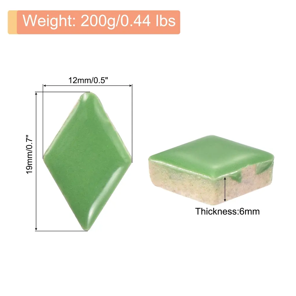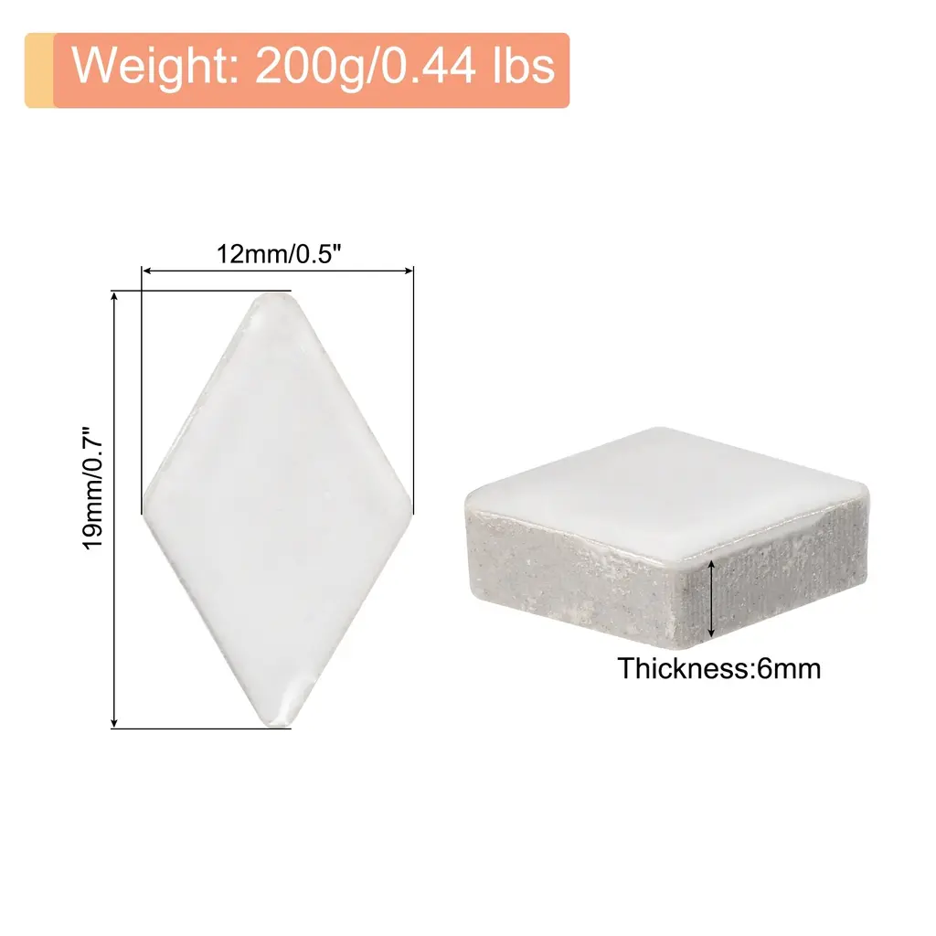 What is this?This product is a set of glazed mosaic tiles made of ceramic. These tiles have a smooth surface and come in vibrant colors, making them perfect for various craft projects. DIY mosaic Christmas arts and crafts, creating coasters, ceramic artwork, or outdoor decorations like mosaic stepping stones.What will I get?In the package of: 1 Set ceramic mosaic tiles,200g/Set, totally 200g( 0.44lbs)Material: Ceramic;Color: White;Shape: Rhombic;Size: 19 x 12mm / 0.7inch x 0.5inch(LxW)Thickness: 6mm;Finish Type: PolishedAre there any advantages of the product?The ceramic mosaic tile is made of premium-quality ceramic, ensuring durability and longevity. The smooth surface allows for easy application and provides a polished finish to your crafts and also makes them easy to clean and maintain, while their resistance to fading and moisture-proof makes them cost-effective and durable.How to use it?Prepare the surface by ensuring it's clean, dry, and flat. Apply suitable adhesive and press the mosaic tiles firmly in place. Leave the adhesive to dry for 24 hours before grouting the mosaic tiles. Finally, clean off any excess grout with a damp sponge.What should I notice?Handle the ceramic mosaic tiles with care to avoid any breakage from edges. Use adhesive suitable for ceramic materials to secure the tiles onto the desired surface. Consider grouting the gaps between tiles for a more finished and professional appearance.