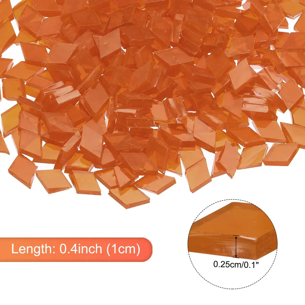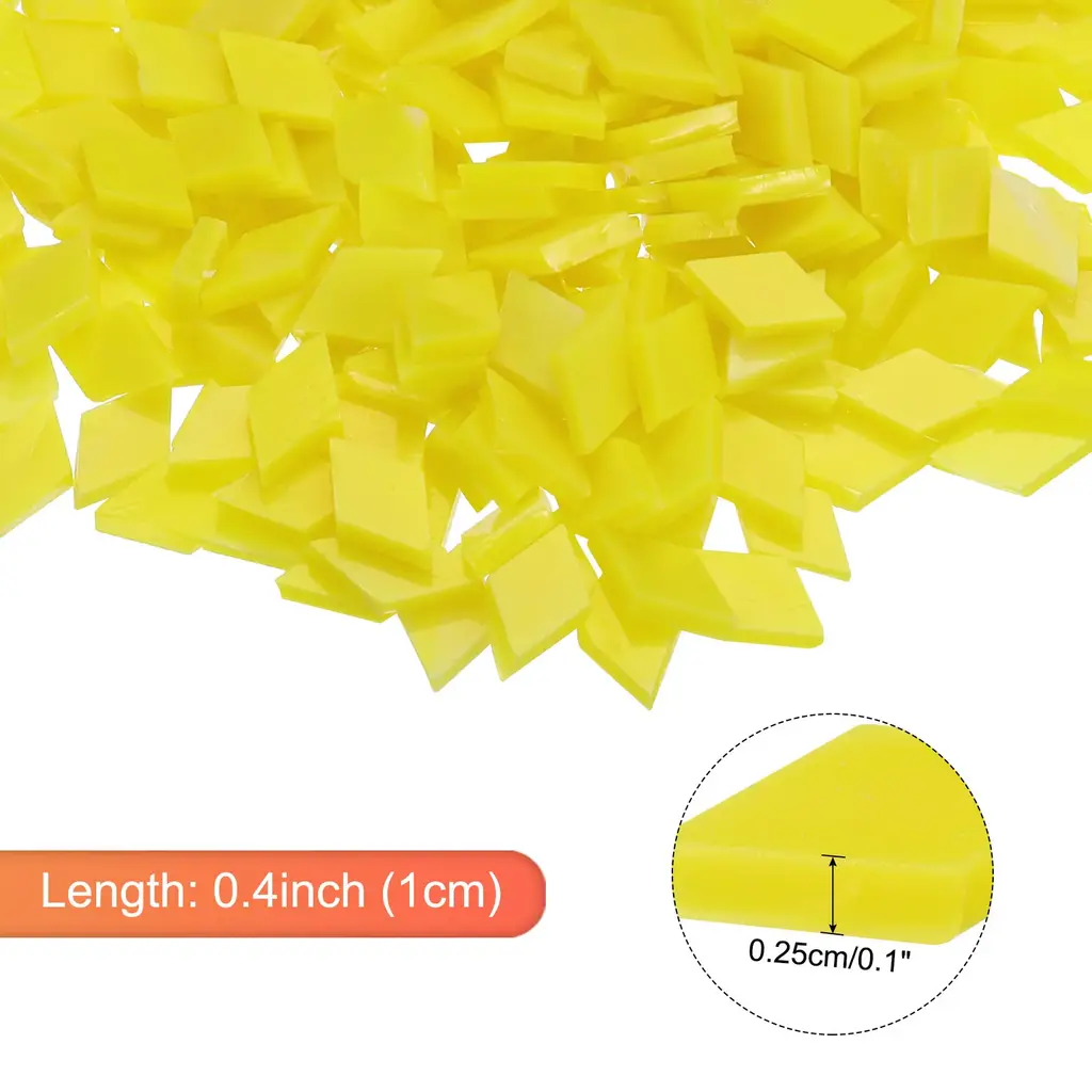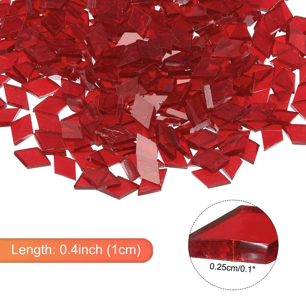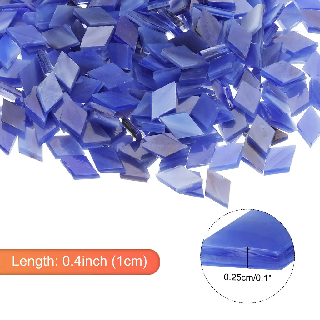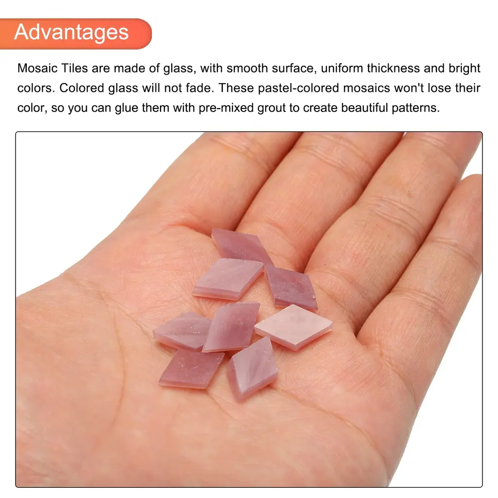 What is this?The mosaic tiles have a great variety of colors and shapes. And have a wide range of applications, you can inlay them on decorative walls, handmade boards, photo frames, mugs, flower pots and more DIY items, can be used as stepping stones, ceramics Portfolio, class project, artwork, tailgate, or other project. You can create different patterns according to the needs of your craft projects. Mosaic tiles for crafts are also useful for specific projects. You can enjoy the mosaic glass pieces with your friends and family. You can also use broken tiles to create a mosaic to create a unique gift for someone else.What will I get?Package contains: 1 set x Mosaic Tiles (200g, about 360 pieces);Color: Light Purple;Length x Thickness: 0.4x0.1inch (1x0.25cm);Material: Glass;Is there any advantages of the product?Mosaic Tiles are made of glass, with smooth surface, uniform thickness and bright colors. Colored glass will not fade. These pastel-colored mosaics won't lose their color, so you can glue them with pre-mixed grout to create beautiful patterns. Mosaic glass pieces are not limited by your imagination.How to use it?Mosaic glass pieces are easy to use and can be applied with glue or with caulk, and you can easily separate the mosaic tiles into smaller pieces if needed;What should I notice?We recommend wearing gloves when using, please contact us if you have any issues with our mosaic supplies;