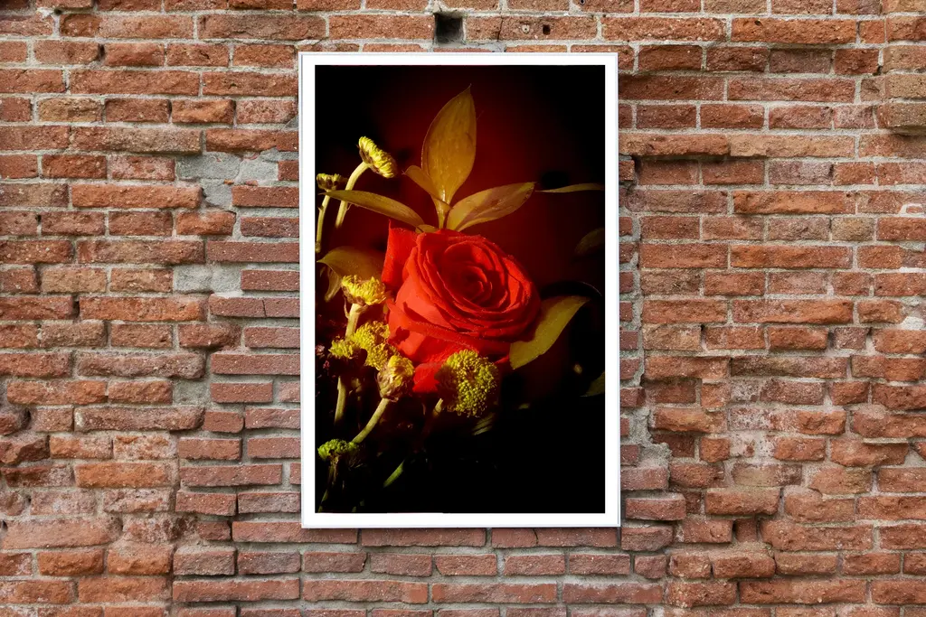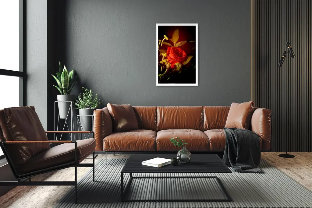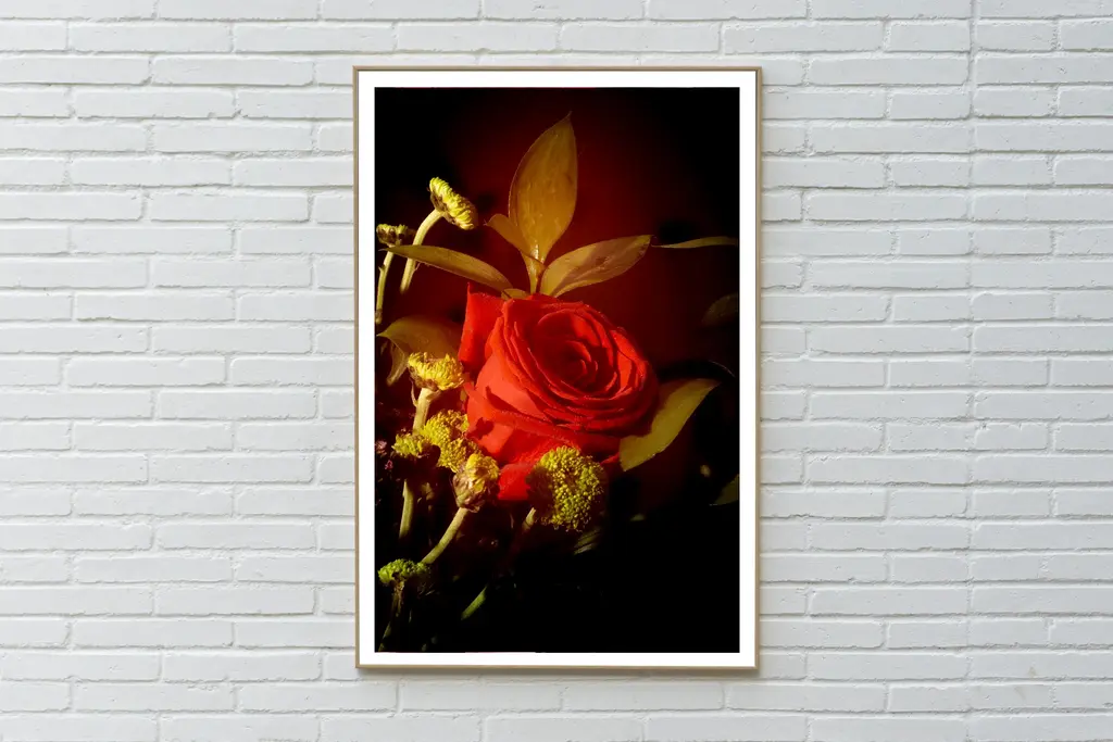 This is an exclusive limited edition color Giclée print, printed on matte photographic paper. This exquisite still-life photo shows a classy bouquet beautifully lit with soft light. The print measures 36 x 24 inches total, with an image size of 32 x 20 in. and a 2-inch surrounding white border. Details: + Title: Red Rose in Vintage Light + Year: 2021 + Edition Size: 100 + Stamped and Certificate of Authenticity provided + Measurements: 24x36 in. (61x91cm), a standard frame size. + Printed on Satin Fuji Photographic Paper. * Frame is for illustrative purposes only. Artwork is shipped carefully rolled and packaged in a tube.