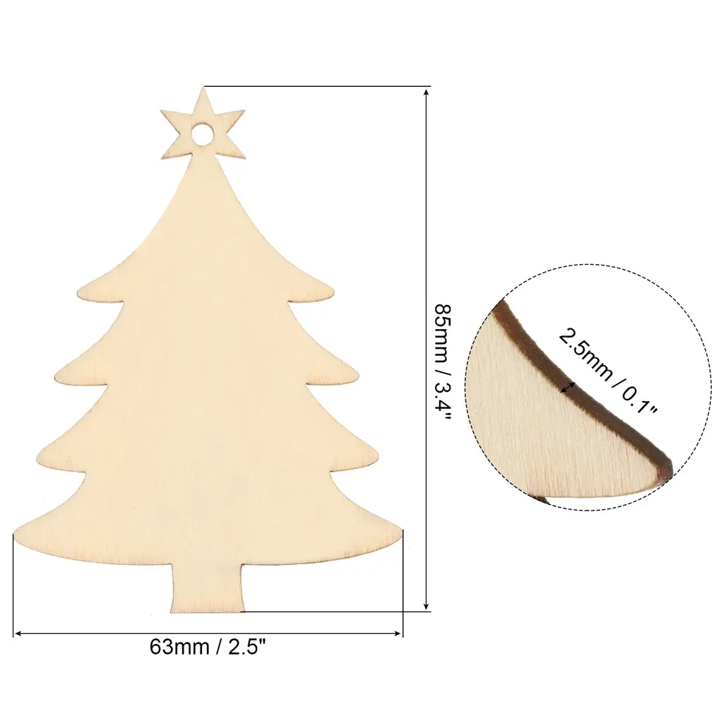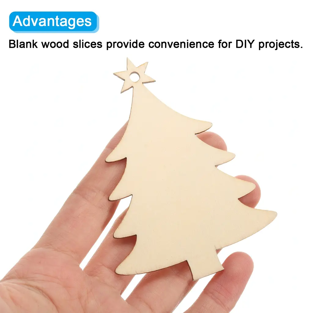 Wood slices are widely used in various handicraft and DIY projects, such as paper-cutting, signage, labels, photo props, home decor, holiday decorations, wedding decorations, etc., adding a natural and rustic element to the space.Specification Color: Natural ColorMaterial: WoodSize: 85x63 mm / 3.4X2.5 inchWidth: 2.5mm / 0.1 inchPacking List: 20Pcs x Wood Embellishments with Jute RopesAdvantageWooden embellishments made from hardwood are smooth, splinter-free, durable, and able to withstand wear and tear, making them suitable for long-term use. They provide convenience for DIY projects and offer a natural, rustic, and simple aesthetic that adds warmth and charm to any project or decor. The included jute twine allows for easy hanging of decorations on Christmas trees, fireplaces, walls, Easter baskets, and other locations.InstructionYou can unleash your imagination and personalize the wood ornament through DIY activities such as painting, writing, gluing, or even wood burning, creating your unique decorations.NOTE: Please store wood slices in a dry and cool place.