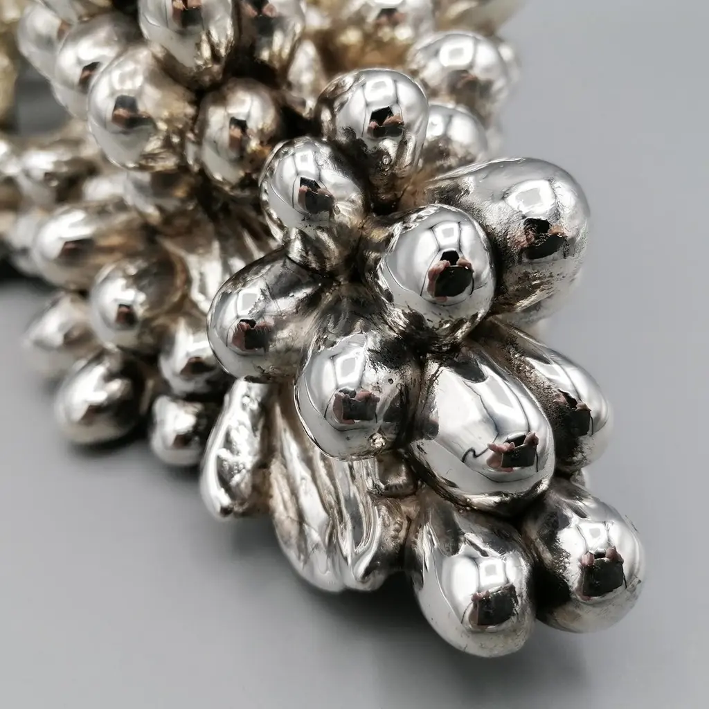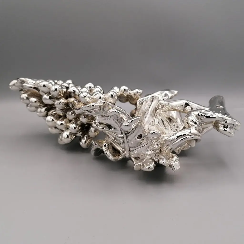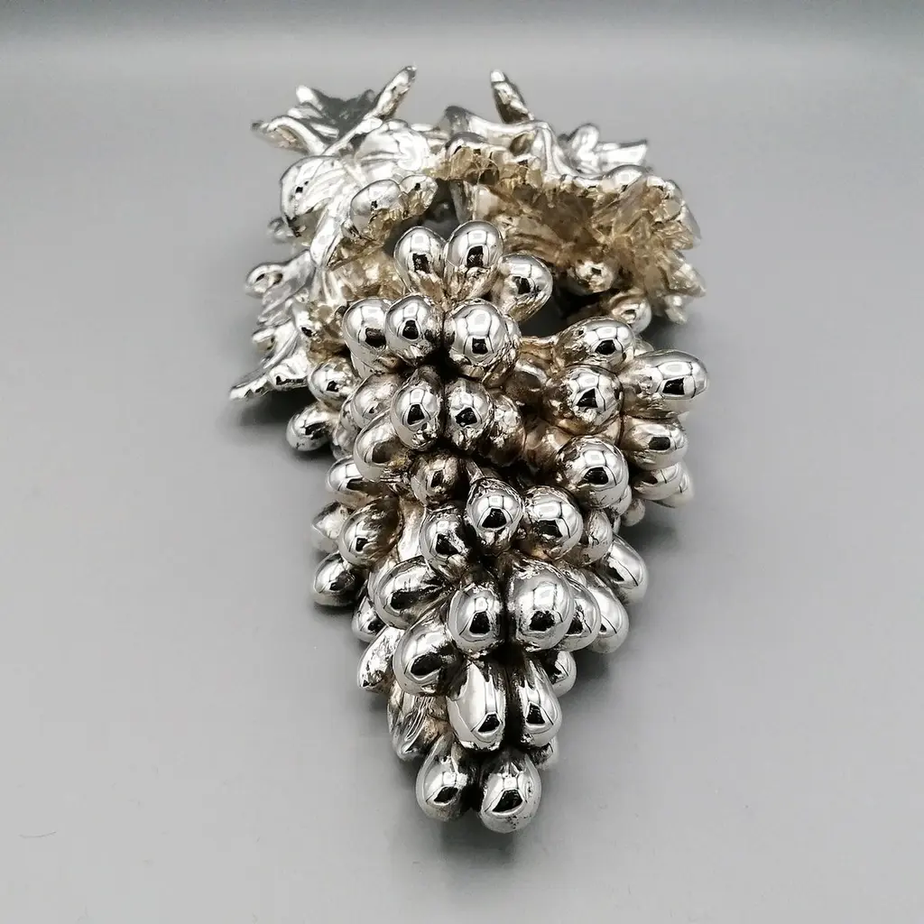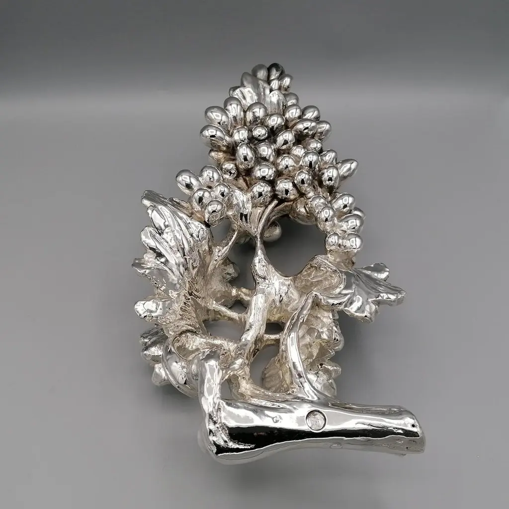 Italy, a country that produces great wines and an ancient agricultural tradition, could not fail to dedicate its art also to create prestigious objects concerning this excellence for example this pure 990 silver bunch of grapes made with the "lost wax casting" technique.This ornament can be placed on a table or it can be hung on the wall like a painting / sculpture Made by FAF (Fabbrica Argenteria Firenze). Florence - Italyfor ARVAL ARGENTI VALENZA The lost wax casting method is still used in the silverware sector.A reproduction of the object is made of wax. Then the inlet / outlet channels (always in wax) are added and the plaster mold specially designed for this operation is made.To favor the perfect adhesion of the plaster to the waxes and the elimination of air bubbles, the full cylinder can be placed on a vibrating plate and then subjected to the action of vacuum under a bell connected to a pump.This mold (which usually to contain the costs of plaster, contains many objects, arranged in a "cluster" around a central channel) is heated in an oven, so that the wax (for this operation usually takes the oven to 200 ° C) comes out of the channels, once the wax has come out, the molten metal can be poured into the mold. It is important to heat the plaster mold in order to prevent the metal from splashing out of it.After the metal cast inside the mold has solidified, the gypsum is broken and the various objects are separated from the central channel with the aid of a cutter or a goldsmith's hacksaw, the inlet / outlet channels are also eliminated. At this point, the jewels can be finished by polishing or other processes until the final object is obtained.