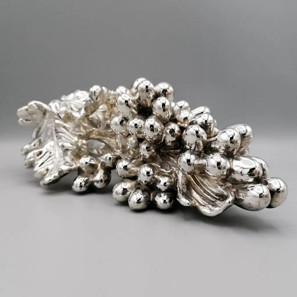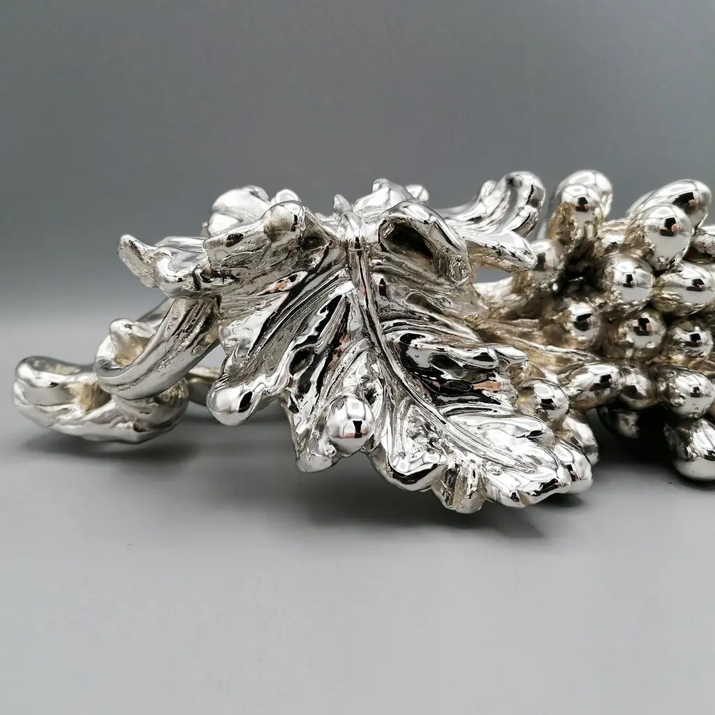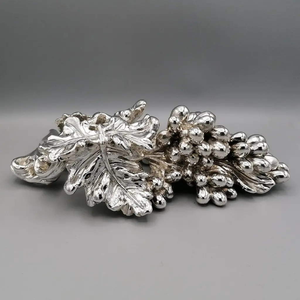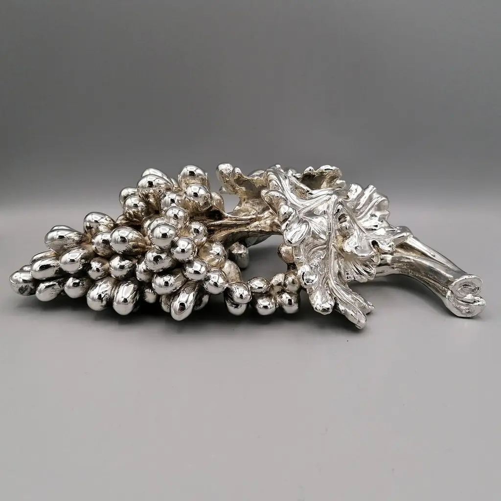 Italy, a country that produces great wines and an ancient agricultural tradition, could not fail to dedicate its art also to create prestigious objects concerning this excellence for example this pure 990 silver bunch of grapes made with the "lost wax casting" technique.This ornament can be placed on a table or it can be hung on the wall like a painting / sculpture Made by FAF (Fabbrica Argenteria Firenze). Florence - Italyfor ARVAL ARGENTI VALENZA The lost wax casting method is still used in the silverware sector.A reproduction of the object is made of wax. Then the inlet / outlet channels (always in wax) are added and the plaster mold specially designed for this operation is made.To favor the perfect adhesion of the plaster to the waxes and the elimination of air bubbles, the full cylinder can be placed on a vibrating plate and then subjected to the action of vacuum under a bell connected to a pump.This mold (which usually to contain the costs of plaster, contains many objects, arranged in a "cluster" around a central channel) is heated in an oven, so that the wax (for this operation usually takes the oven to 200 ° C) comes out of the channels, once the wax has come out, the molten metal can be poured into the mold. It is important to heat the plaster mold in order to prevent the metal from splashing out of it.After the metal cast inside the mold has solidified, the gypsum is broken and the various objects are separated from the central channel with the aid of a cutter or a goldsmith's hacksaw, the inlet / outlet channels are also eliminated. At this point, the jewels can be finished by polishing or other processes until the final object is obtained.