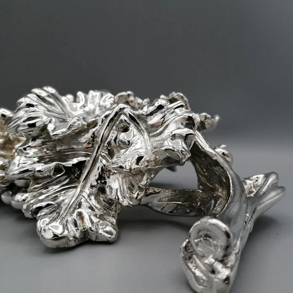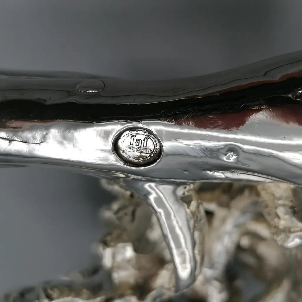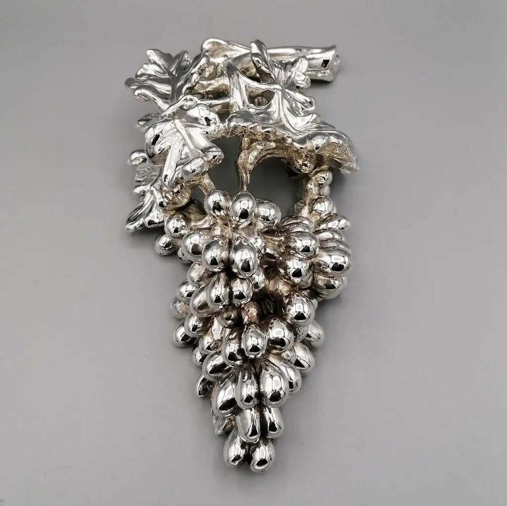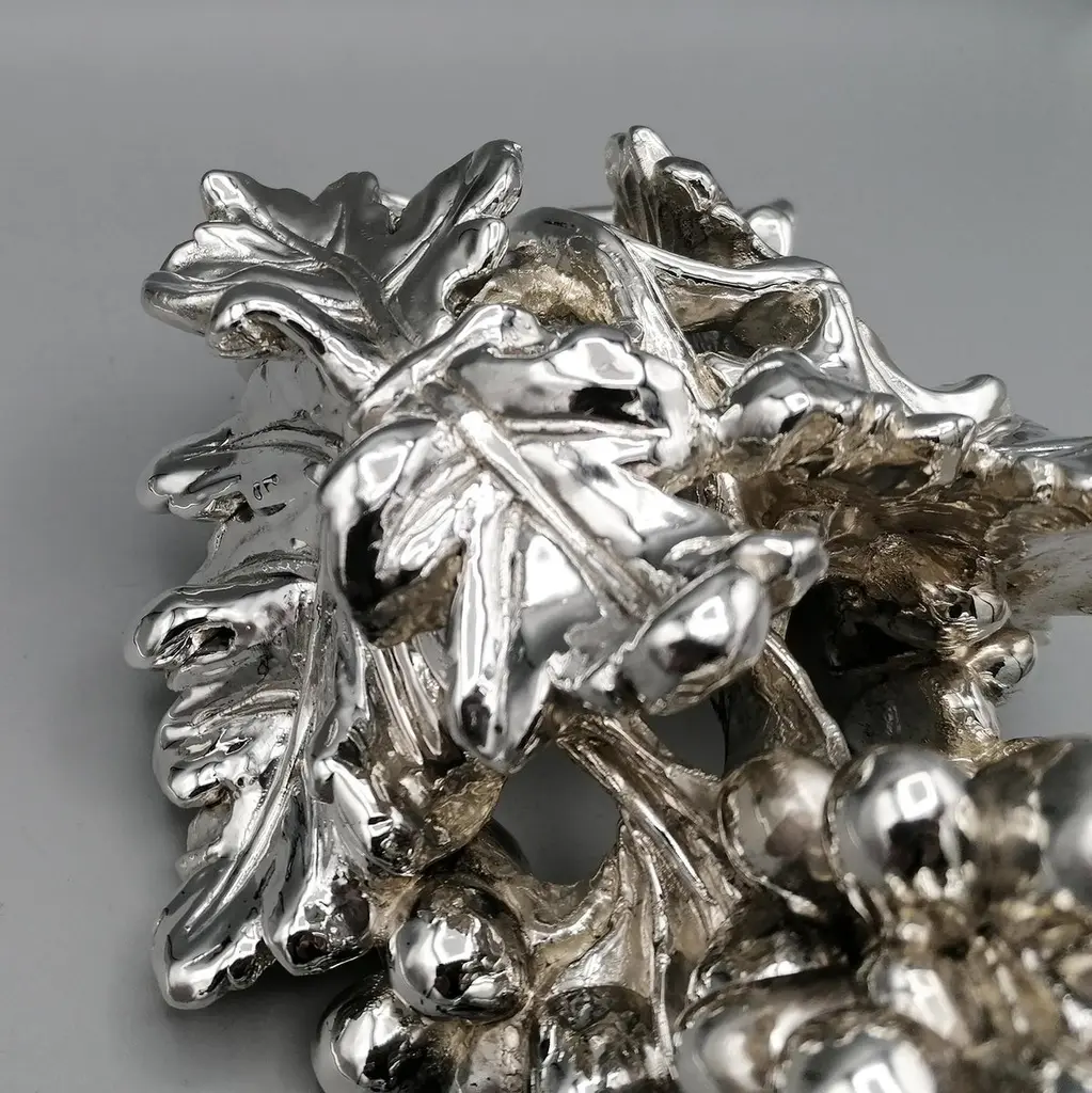 Italy, a country that produces great wines and an ancient agricultural tradition, could not fail to dedicate its art also to create prestigious objects concerning this excellence for example this pure 990 silver bunch of grapes made with the "lost wax casting" technique.This ornament can be placed on a table or it can be hung on the wall like a painting / sculpture Made by FAF (Fabbrica Argenteria Firenze). Florence - Italyfor ARVAL ARGENTI VALENZA The lost wax casting method is still used in the silverware sector.A reproduction of the object is made of wax. Then the inlet / outlet channels (always in wax) are added and the plaster mold specially designed for this operation is made.To favor the perfect adhesion of the plaster to the waxes and the elimination of air bubbles, the full cylinder can be placed on a vibrating plate and then subjected to the action of vacuum under a bell connected to a pump.This mold (which usually to contain the costs of plaster, contains many objects, arranged in a "cluster" around a central channel) is heated in an oven, so that the wax (for this operation usually takes the oven to 200 ° C) comes out of the channels, once the wax has come out, the molten metal can be poured into the mold. It is important to heat the plaster mold in order to prevent the metal from splashing out of it.After the metal cast inside the mold has solidified, the gypsum is broken and the various objects are separated from the central channel with the aid of a cutter or a goldsmith's hacksaw, the inlet / outlet channels are also eliminated. At this point, the jewels can be finished by polishing or other processes until the final object is obtained.