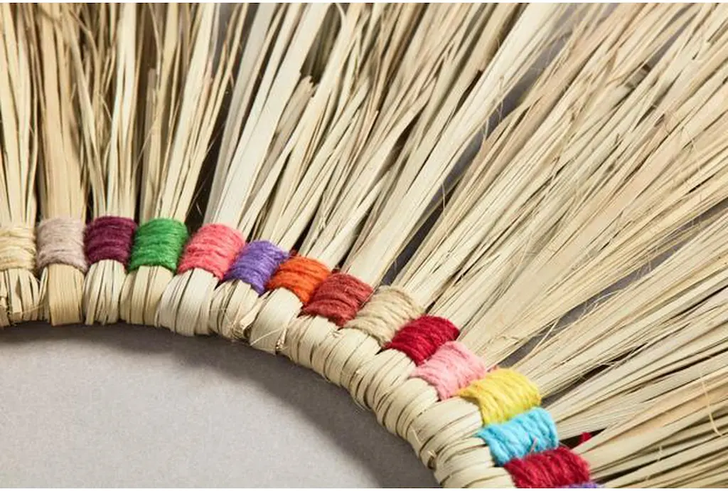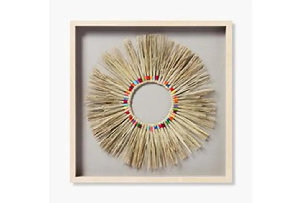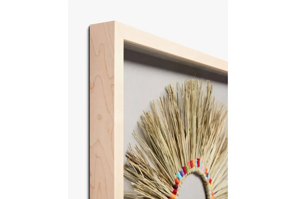 This 20"X20" Rainbow Wreath With Wood Frame is a rustic style decoration made of fabric and wood, featuring a multicolor design with additional straw accents.