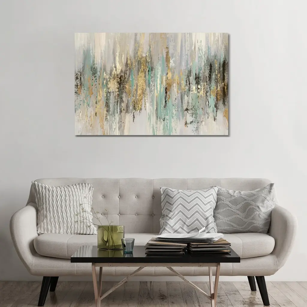 Enhance your modern living space with the 20X24 Jade Horizon Gallery Wrap Canvas. This stunning abstract canvas art features a serene blend of green, gold, and beige colors, perfect for adding a touch of sophistication to any room.